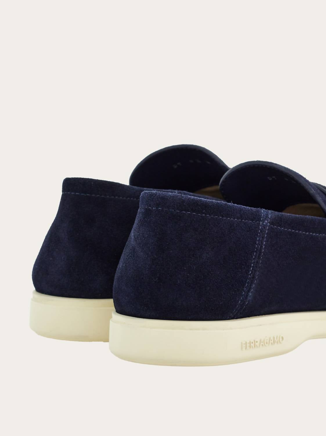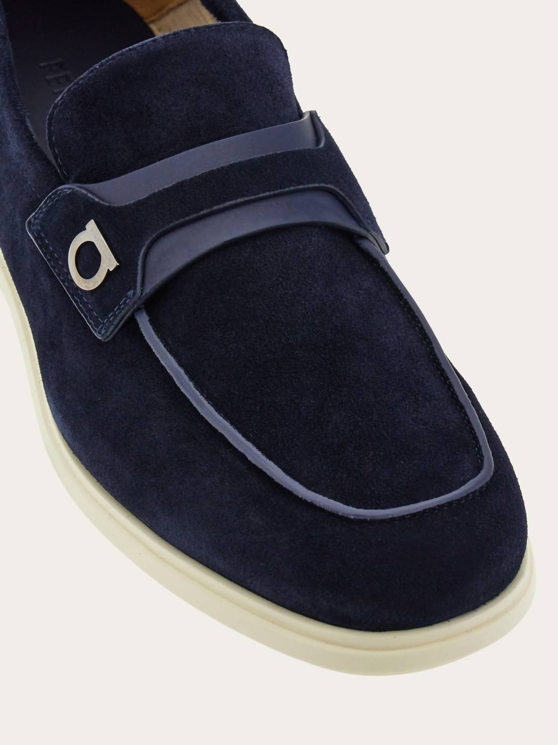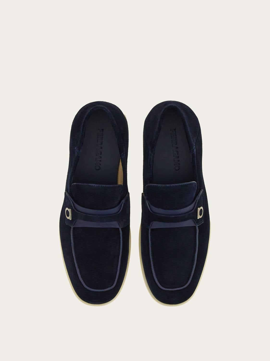 Step into understated elegance with the Men's Deconstructed Loafer With Gancini Ornament by Salvatore Ferragamo, crafted from sumptuous Italian calf suede. This Midnight Blue loafer features a sleek almond toe highlighted with raw-edged piping and a distinctive double crossbar adorned with a titanium-finished Gancini buckle. Made in Italy, it embodies a minimalist trend, perfect for a dinner party or New Year's Eve celebration. Experience comfort with its flexible white rubber sole and flat heel that's designed to effortlessly accentuate any spring ensemble.