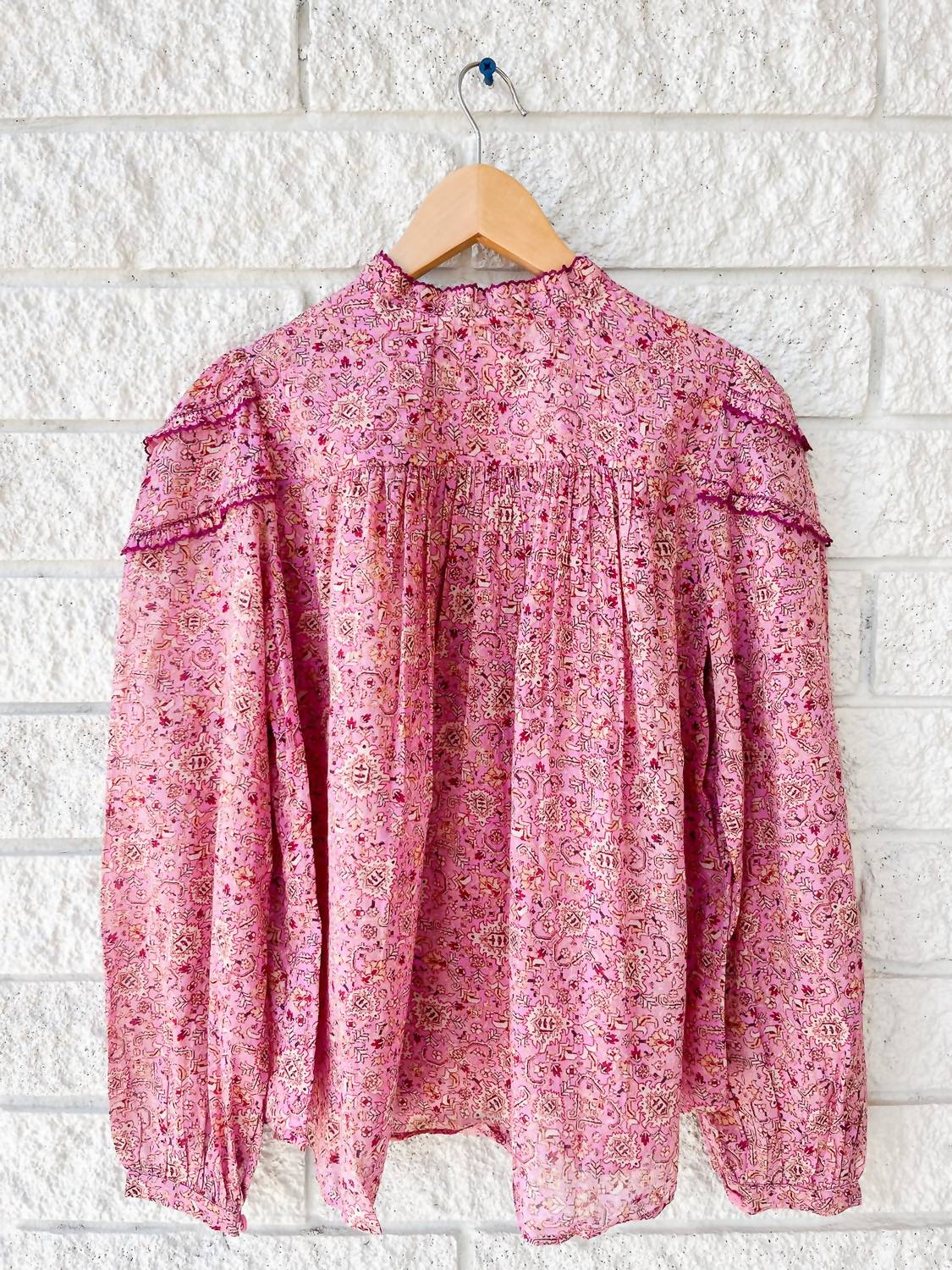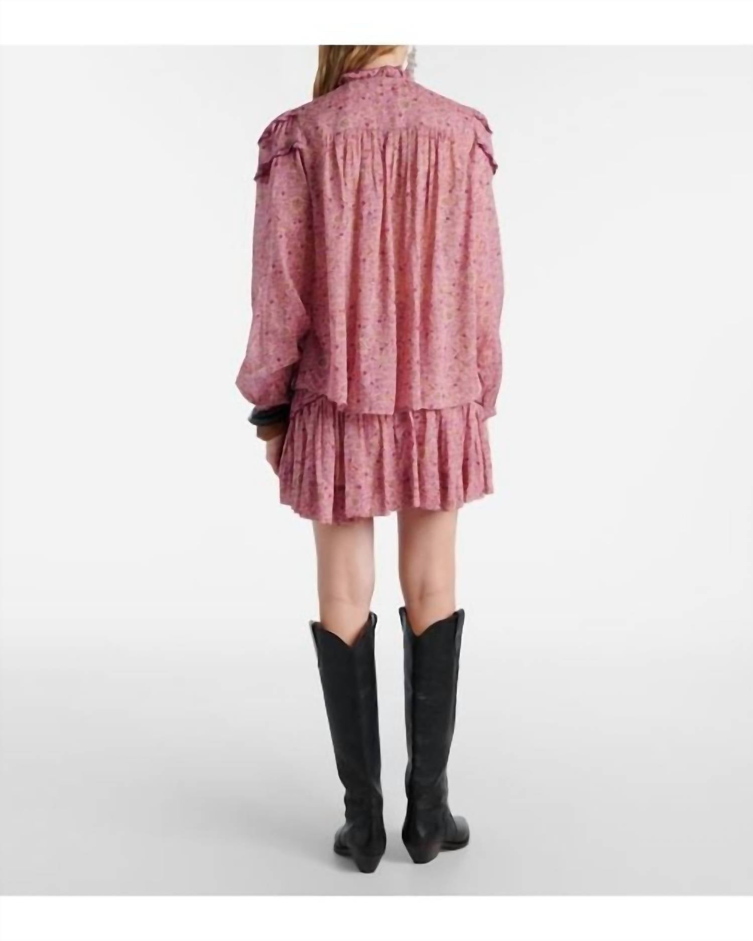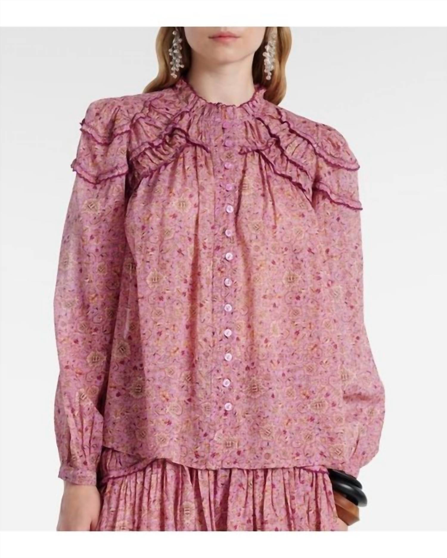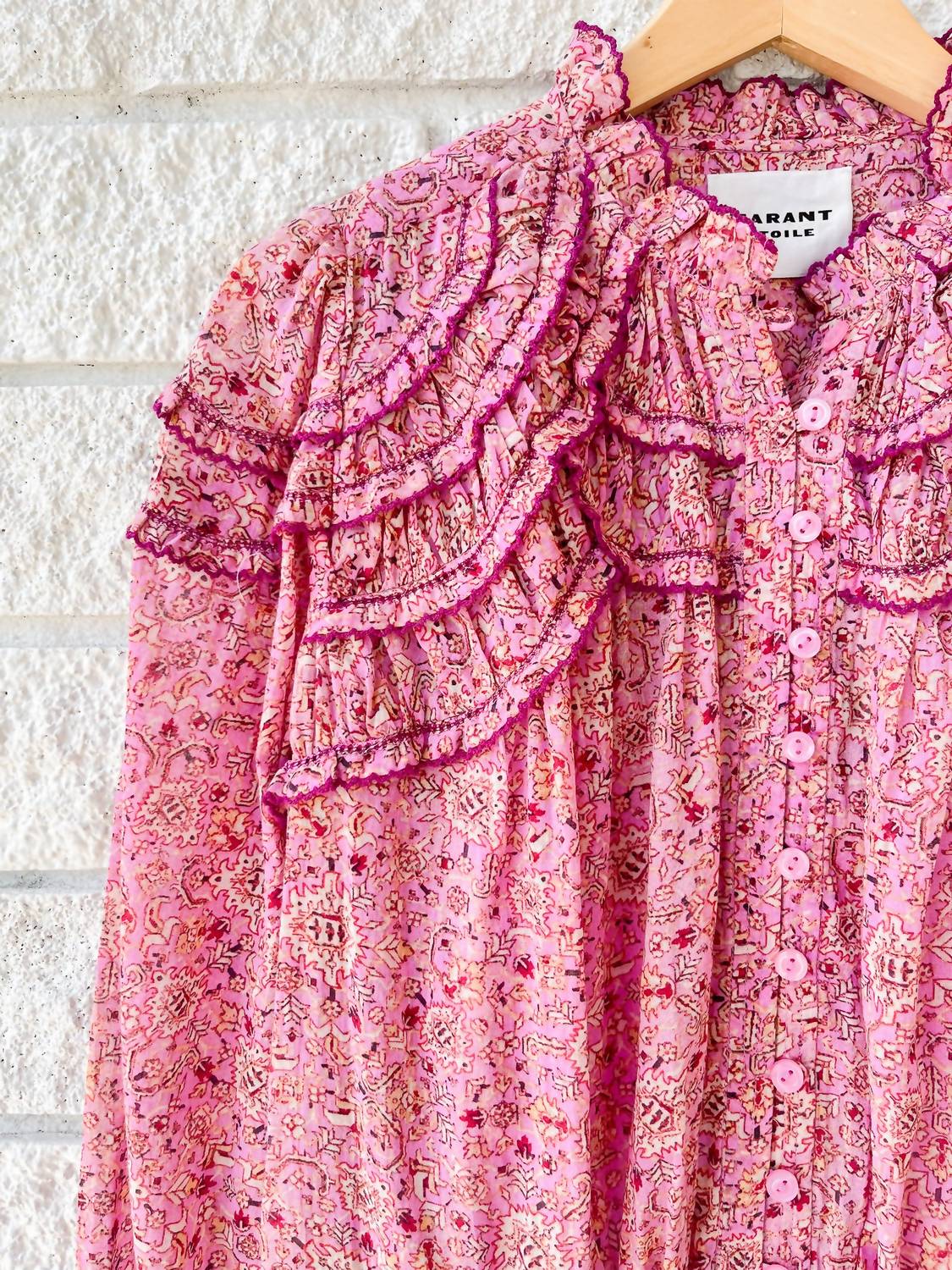 Pair this with your favorite jeans and slides for your next girls night out. Introducing the Christa Printed Ruffled Cotton Blouse by Isabel Marant, a must-have for every boho-chic wardrobe. This floral-patterned blouse in pastel pink features elegant shoulder ruffle detailing and a ruched crew neck, adding a touch of sophistication. Made from 80% organic cotton and 20% viscose, it ensures comfort and style with its long sleeves adorned with cuffs and buttons. Imported and designed specifically for women, this blouse requires dry cleaning to maintain its premium quality.