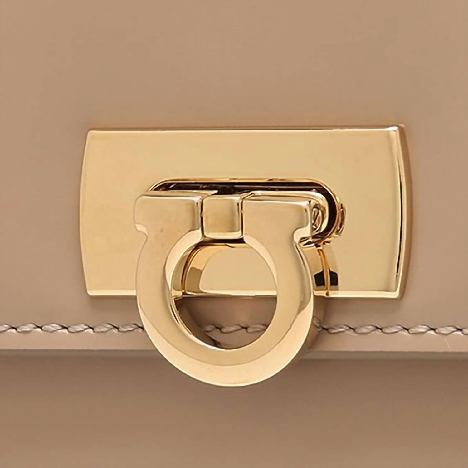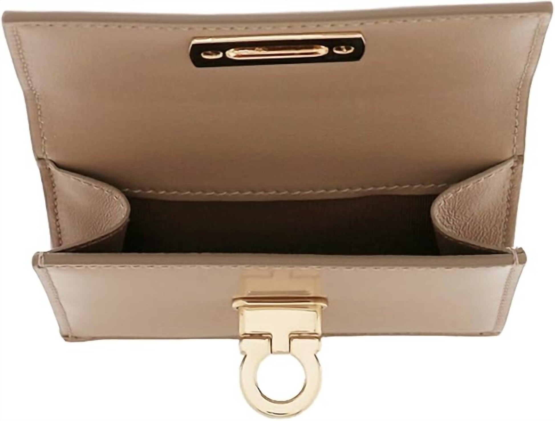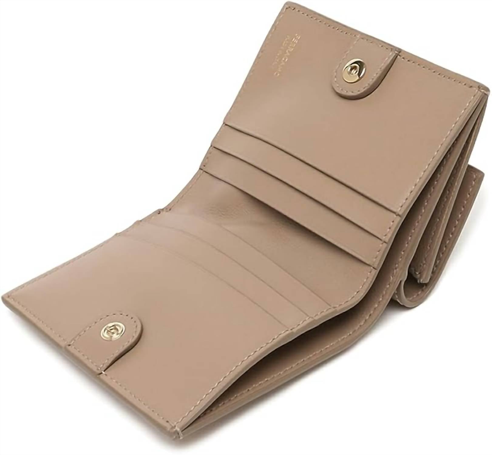 Upgrade your accessories with this chic wallet. Its standout appearance highlights your personal style, while its compartments offer efficient storage for your financial essentials. The Women's Wanda Bi Fold Wallet by Salvatore Ferragamo boasts a luxurious style crafted in elegant beige leather. This wallet features a convenient snap closure and includes a bill compartment, two open pockets, and four card pockets for effortless organization. It measures approximately 4.1 inches in width, 3.3 inches in height, and 1.2 inches in depth, making it a compact yet stylish choice for your everyday essentials. With a lightweight design, it also includes a Kabseelock coin purse, adding to its functional appeal.