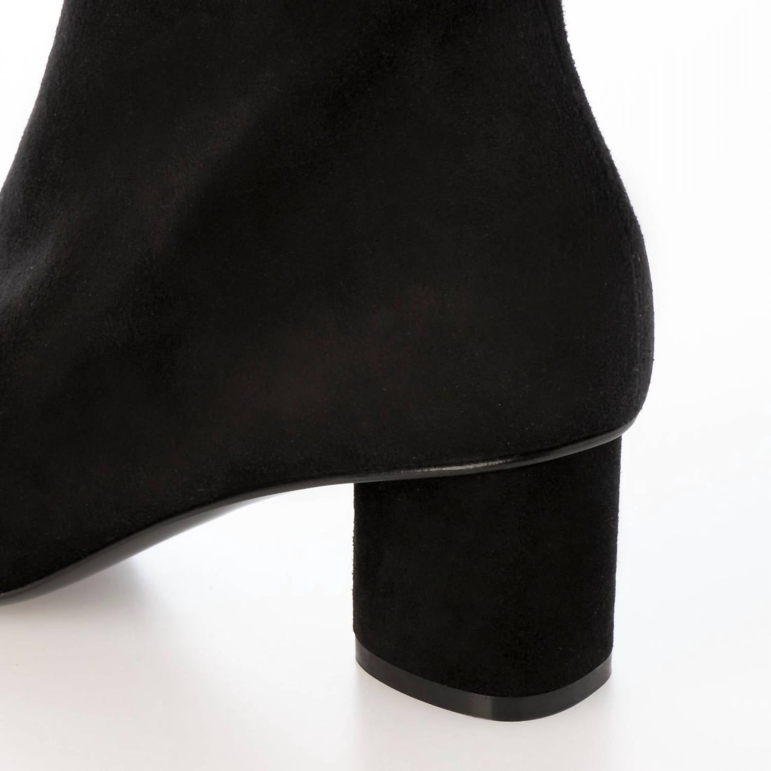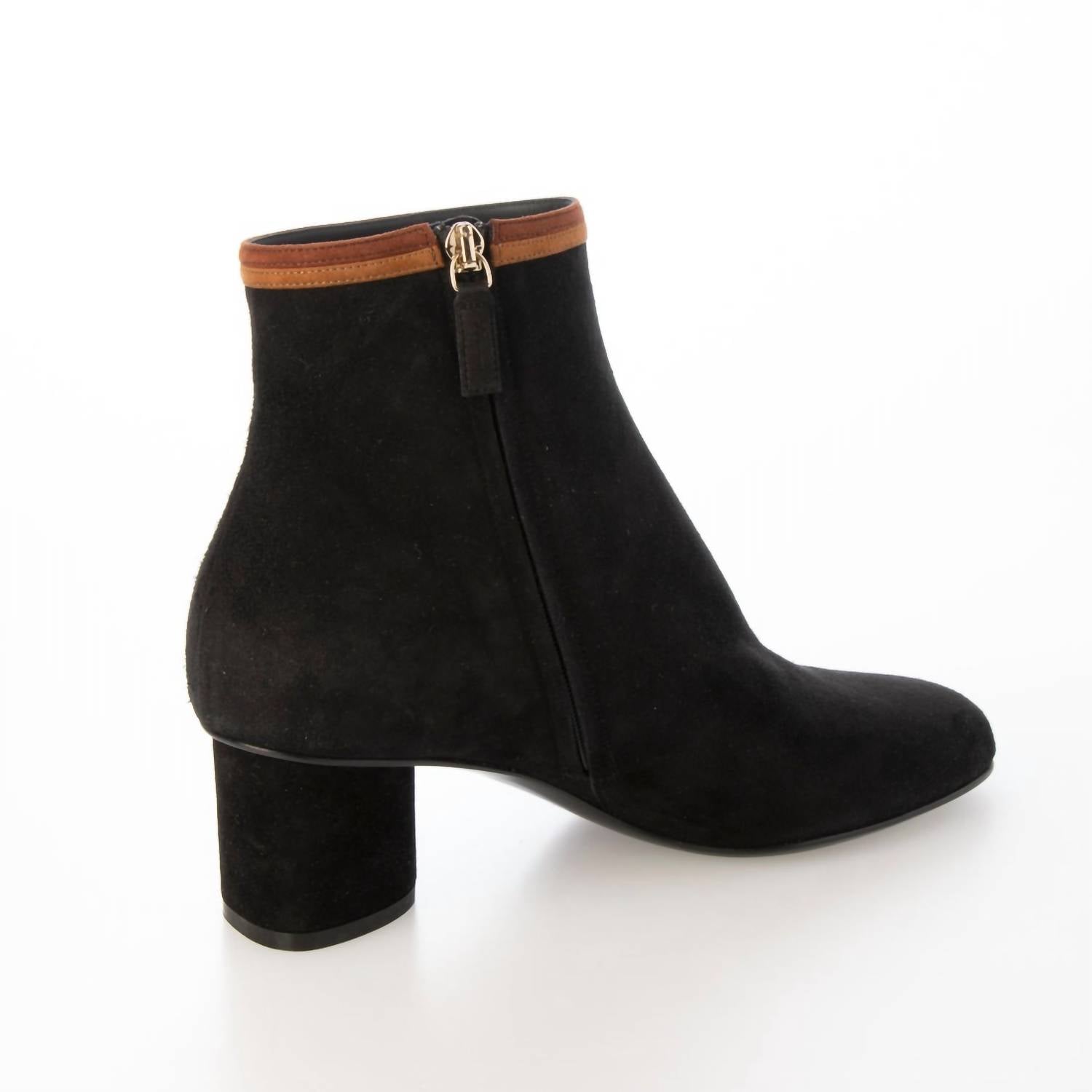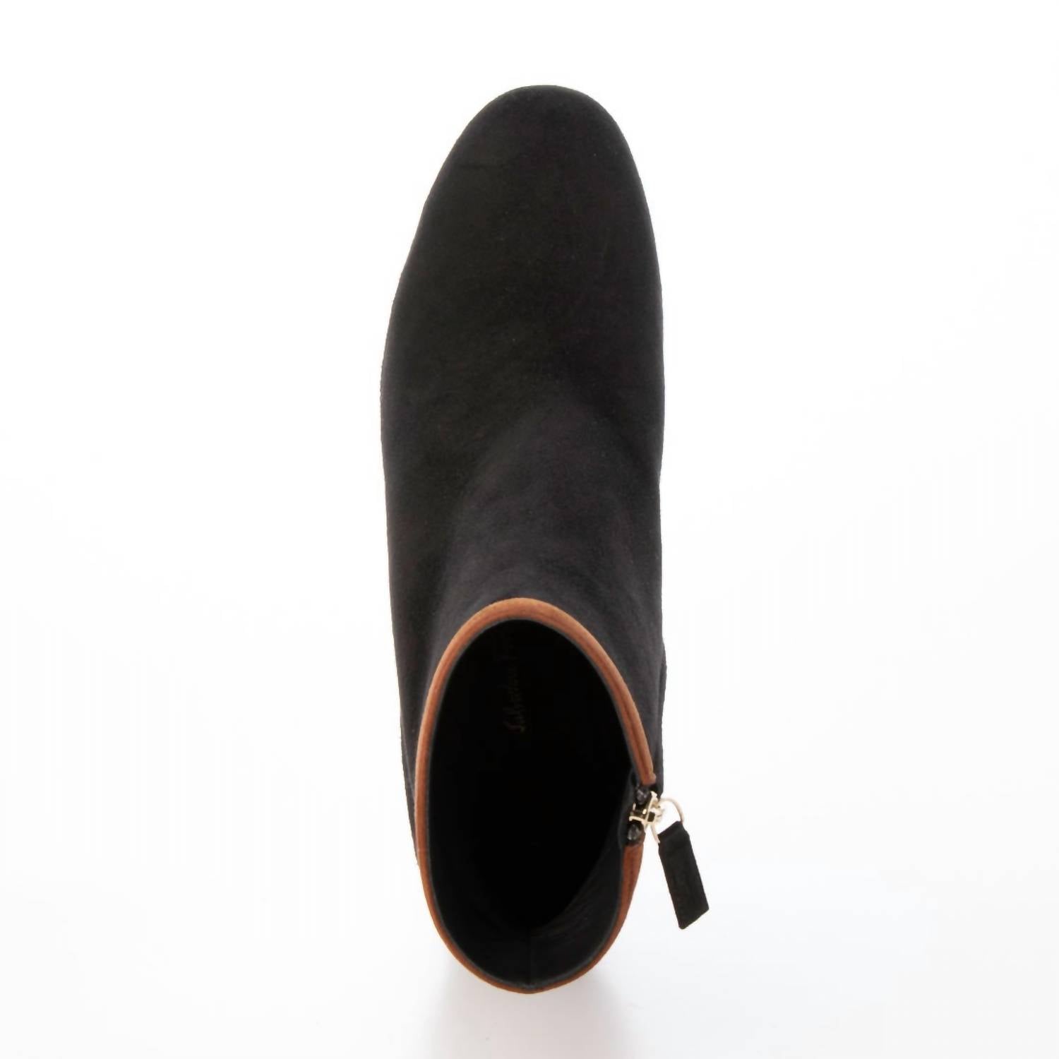 Say hello to the perfect, most versatile boot. The ankle height makes this style easily transition from day to night. Wear them with your favorite skinny jeans and tee for a more laid back look, or pair them with your favorite mini dress and jacket for a night out on the town. Step into timeless elegance with the Women's Ankle Suede Booties by Salvatore Ferragamo, crafted exclusively from luxurious suede. These black minimalist ankle boots are designed with a distinctive line design at the opening and feature a stable block heel, boasting a mid-height of 2 1/4"-3" for comfort during your dinner parties and holiday celebrations. Complete with a classic round toe, they bring understated sophistication to your spring and New Year's Eve attire. Ideal for the refined woman's wardrobe, these booties are a chic choice for any occasion.
