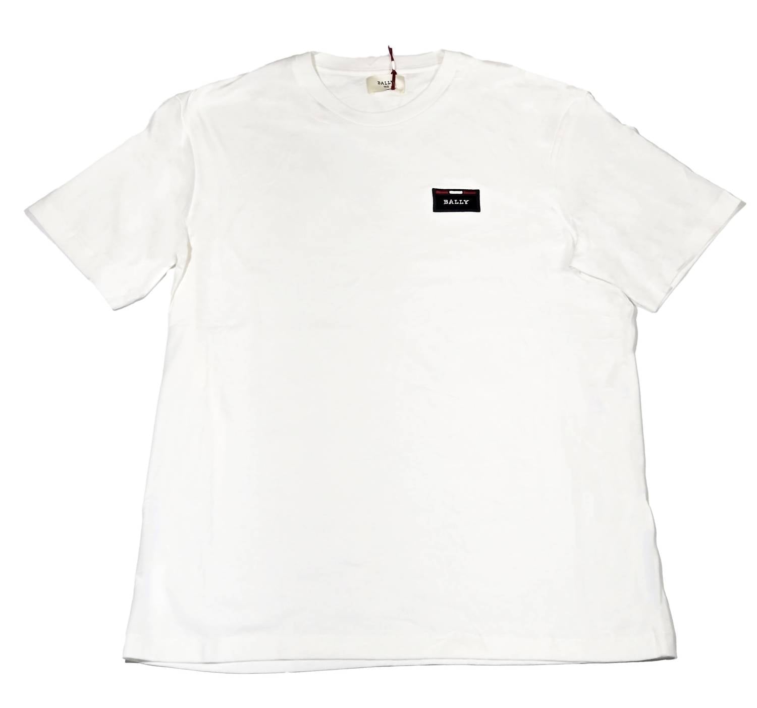 Introducing the Bally Men's Short Sleeve Embroidered Logo T-shirt, a refined addition to any modern wardrobe. Designed in a crisp white, this t-shirt is crafted from 100% cotton, offering a soft and breathable fit ideal for casual wear. Made in Portugal, it features a classic crewneck and relaxed fit, with an iconic embroidered Bally logo patch adding a distinguished touch. Its pull-on closure ensures easy wear, while being effortlessly maintained with machine wash care instructions.