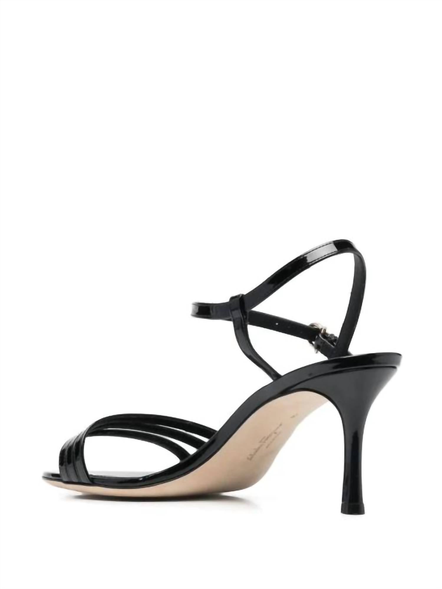 Classicly cute and all-day-wearable. We love this sandal. Step into elegance with the Salvatore Ferragamo Women's 75mm Heeled Sandal, a sophisticated choice for any dinner party or New Year's Eve celebration. Crafted in Italy from 100% calf leather, these jet-black sandals boast a minimalist design with an open toe and a stylish stiletto heel. The buckle fastening ensures a secure fit, while the branded insole adds a touch of luxury. Perfect for the summer season, these statement heels elevate any ensemble.