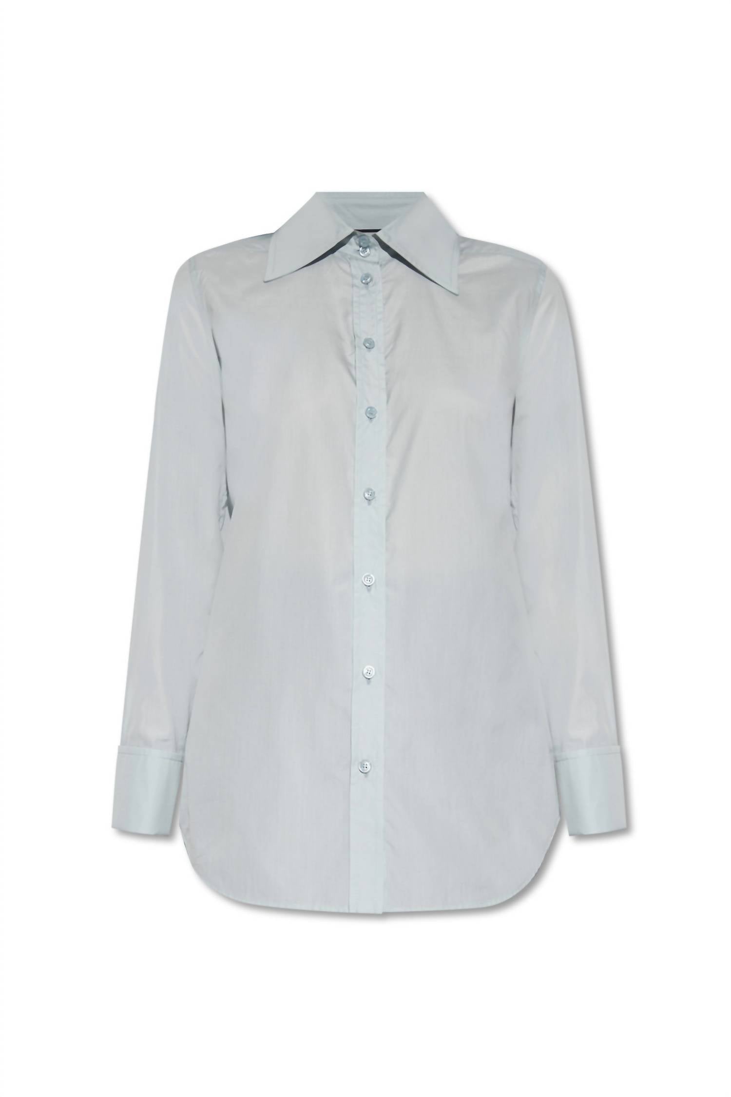 A classic button down shirt that will never go out of style. Elevate your wardrobe with the Fine Poplin Shirt by Gucci, an elegant choice in sky azure for the discerning woman. Crafted from 100% cotton, this shirt boasts long sleeves and epaulettes, complemented by a classic button closure. The cufflink closures add an extra touch of sophistication to the solid patterned design. Perfect for a chic and timeless look.