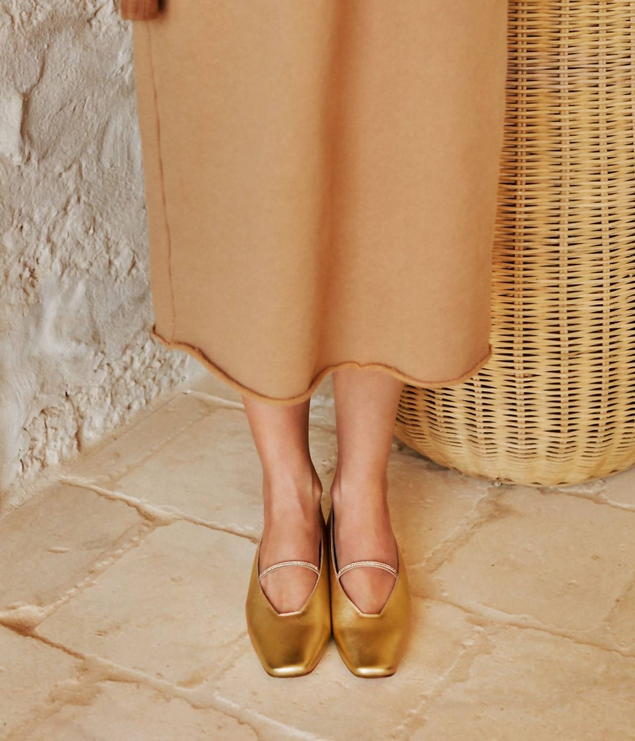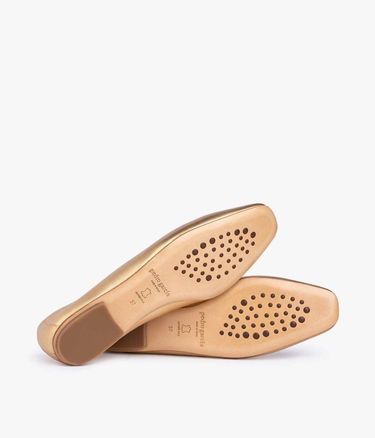 Made with laminated lambskin for a luxurious feel, these flats feature a crystal trim. Cushioned insole and anti-slip leather sole. Metallic leather ballerina flats with Swarovski® crystal trim. Flat heel. Square toe. Embellished mid-vamp strap. Slip-on style. Leather outsole. Lining: leather. Made in Spain.