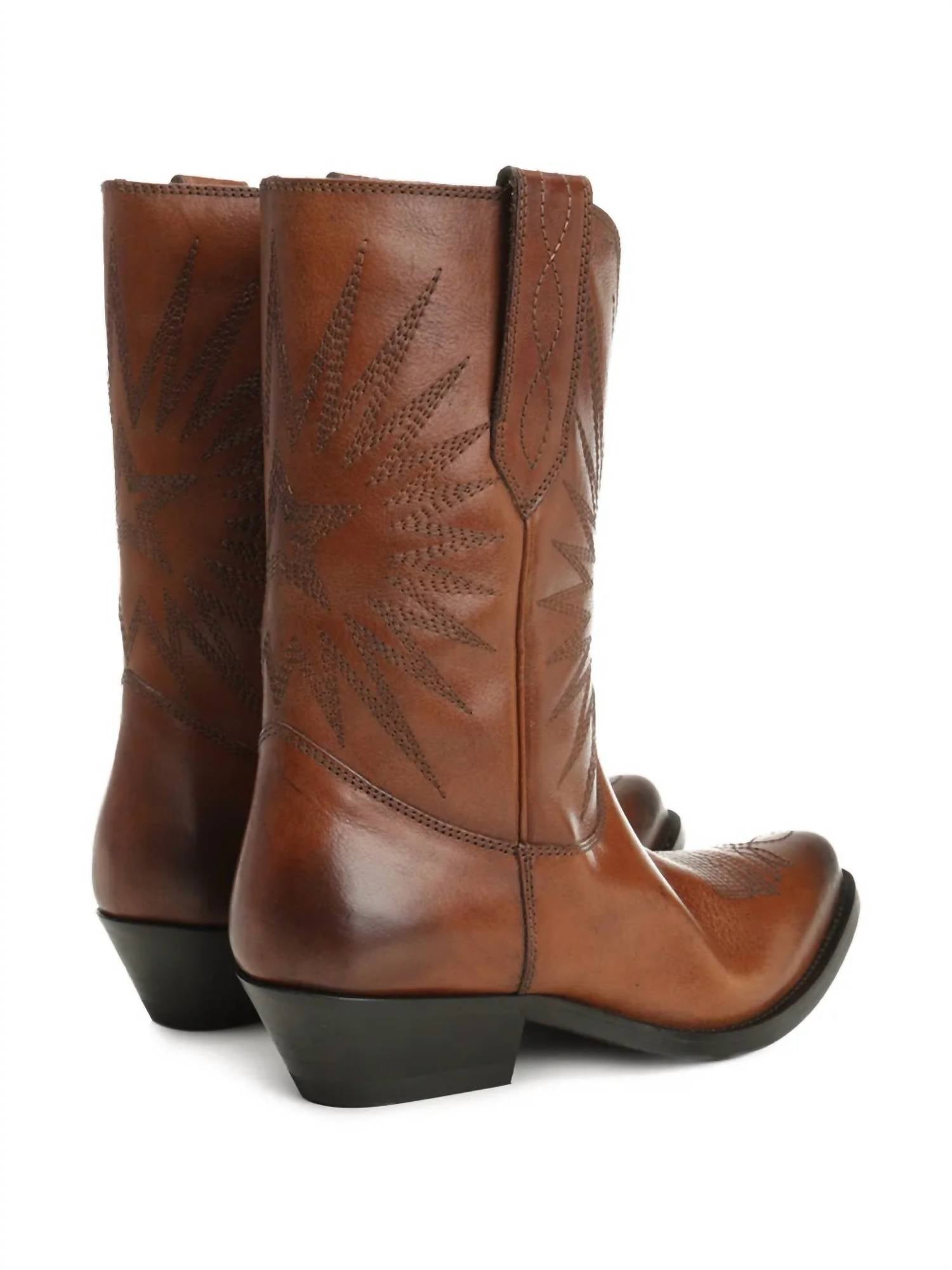 A trend that is here to stay. Introducing the Women's Low Wish Star Boots by Golden Goose, a fusion of Venetian tradition and cowboy spirit perfect for your unique style. These over-the-knee boots, crafted from 100% cow leather in a luxurious tan, showcase intricate tonal embroidery and stitching. With their pointed toe and Western trend appeal, they're ideal for music festivals and fall-season outings. Made in Italy, these boots promise to be a stylish addition to your footwear collection.