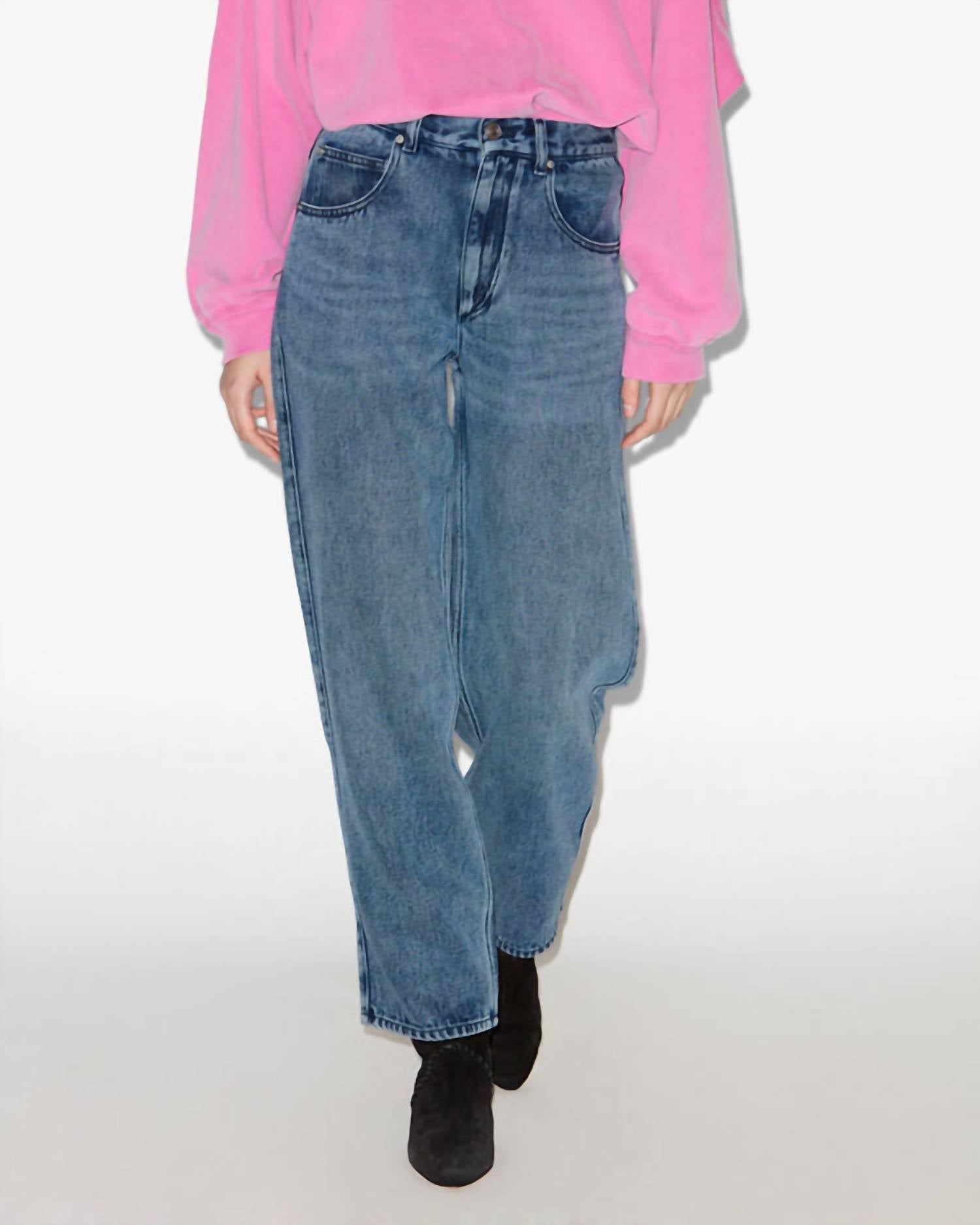 Pair these wide leg jeans with mules, slides or your favorite strappy sandals. Embrace effortless style this summer with the Jenny Pant by Isabel Marant, crafted in a Light Blue hue ideal for vacation wear. These medium-rise jeans combine relaxed fit comfort with the durability of 77% Lyocell and 23% cotton. Featuring a fitted waistband adorned with loops, the pants secure with a metal button and hidden zipper, alongside classic silver-finish metal rivets. Practicality meets style with five classic pockets and easy machine wash care instructions, making it a perfect addition to your wardrobe.