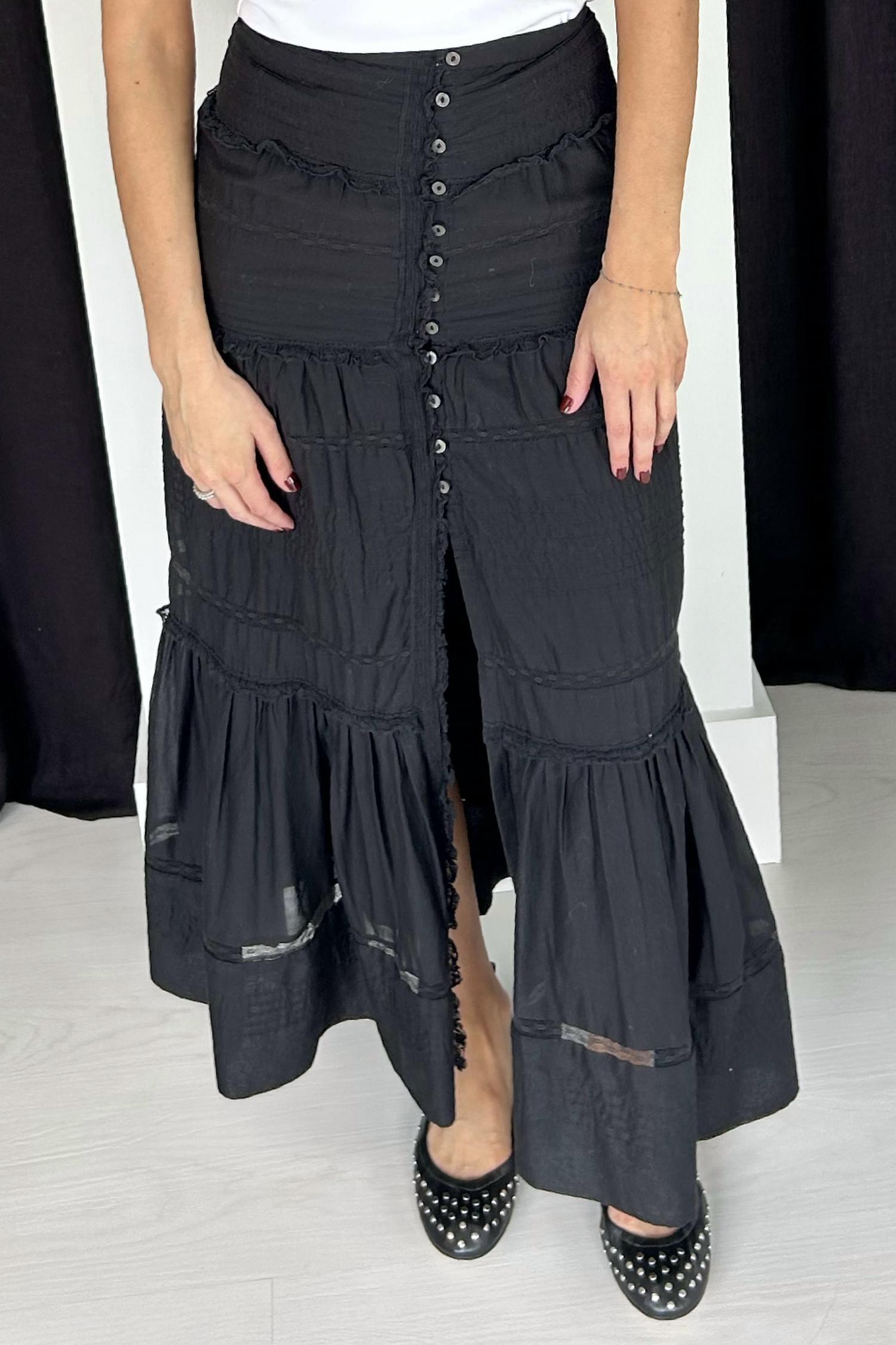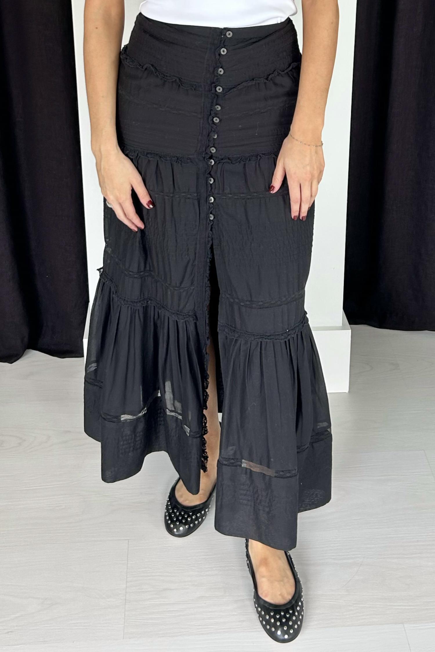 Tuck your favorite tee into this midi length skirt for an effortlessly cool look. The Women's Gihane Skirt by ISABEL MARANT ÉTOILE is an exquisite choice for a monochrome, vacation-ready ensemble. Crafted from 100% cotton voile, this long black skirt showcases a fitted waistband and a buttoned front, alongside a subtle front slit. The pleated design features intricate openwork lace details, enhancing its flared cut for a feminine silhouette. Recommended care is dry clean only, ensuring the delicate fabric maintains its pristine quality.