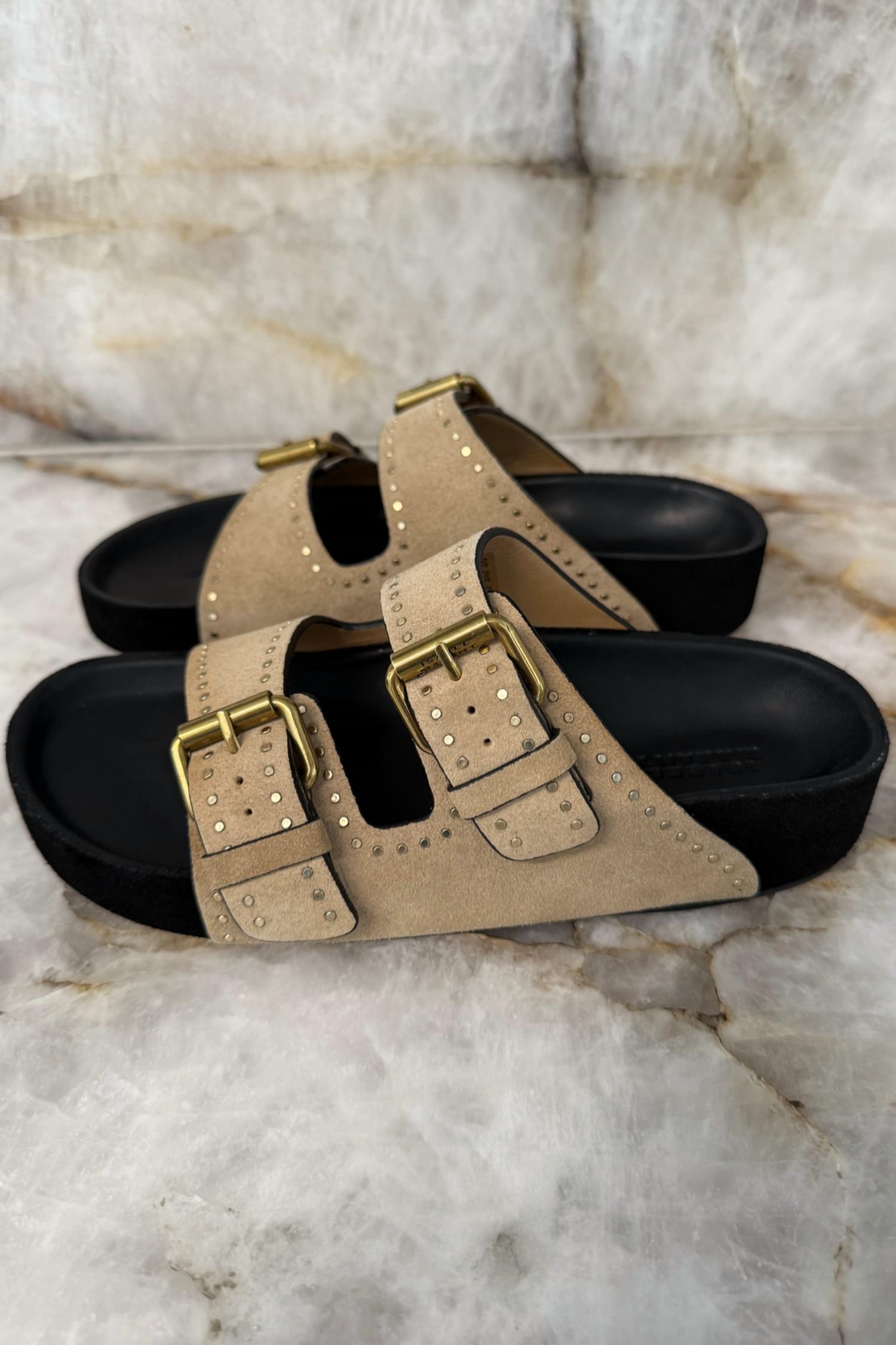 This sandal will take you from brunch to dinner and everything in between. Step into summer elegance with the Women's Lennyo Sandals by Isabel Marant, designed in a chic beige for that perfect vacation vibe. These sandals boast a suede upper and a sturdy wide fit, complemented by round open toes and studded openwork straps for a secure yet stylish fit. The flat heel style caters to comfort while the visible seams add a boho chic touch. Perfect for any summer outing, these sandals seamlessly blend comfort with style.