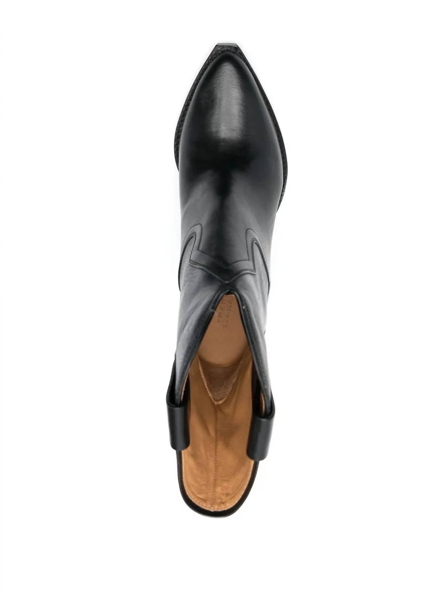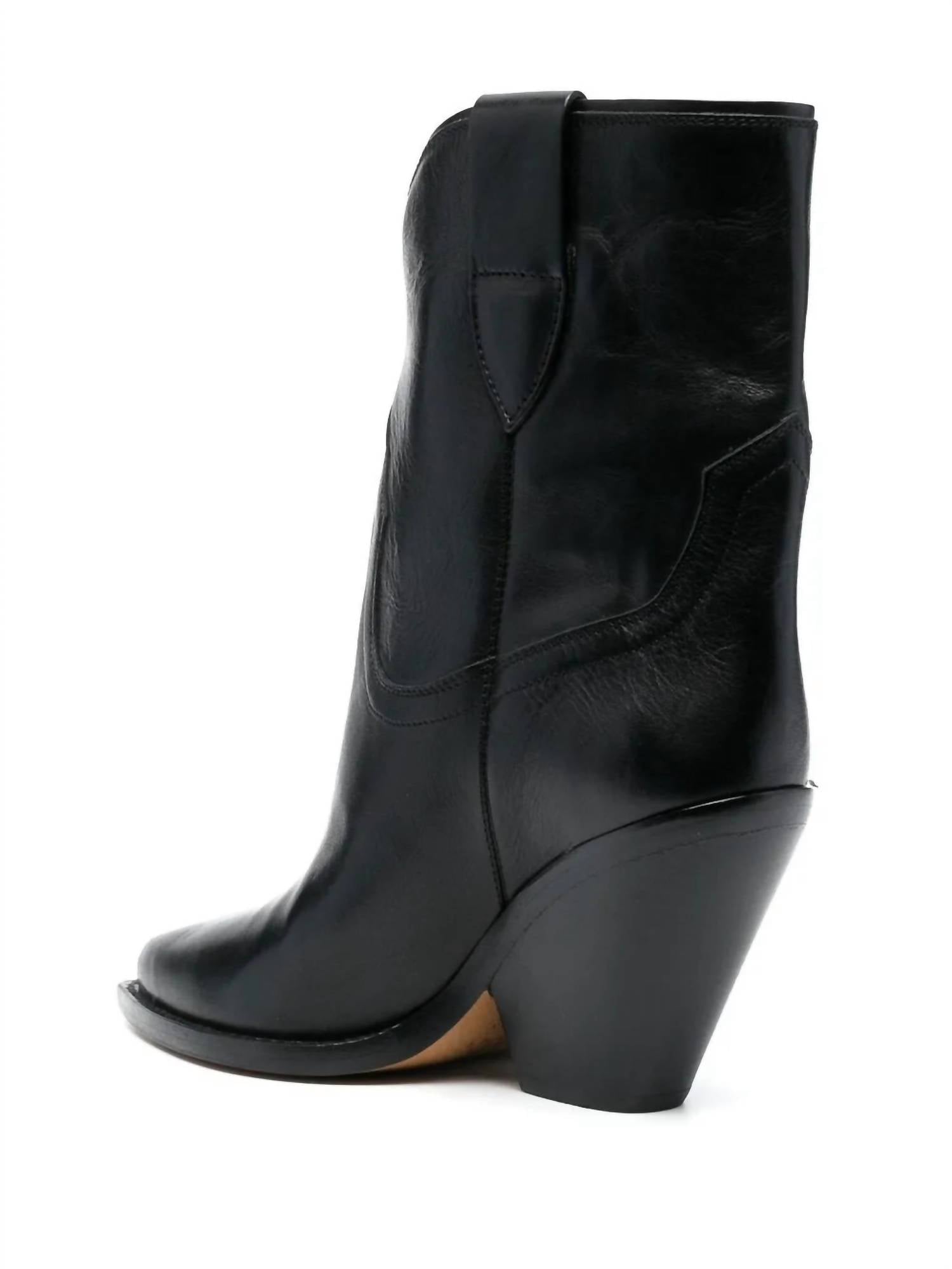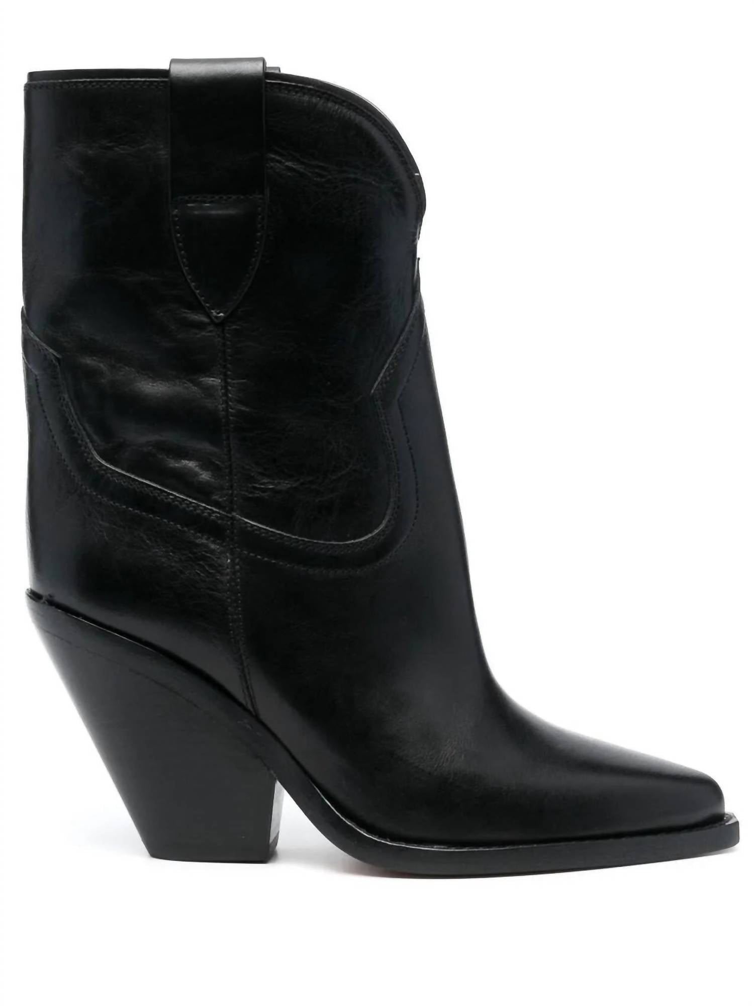 Say hello to the perfect, most versatile boot. The ankle height makes this style easily transition from day to night. Wear them with your favorite skinny jeans and tee for a more laid back look, or pair them with your favorite mini dress and jacket for a night out on the town. Step into style with the Women's Leyane Leather Boots by Isabel Marant, crafted to perfection from 100% calfskin leather. These high-heeled cowboy boots feature smooth leather uppers with round yokes and pointed toes, complemented by laminated Cuban heels measuring 9 cm (3.5 in). Made in Italy, they are designed with soft leather insoles and outsoles for added comfort. Ideal for a Boho Chic look at your next music festival this fall.
