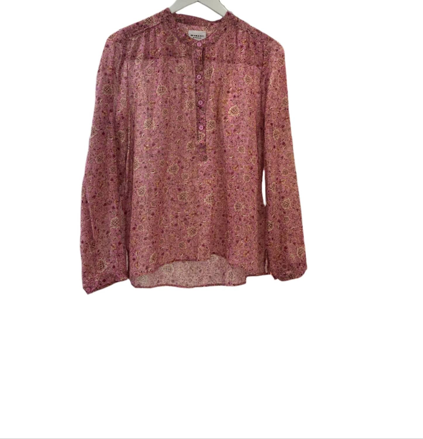 A versatile blouse that works from desk to dinner! Elevate your spring wardrobe with the Women's Maria Top by ISABEL MARANT, showcasing a beautiful floral tapestry pattern in pink. This relaxed fit blouse features long sleeves and a classic crewneck, complemented by thin buttoned cuffs and shoulder yokes. Made from 100% cotton, it combines style and comfort with a convenient pull-on closure. Ideal for a holiday party or casual outings, this top promises effortless elegance.