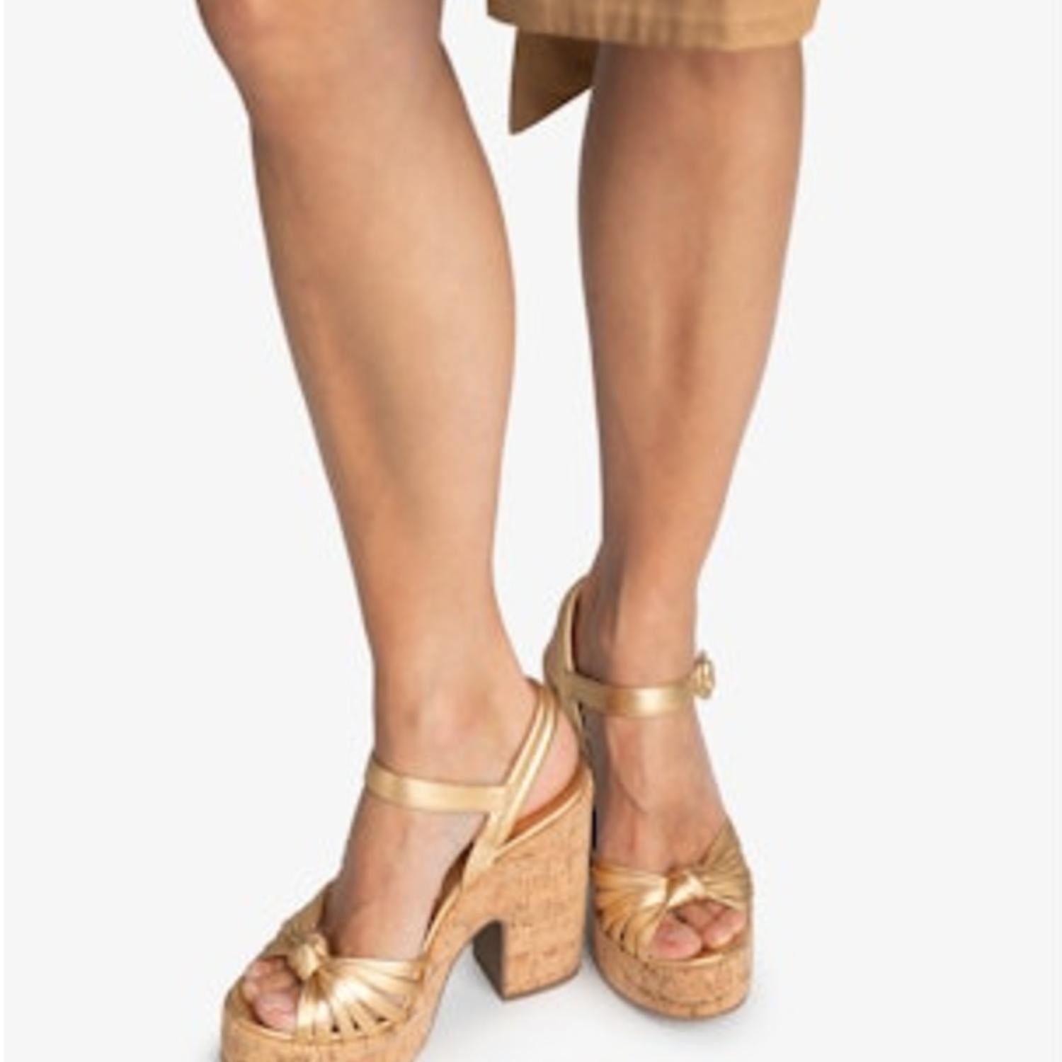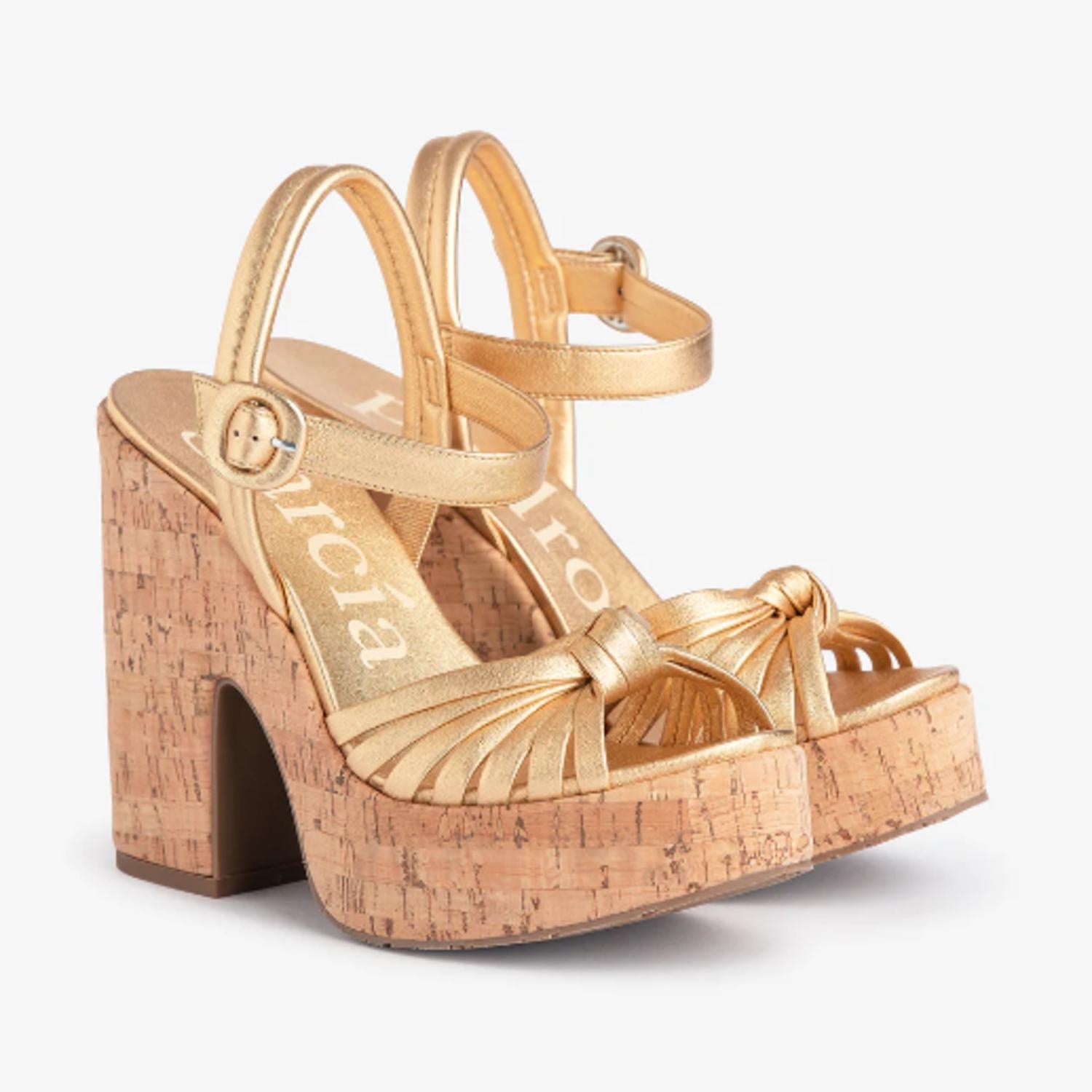 Flowy dresses, cropped pants, and even jumpsuits... this sandal works with them all! Introducing the Women's Tailor Heeled Corkbed Sandal by Pedro Garcia, a stunning choice for your evening events. These gold sandals feature a round toe design and a high chunky heel, perfect for adding elegance to your look. Made from luxurious laminate lambskin leather, these sandals align with the Quiet Luxury trend. Originating from Spain, they are an exceptional spring holiday pick for a sophisticated touch.