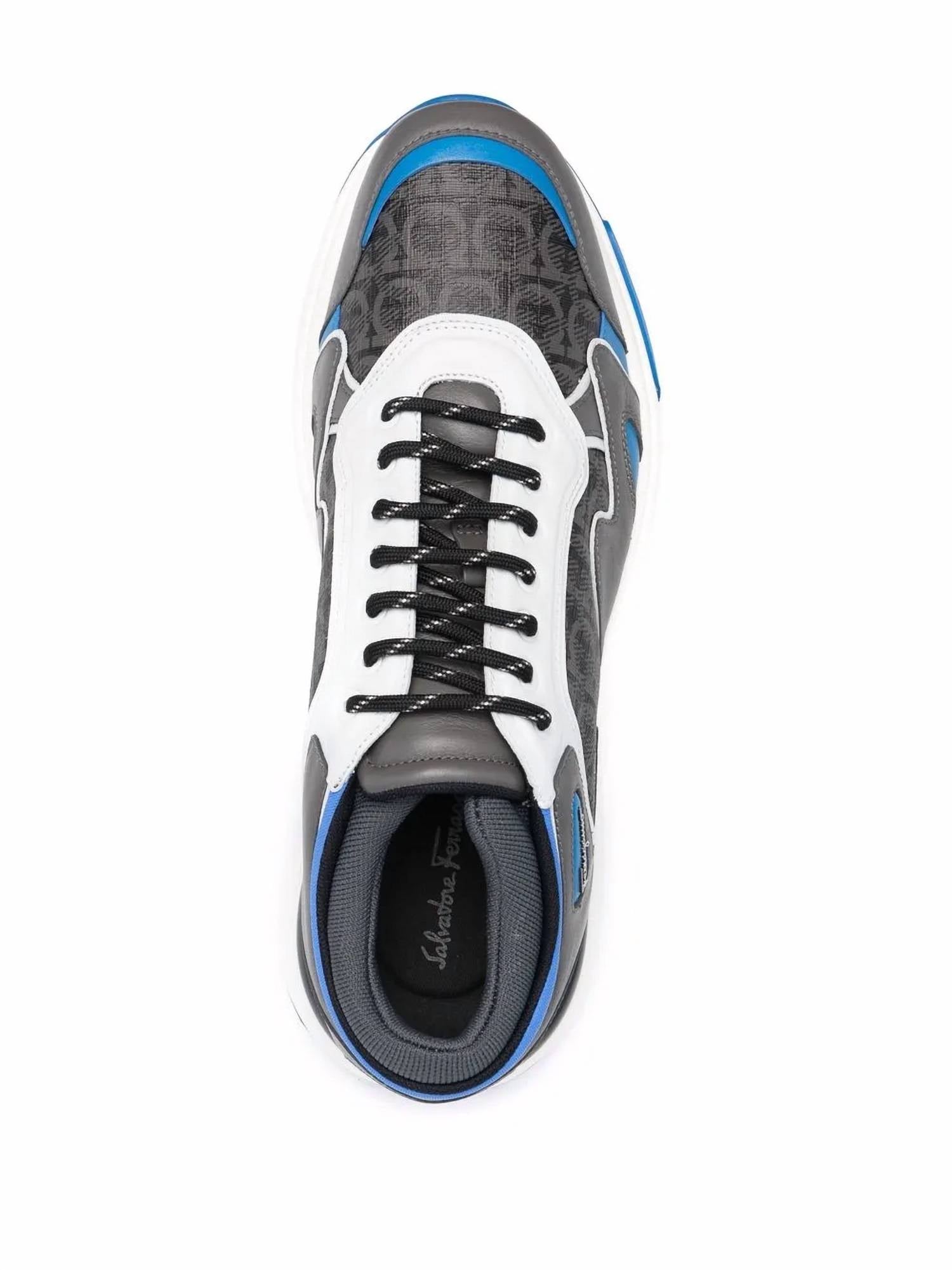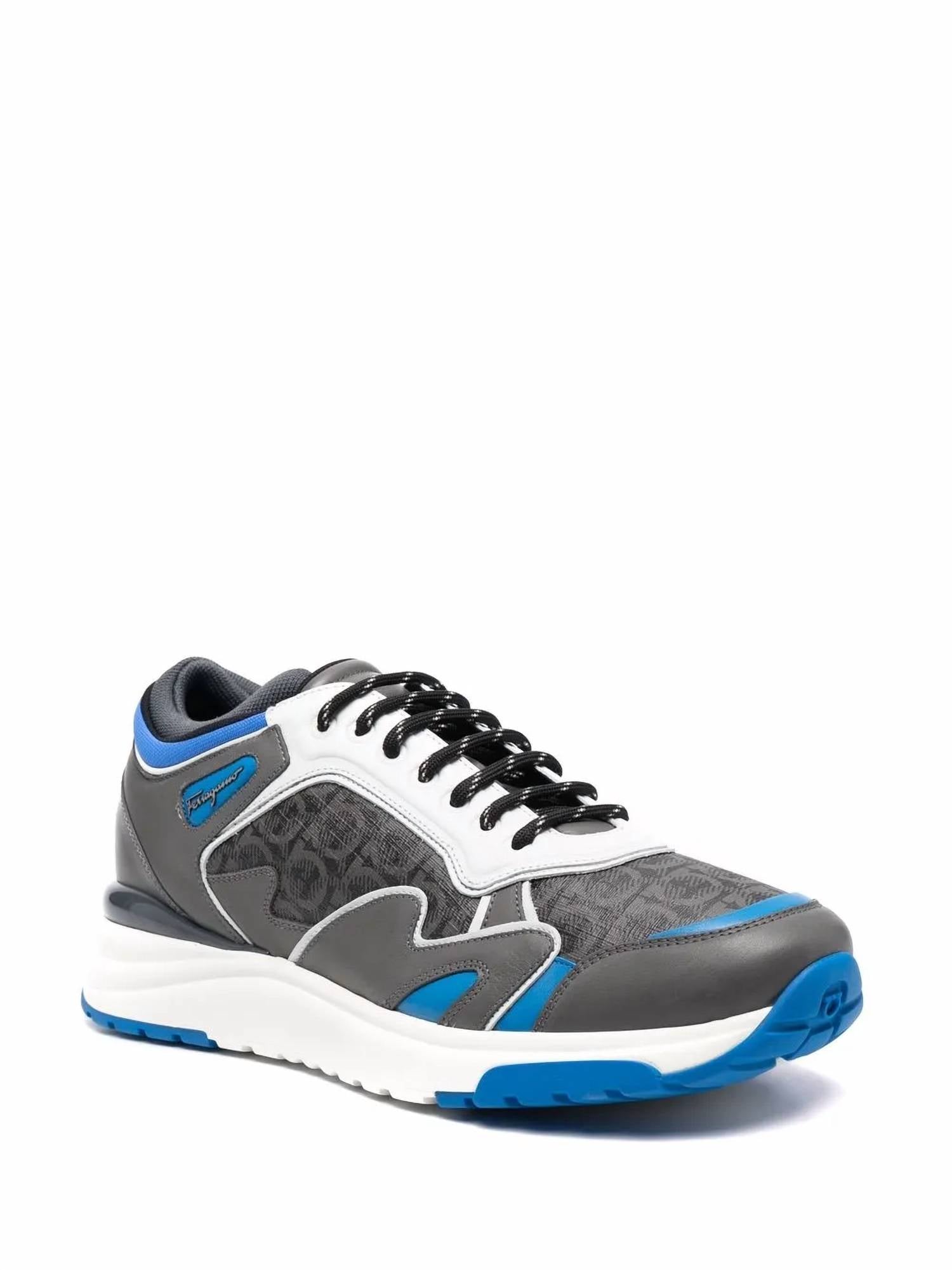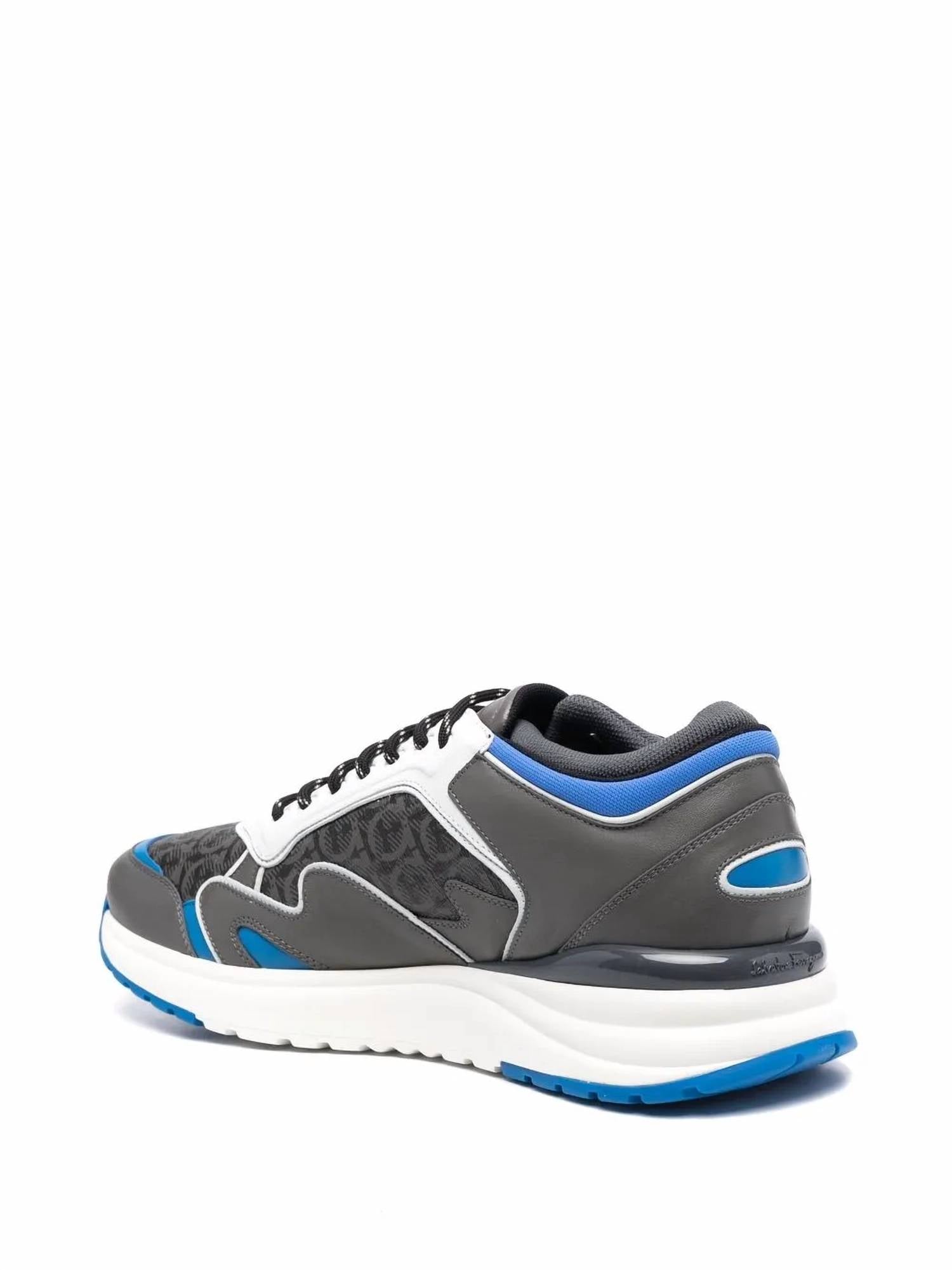Step into style with the Salvatore Ferragamo Gancini Rainbow Sneakers, a sophisticated choice for the modern man. These grey blue sneakers are expertly crafted with a color-block panelled design, featuring a combination of 100% calf leather and fabric for the outer, with a luxurious fabric lining for comfort. The monogram print adds a signature touch, while the flat rubber sole and front lace-up fastening ensure practicality and support. Ideal for spring streetwear and travel, these sneakers are perfect for New Year's Eve or any occasion with a low heel sitting at 1 1/4"-2" for a comfortable, flat heel style.