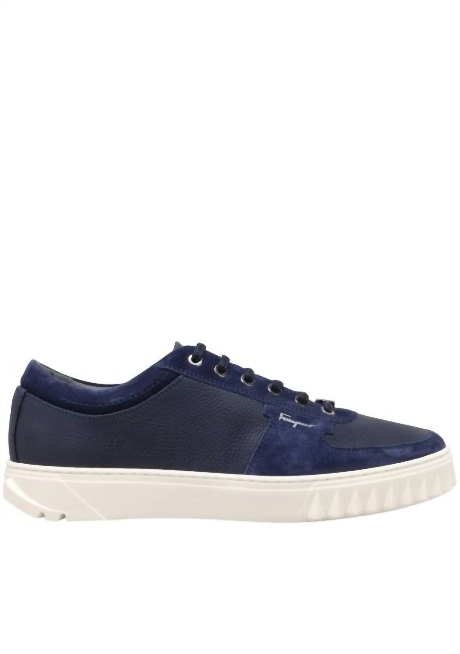 Discover the Men's Leather Sneakers by Salvatore Ferragamo, a perfect blend of style and comfort for your travel needs. Crafted with a leather material, these sneakers feature a round toe and a flat rubber sole for a minimalist look. Enjoy the convenience of front lace-up fastening, complemented by a branded insole for added luxury. Ideal for Spring and New Year's Eve occasions, these blue sneakers make a sophisticated wardrobe addition.