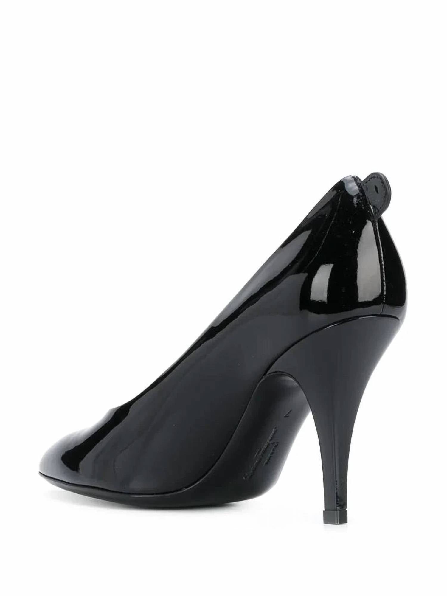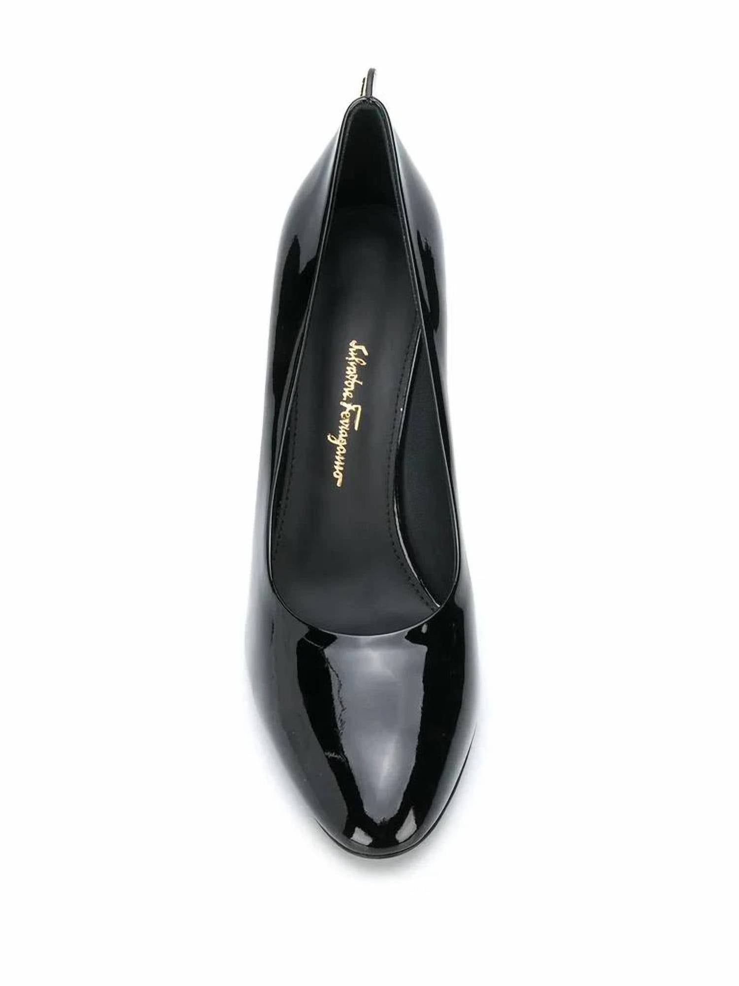 Pair these beauties with your favorite skinny jeans or dress for a night out on the town. Elevate your evening attire with the Women's Almond-toe Pumps by Salvatore Ferragamo, a masterpiece in black patent leather exuding quiet luxury. Perfect for elegant occasions, these pumps feature an almond toe and high stiletto heel, complemented by a sleek slip-on style for easy wear. Crafted with a branded insole and leather sole, these stylish shoes are suitable for spring events and New Year's Eve celebrations. Ideal for those with a taste for refined fashion, this pair is finished with a rear logo plaque and pull tab that adds a sophisticated touch.