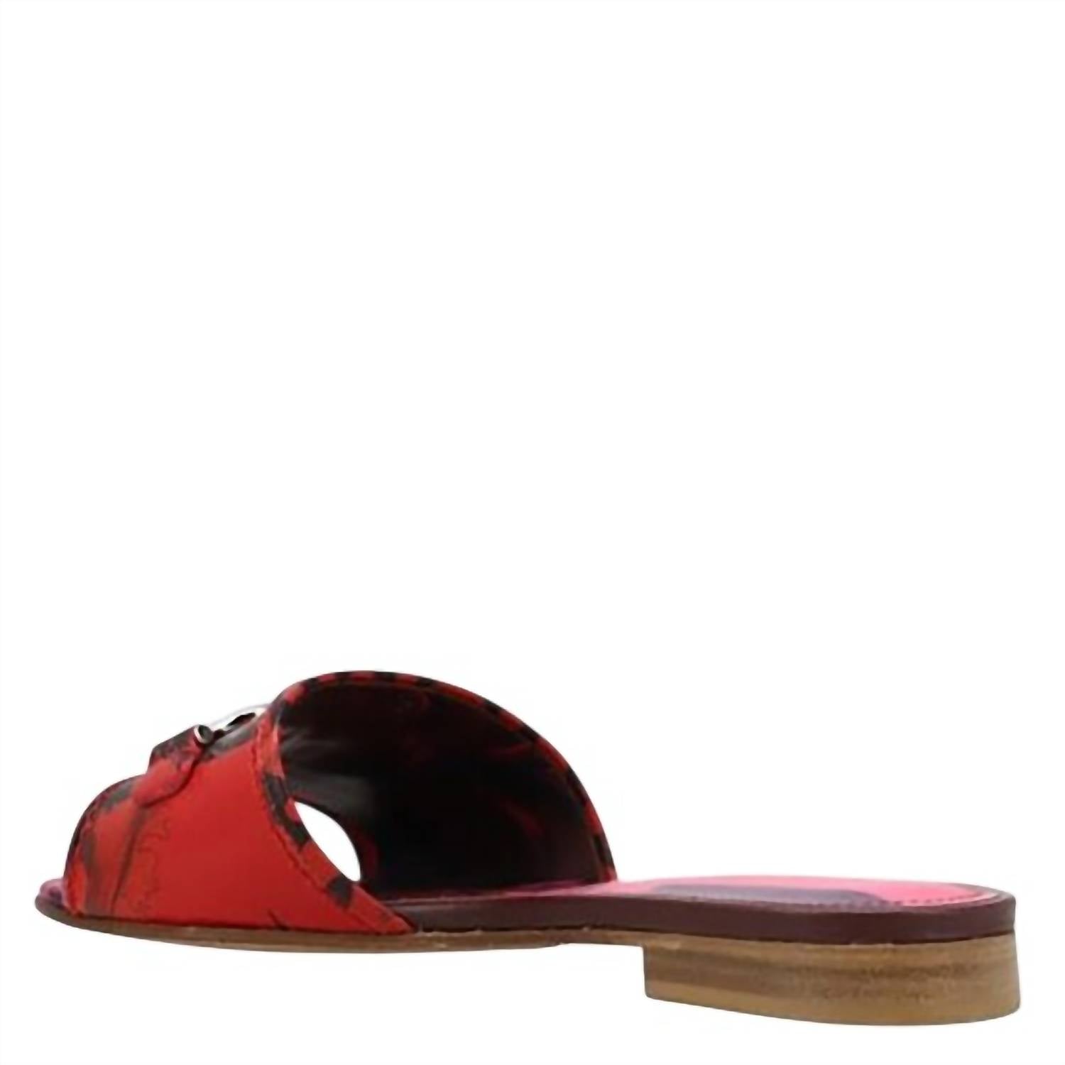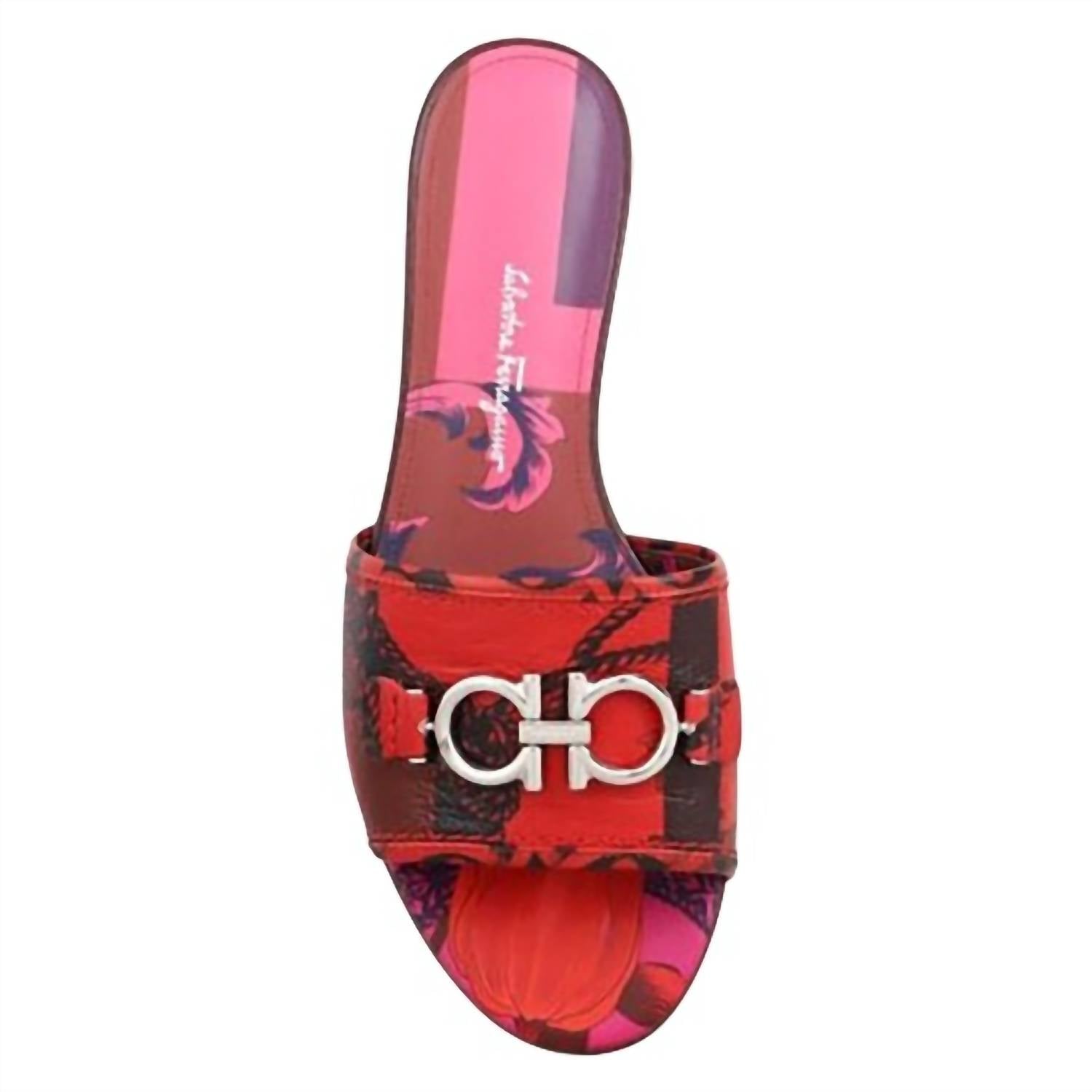 Classicly cute and all-day-wearable. We love this sandal. Step into sophistication with the Salvatore Ferragamo Women's Gancini Slide Sandals, a luxurious addition for your summer wardrobe. Crafted in Italy, these elegant slides feature a vibrant red hue with a printed leather strap and iconic palladium Gancini buckle for a striking look. The leather insole is lightly padded for comfort, and the traceable, metal-free vegetable-tanned leather sole underscores the brand's commitment to eco-friendly practices. Perfect for vacationing in style, these slides offer a modern take on classic design trends with a round toe and flat heel under 1".