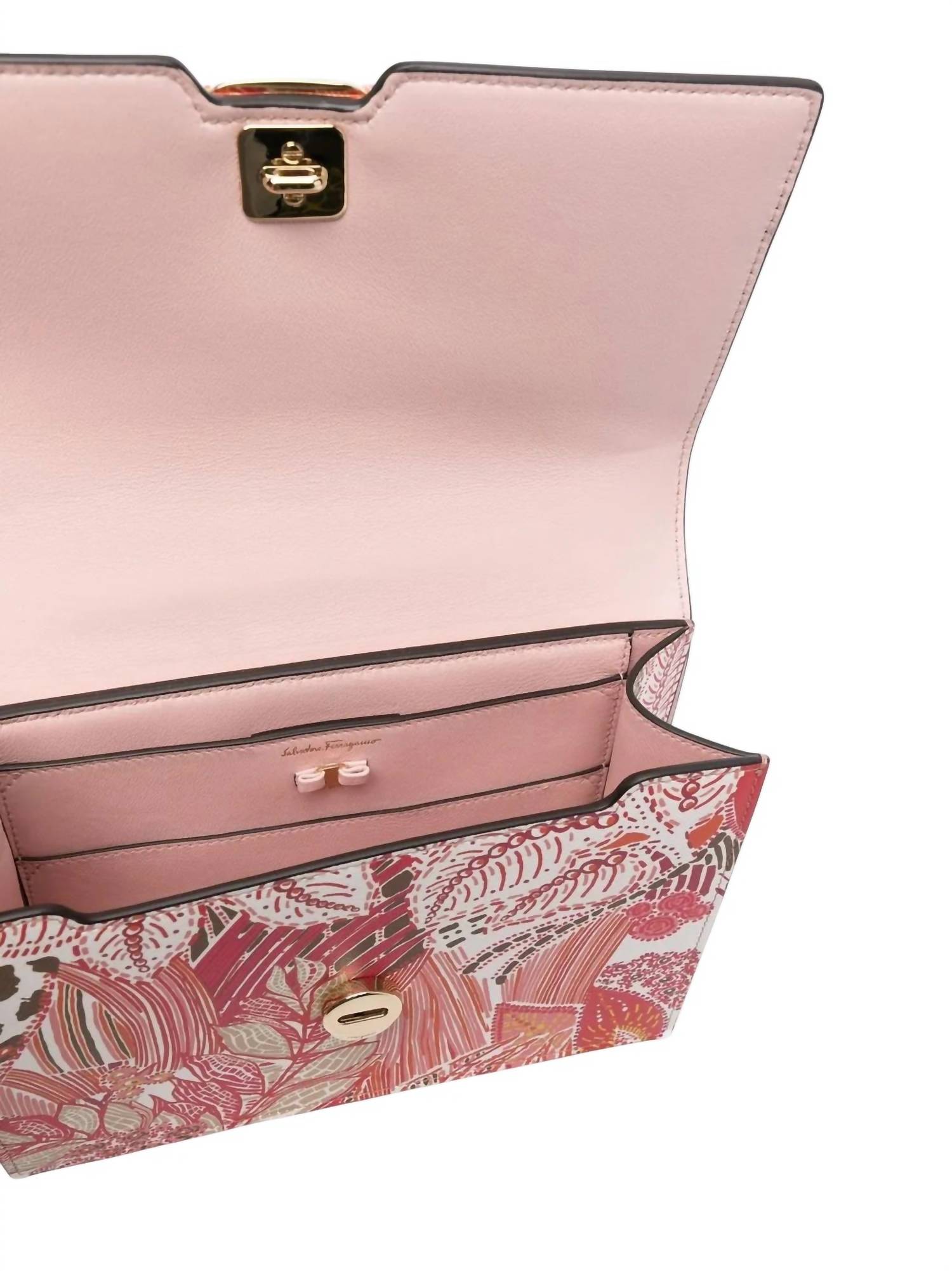 The carry-all satchel of the season. Introducing the Vara Floral-print Leather Satchel Bag by Salvatore Ferragamo, an elegant accessory crafted in Italy. This sophisticated satchel is fashioned from 100% calf leather, showcasing a captivating floral print in a charming pink hue. With dimensions of 23 cm in width, 15 cm in height, and a depth of 7 cm, it offers ample space for essentials while the 54 cm strap ensures comfortable carrying. Elevate your ensemble with this exquisite piece that combines luxury craftsmanship with contemporary style.