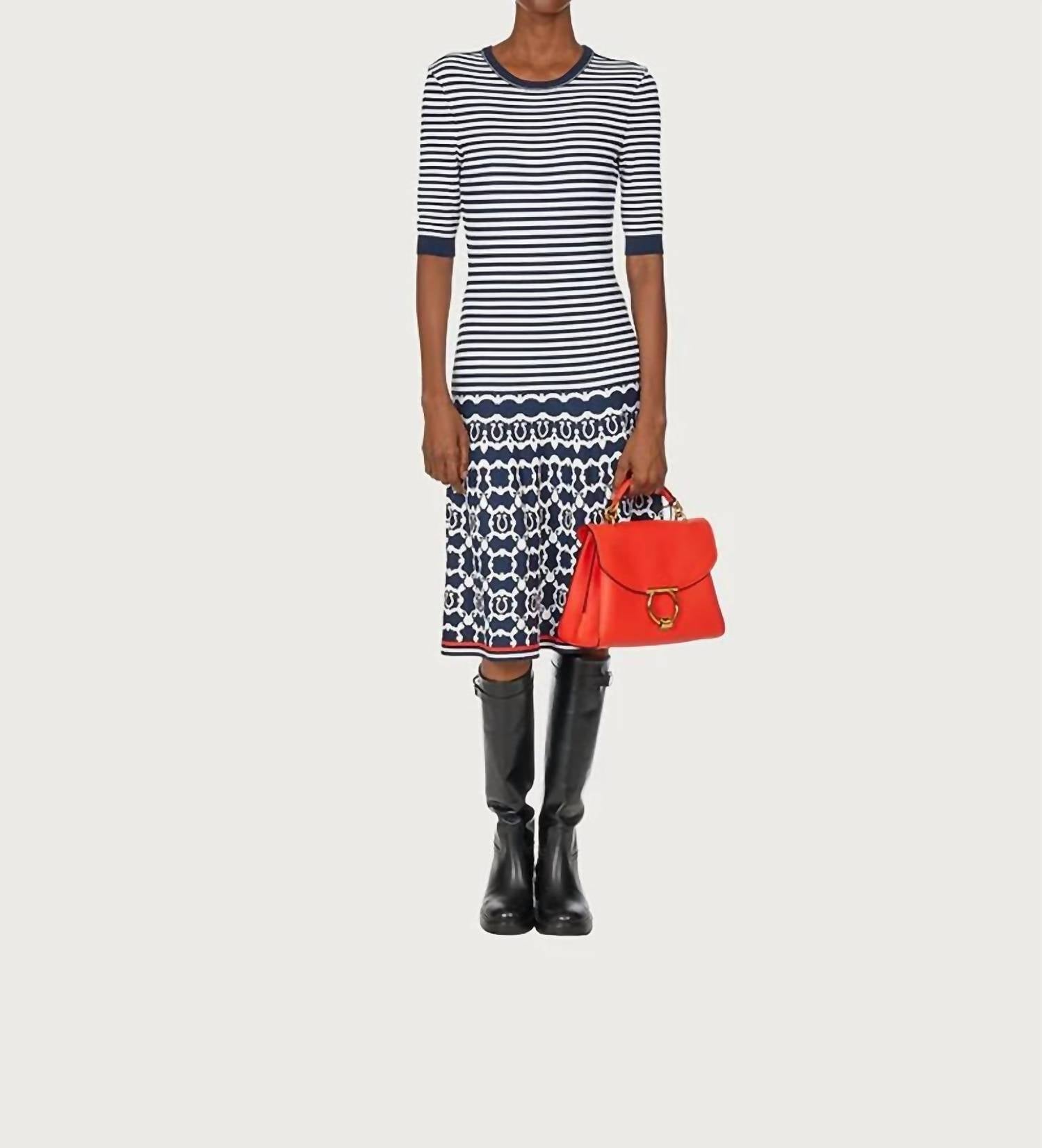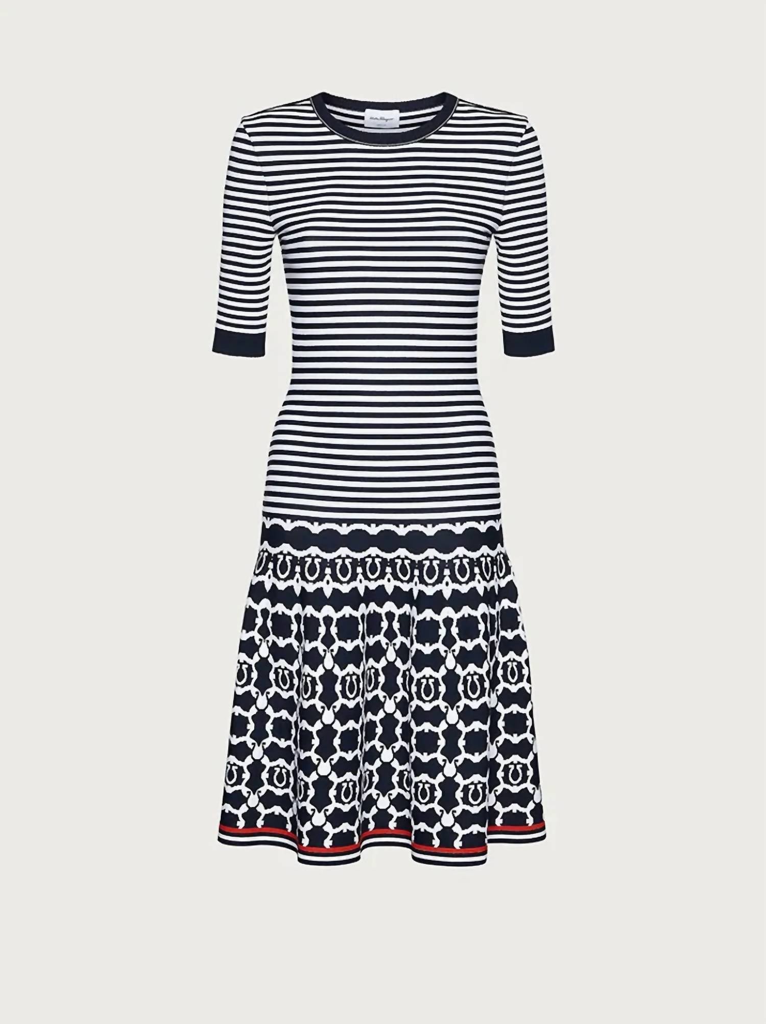 Just add slides or mules and you are good to go. Introducing the Women's Viscose Fiber Midi Dress by Salvatore Ferragamo, a chic piece that encapsulates contemporary flair with timeless elegance. This dress features short sleeves and composition of 95% viscose, 4% polyester, and 1% polyamide, crafted as a blend for luxurious comfort. Made in Italy, it boasts a pull-on closure and a flattering A-line silhouette. The knee-length design adorned with a Gancini Galore pattern makes it perfect for a stylish off-duty look or a sophisticated New Year's Eve dinner party.