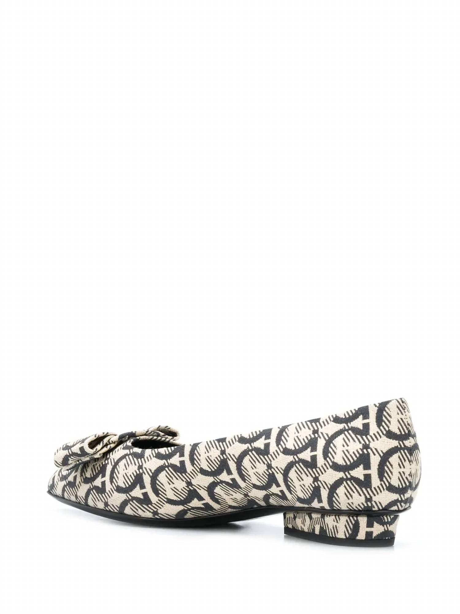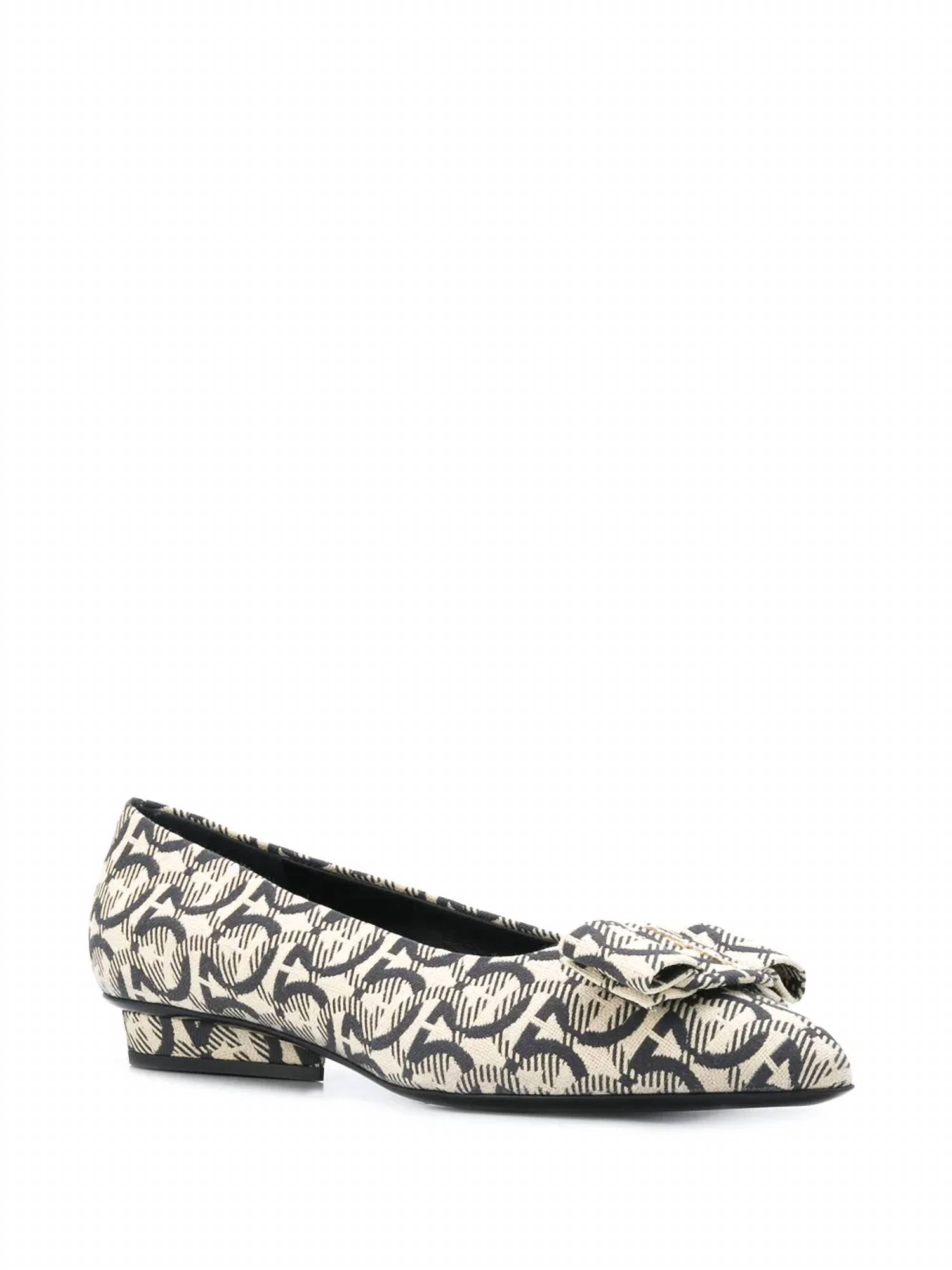 Loafers so versatile you can wear them with just about anything. Step into a modern classic with the Women's Viva Gancini-woven Ballerinas by Salvatore Ferragamo, perfect for an evening event. These elegant flats showcase a chic blend of beige and black with a pointed toe, enriched by the iconic Vara bow and Gancini print. Expertly crafted in Italy, they feature a 100% leather lining and sole, complemented by a fabric outer, providing a luxurious fit for any quiet luxury trendsetter. Ideal for spring occasions, these shoes offer a sleek flat heel for comfort and style.