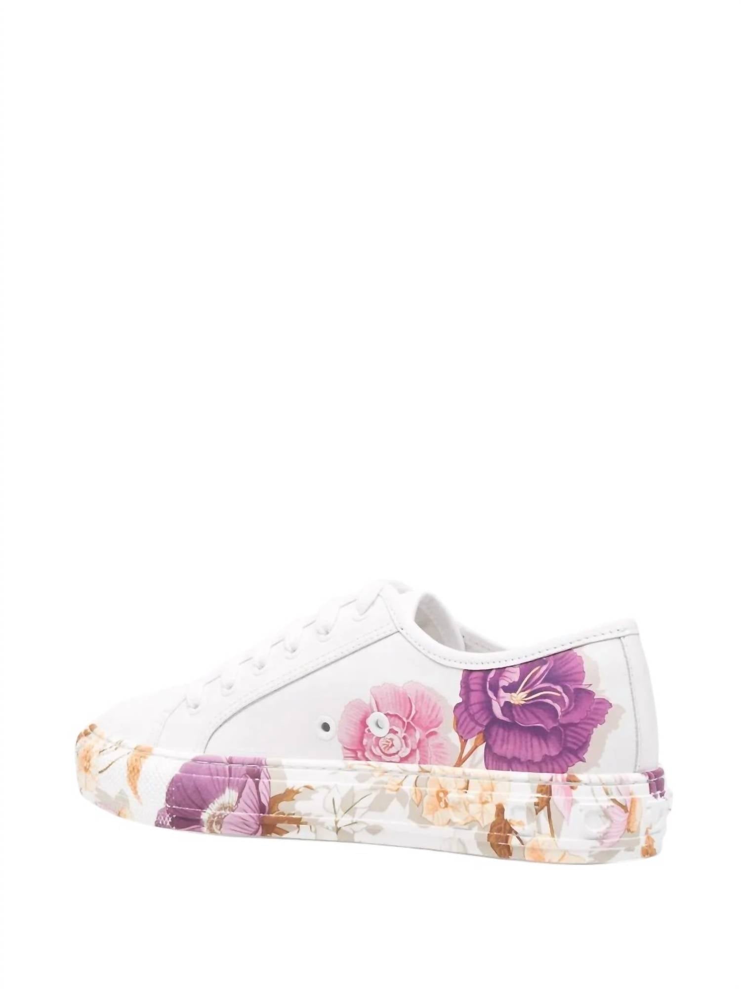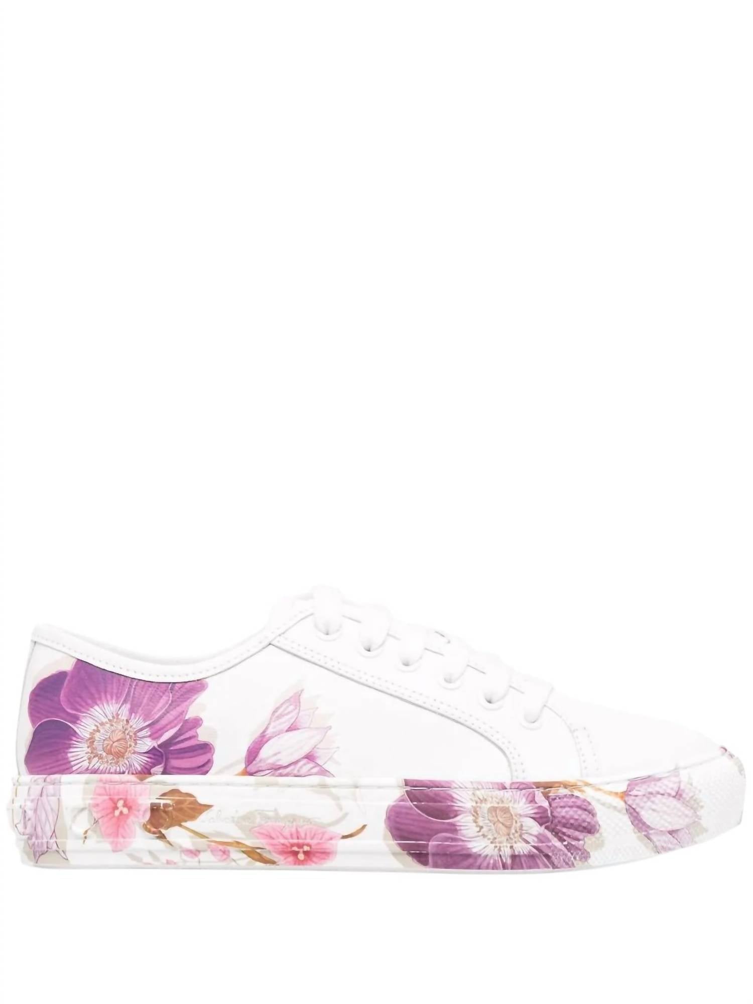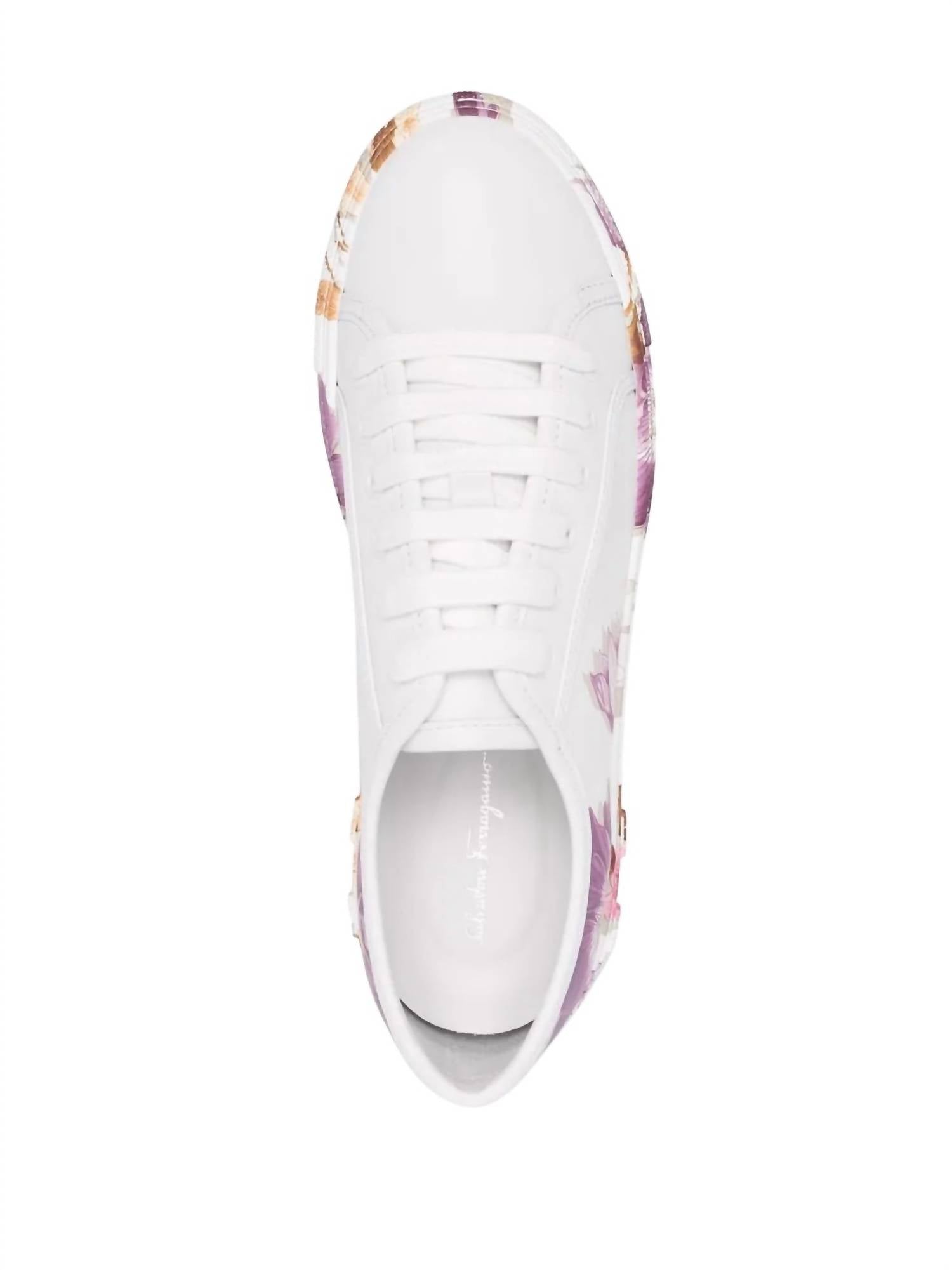 When fashion and function come together seamlessly. Step into elegance with the Salvatore Ferragamo Women's Floral-Print Sneakers, the perfect footwear for your travel adventures. Featuring a captivating white and lavender purple floral design, these sneakers are crafted from 100% calf leather with a branded insole and a minimalist round toe. Made in Italy, they boast a front lace-up fastening and a chunky rubber sole for both style and comfort. The low heel height and flat heel style make them an ideal choice for all-day wear.