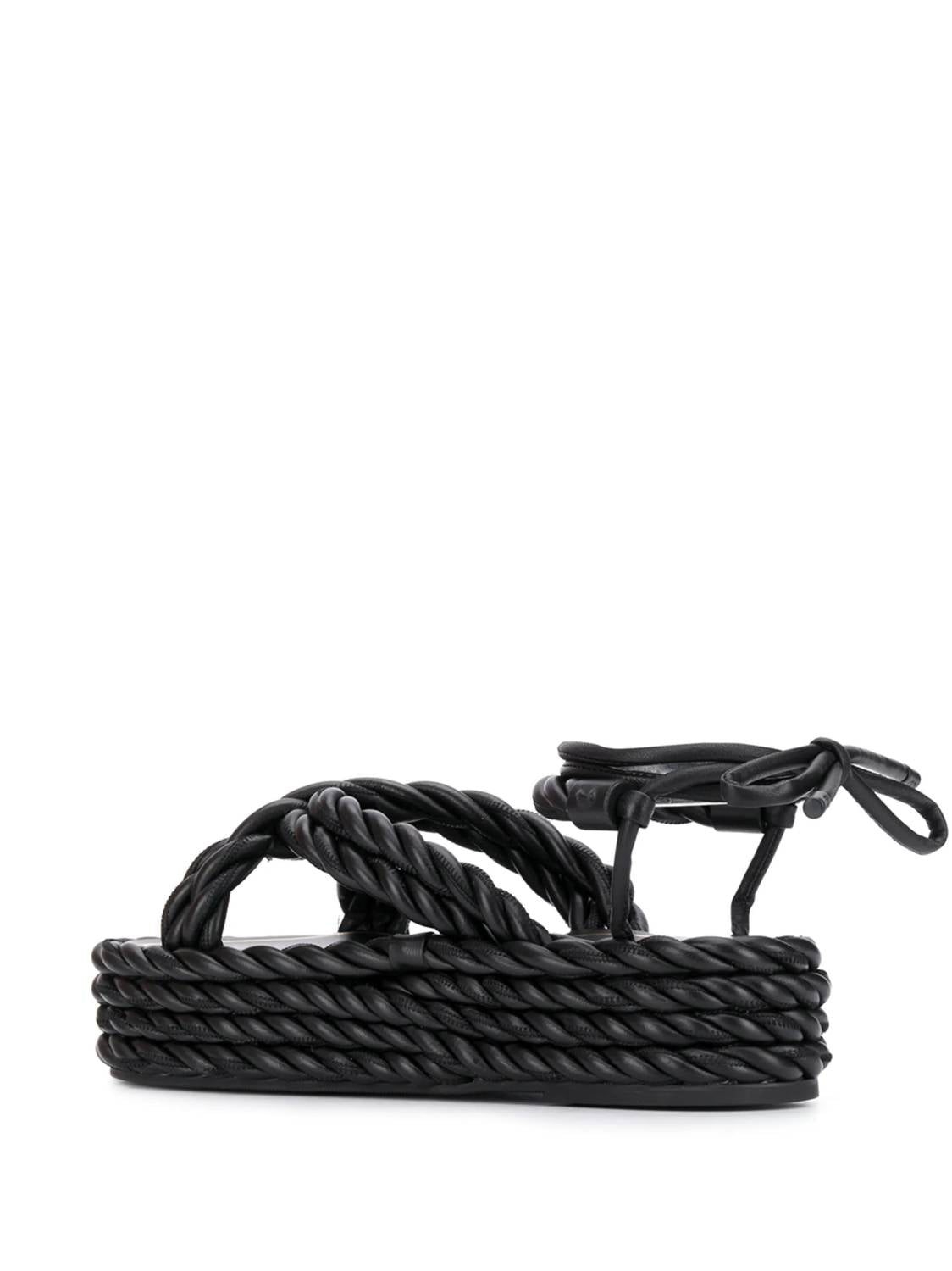 Classicly cute and all-day-wearable. We love this sandal. Step into elegance and comfort with the Women's Rope Wedge Sandals by Valentino Garavani, perfect for the spring season. Designed with an open toe and a back tie fastening, these chic black sandals are crafted from 100% lambskin leather with a rubber sole for durability. The woven effect adds a stylish touch, while the 5 cm heel and 4.5 cm sole height provide a balanced lift. Made in Italy, these sandals come with a branded insole to ensure luxury in every step.