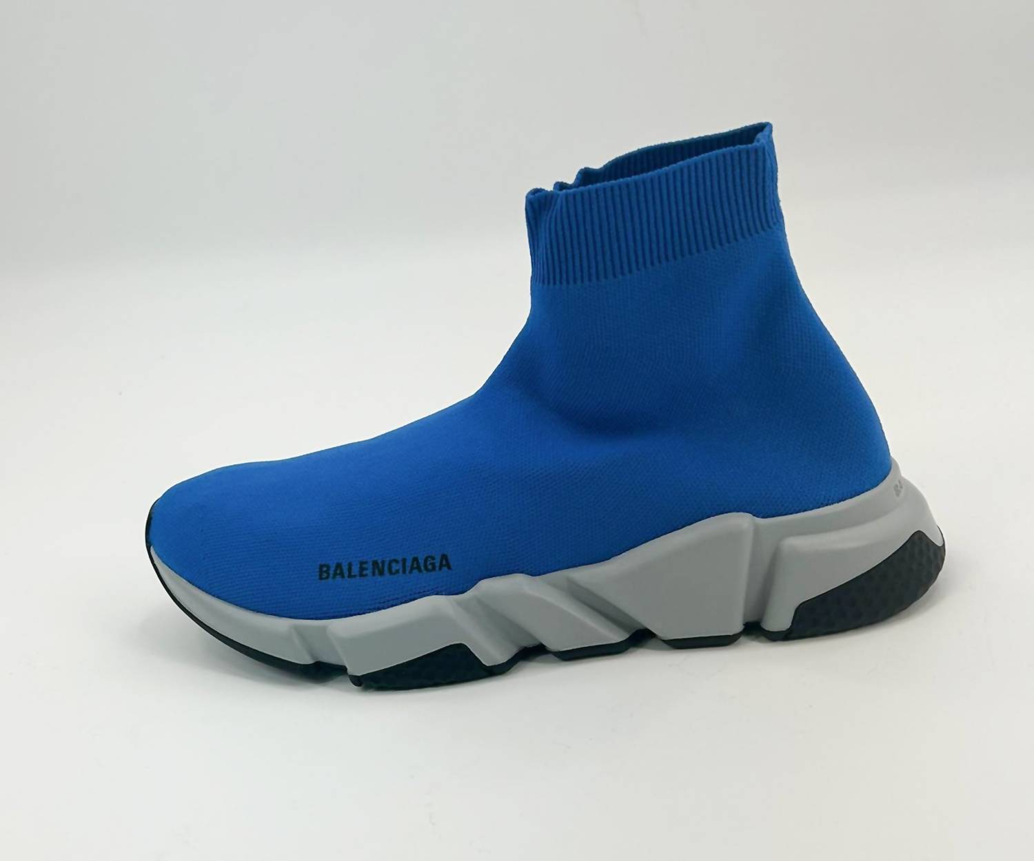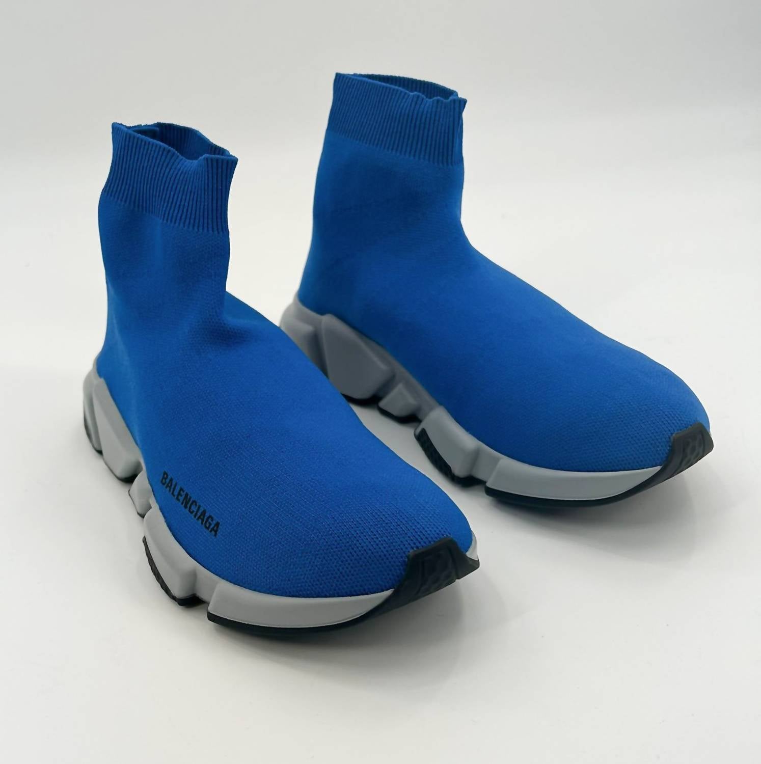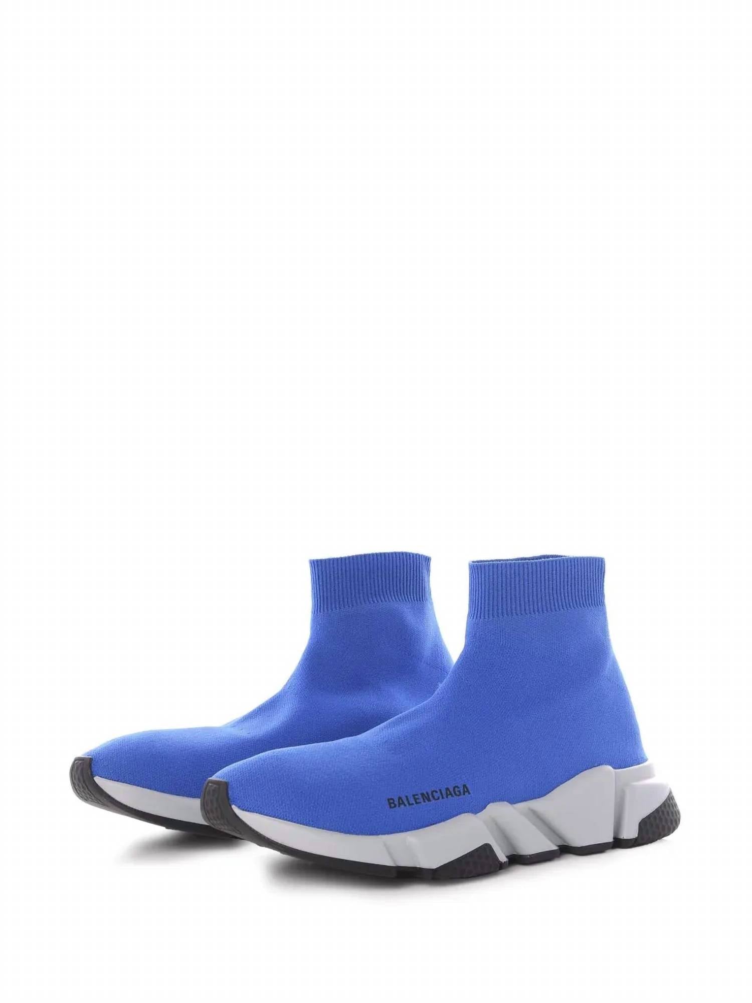 Introducing the Men's Speed Trainers Sneakers by Balenciaga, a standout piece in vibrant Mid Blue perfect for the athleisure trend. Crafted with a composition of 100% Elastane for the outer, 100% Fabric lining, and a chunky 100% Rubber sole, these ankle-length trainers provide a sleek fit with a pull-on style. Featuring ribbed detailing, a jacquard logo motif, and a branded insole, they marry comfort with style. Designed for versatility, these trainers suit both fitness workouts and festive New Year's Eve events, boasting a low heel height and a durable round toe.