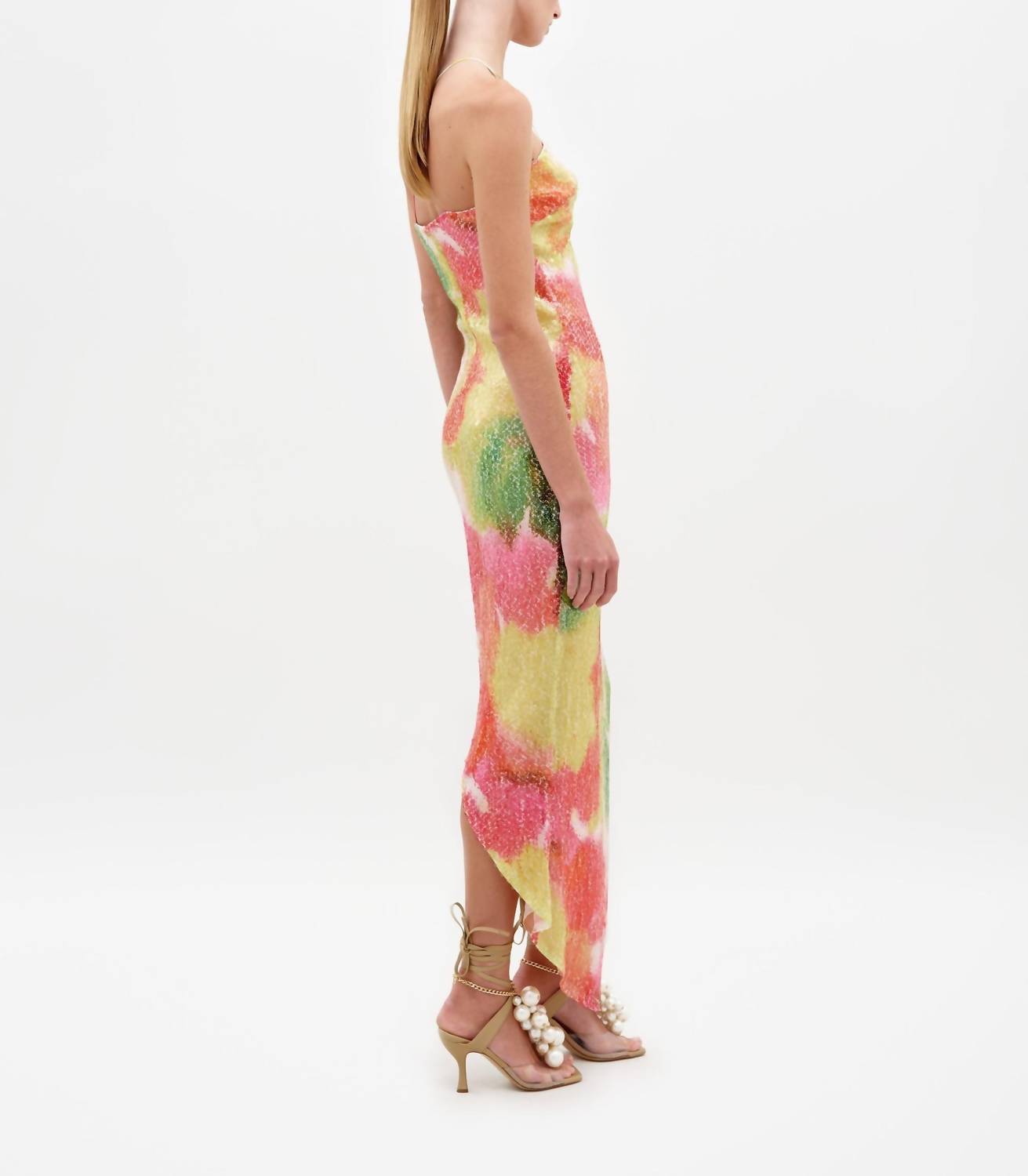 Just add slides or mules and you are good to go. Introducing the Lisseth Midi Dress by Silvia Tcherassi, a captivating piece perfect for your next holiday party. This sleeveless dress in the dreamy Spring Blooms color features a V-neckline and thin straps, exuding a boho chic allure. Made from Italian textile, it boasts a fitted silhouette with an asymmetrical hemline, crafted entirely from 100% polyester with a lining of 97% polyester and 3% elastane. Finished with a zip closure at the back, this Colombian-made dress requires dry cleaning to maintain its elegance.