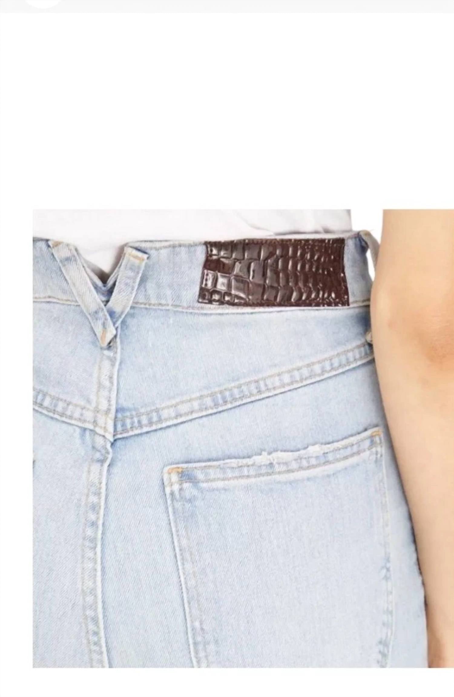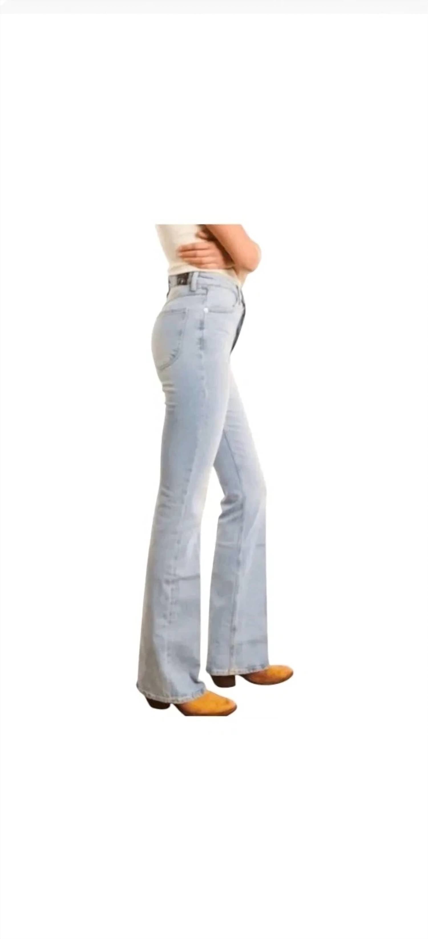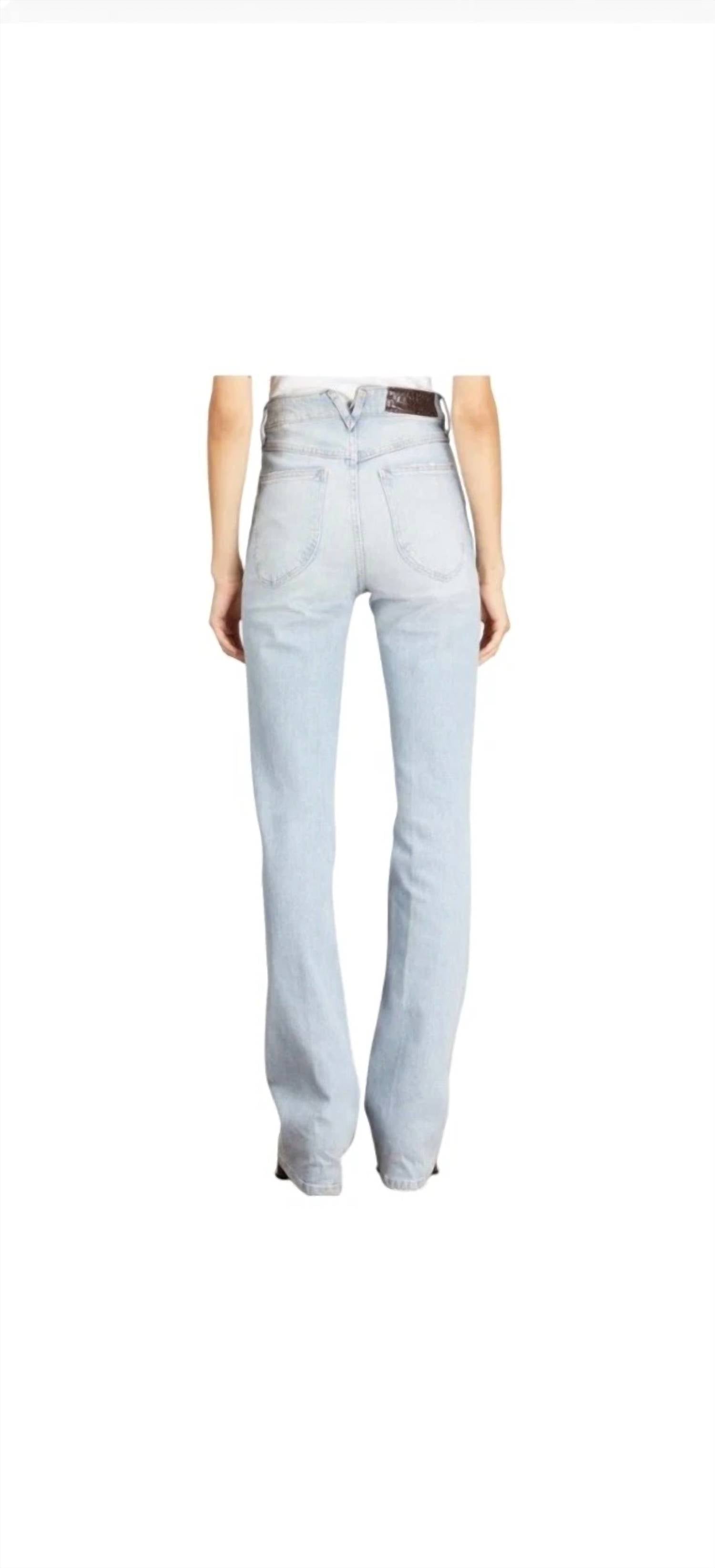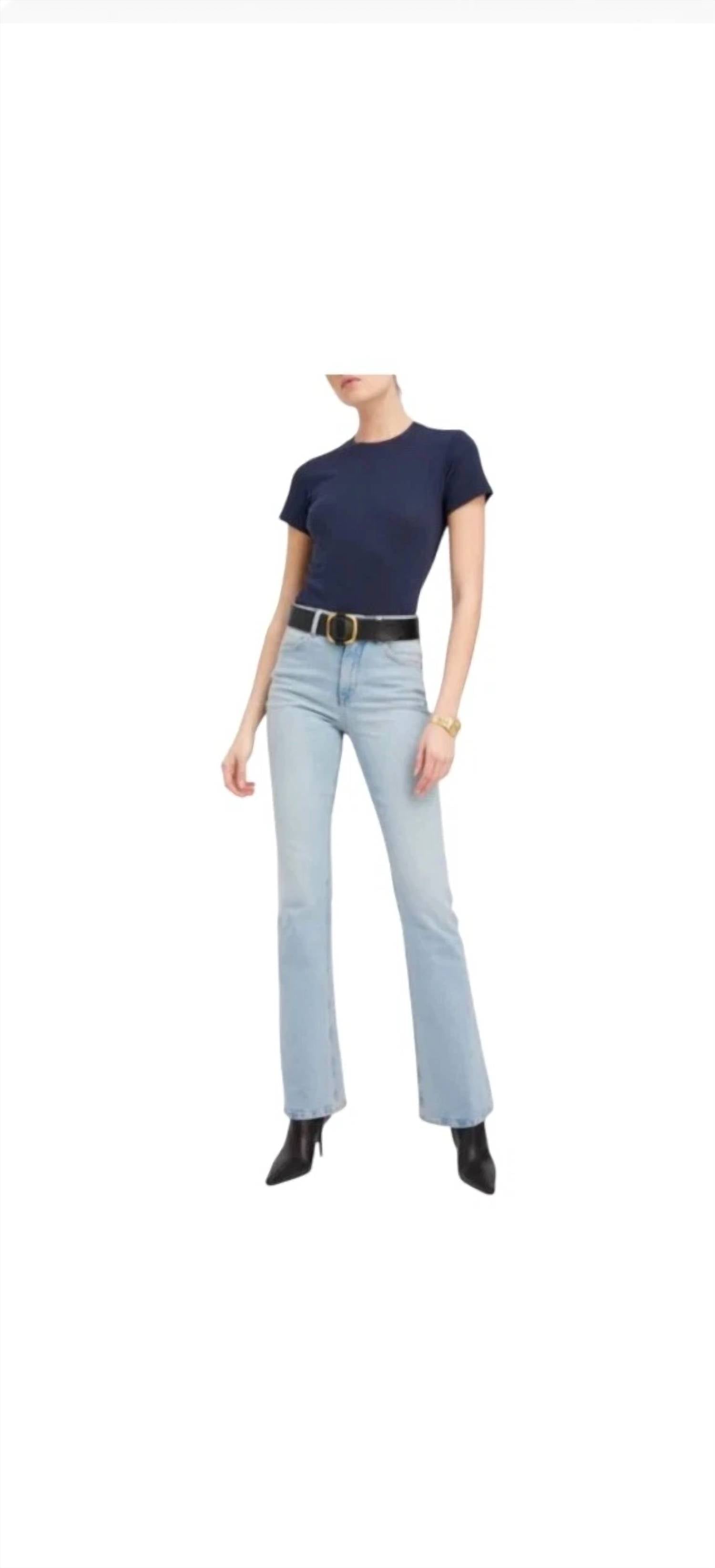 Just as cute as they are comfortable. Introducing the Micro Flare Jeans by SPRWMN, crafted in a classic Francoise faded light blue. These jeans feature a high rise waist and a slim fit with a narrow flare that extends past the ankle, boasting a 35" inseam for a leg-lengthening effect. Composed of a comfortable cotton blend, they come with a solid pattern, signature back V, and a chic faux-croc embossed label. Button closure. Machine wash and tumble dry. Waist rise measures at 11.5 inches for a flattering silhouette. 98% Cotton 2% Elastane.