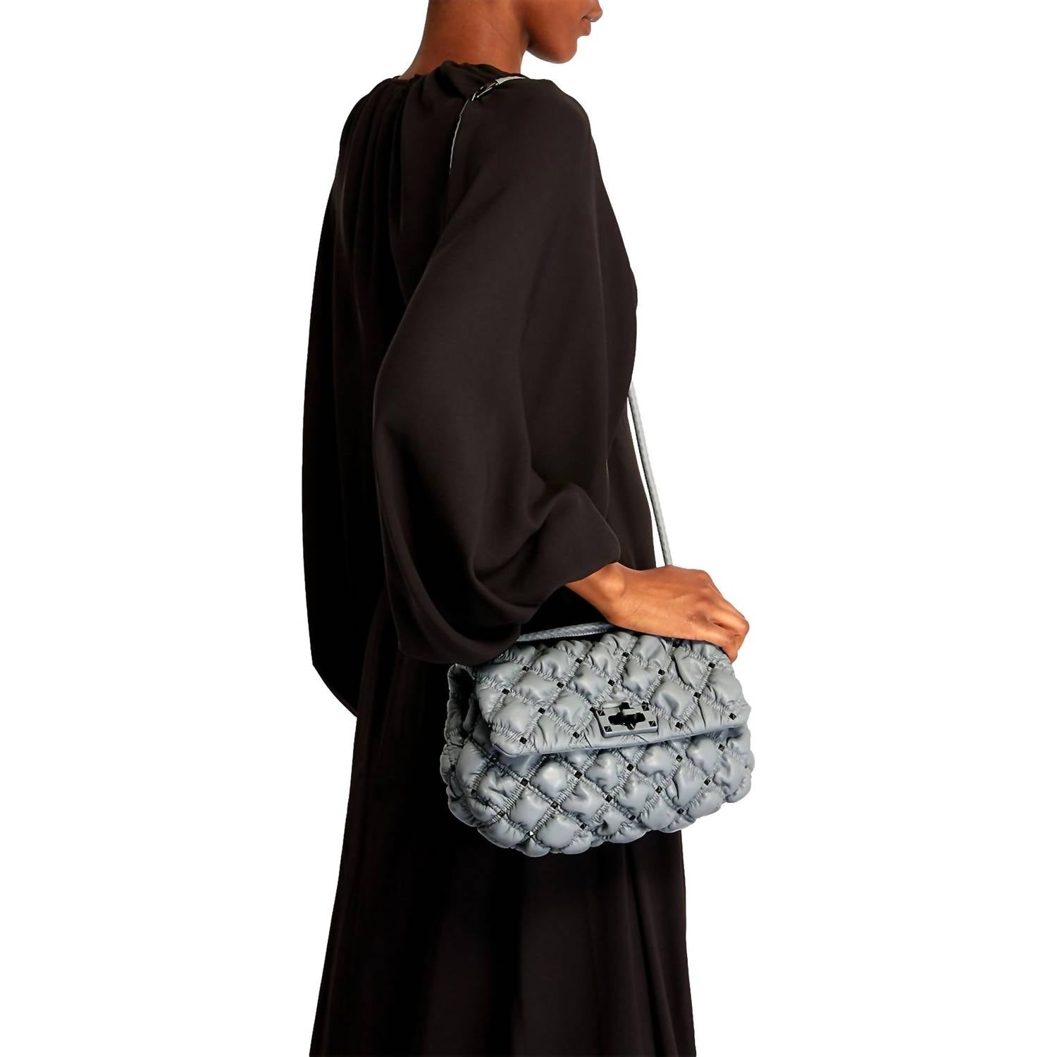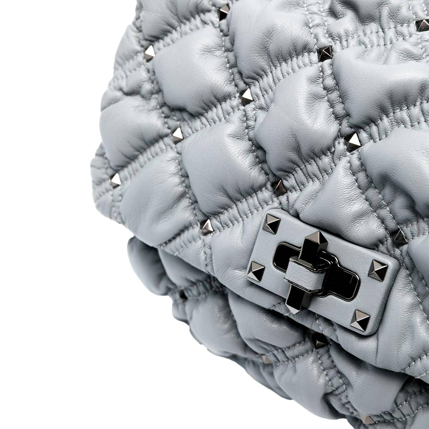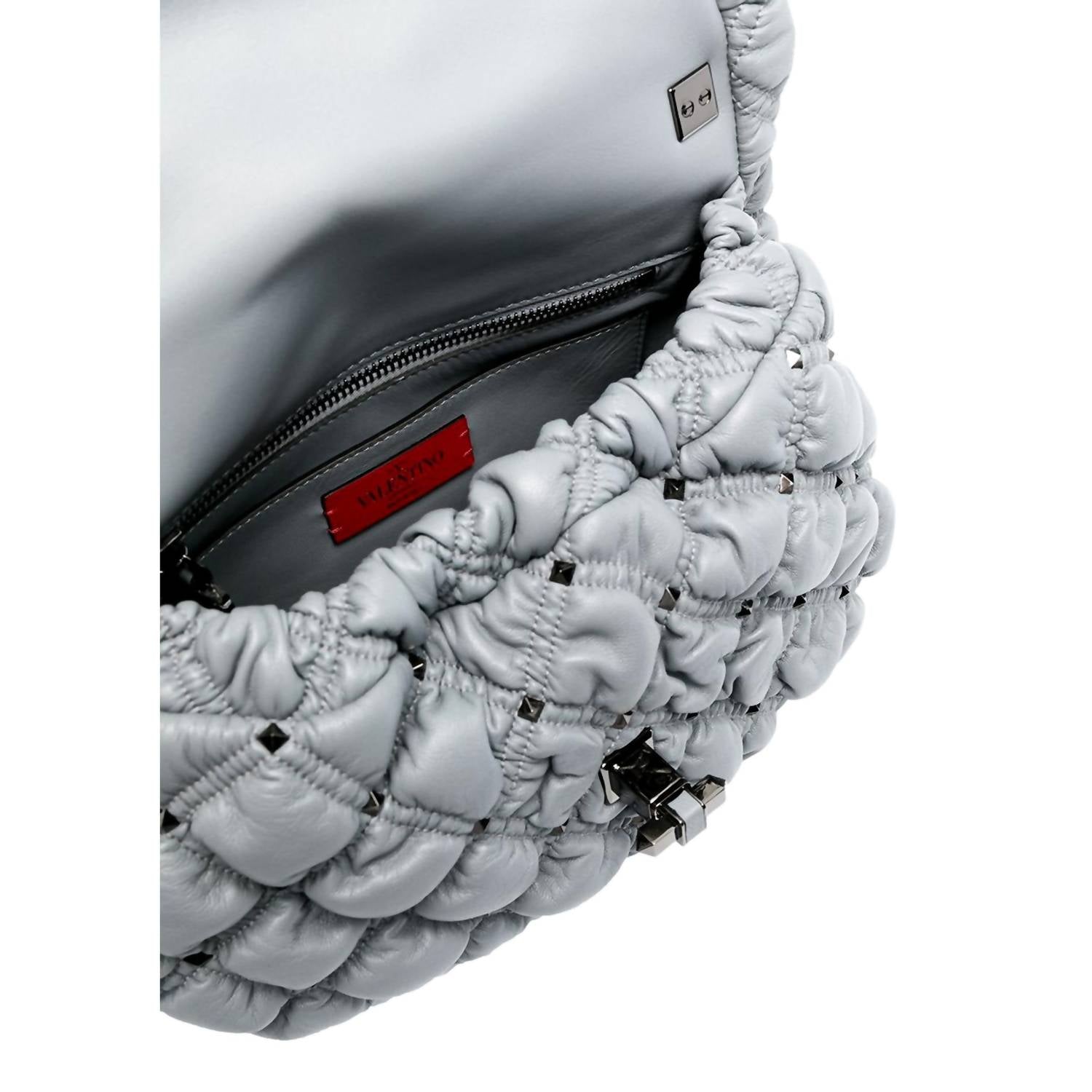 A casual and cute take on everyone's favorite crossbody bag. The Women's Spikeme Studded Leather Medium Crossbody Bag by Valentino Garavani is an exquisite Italian creation, made from gray quilted leather and adorned with eye-catching gunmetal studs. It features a studded twist-lock closure that secures a luxurious leather-lined interior with both a zipper and slip pocket, providing perfect organization for your essentials. This versatile piece can be worn as a crossbody with a 21.5" drop or elegantly carried as a shoulder bag with a 12" drop, thanks to its detachable strap. Measuring 11.9"L x 7"H x 4.5"W, it also comes with authenticity cards and a dust bag for added value.