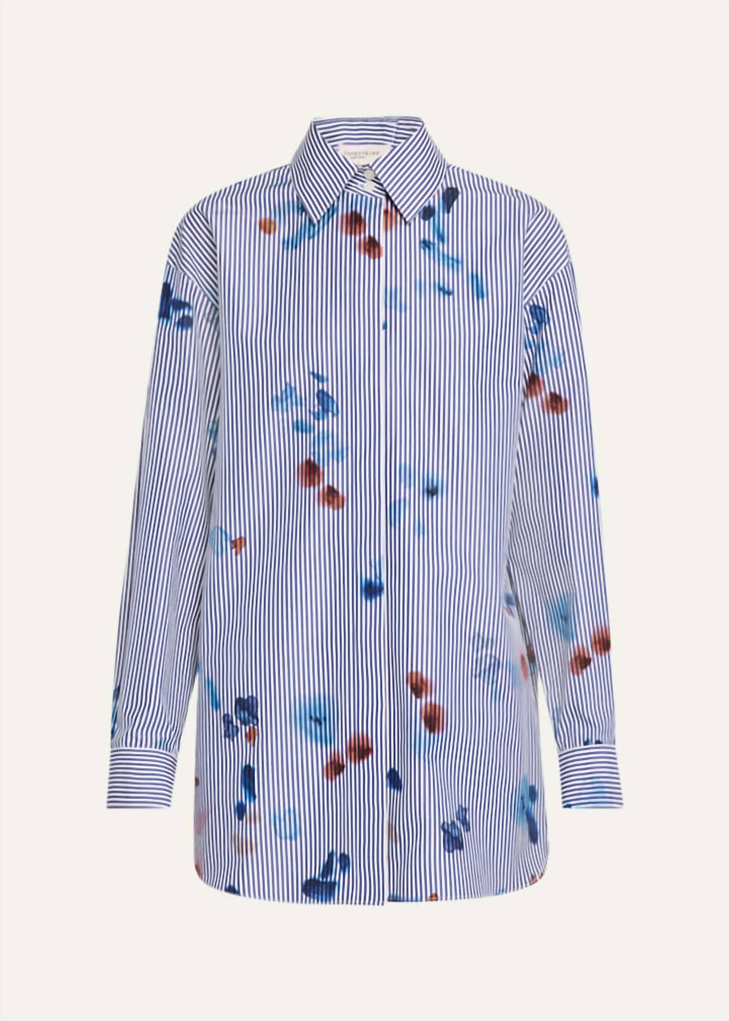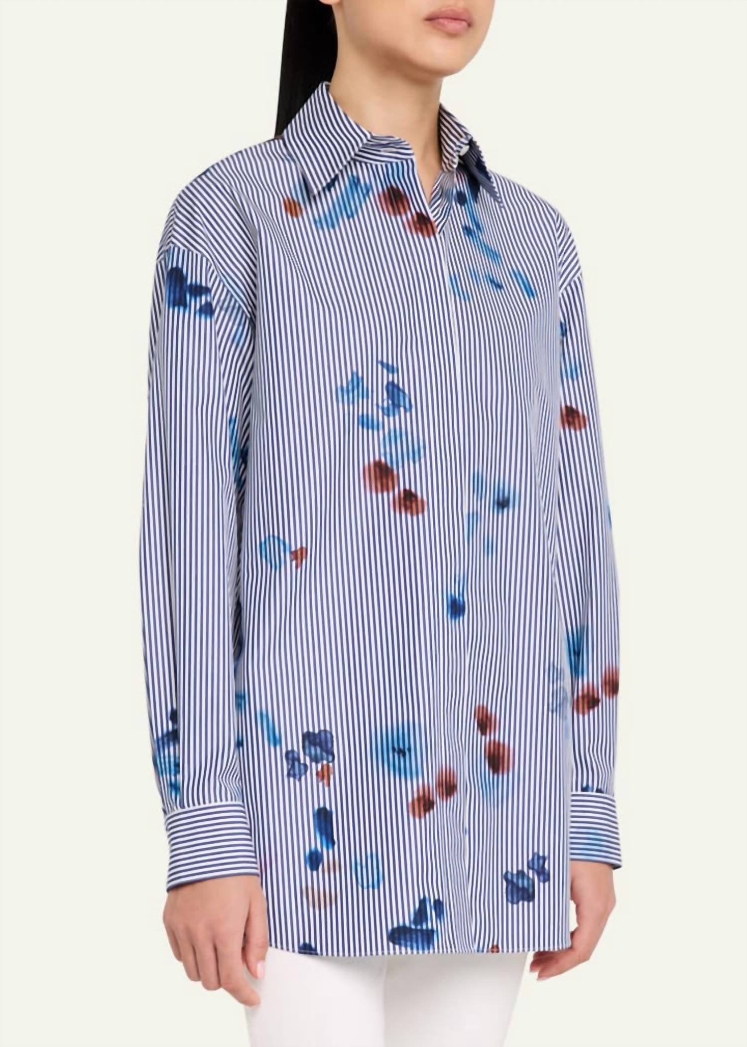 Great fit, cute design, soft fabric. You'll love everything about this long sleeve tee. The Portrait Shirt by Lafayette 148 is a chic addition to any wardrobe, offering a sophisticated look in Sky Multi with a patterned design. This women's long sleeve piece is composed of 100% cotton, measuring at a garment length of 30.5 inches (size S). Featuring a point collar with a concealed button front, the shirt includes button closures at the front, back, and cuffs. Originating from an imported line, it's designed for a relaxed, oversized fit and should be dry cleaned for care.