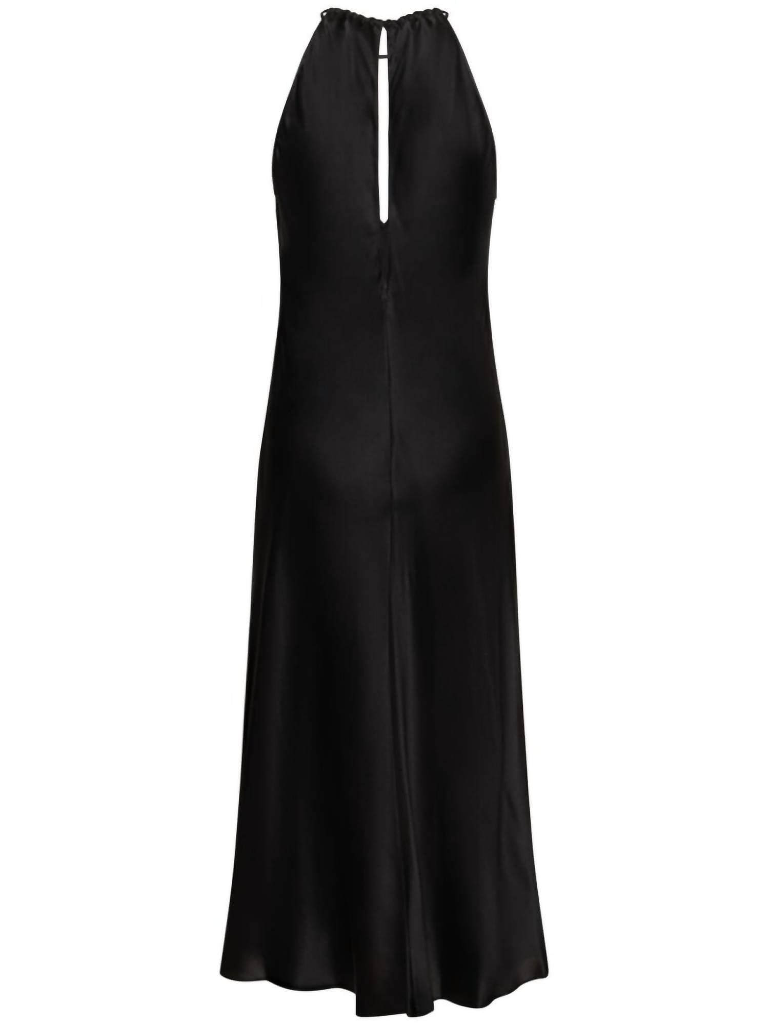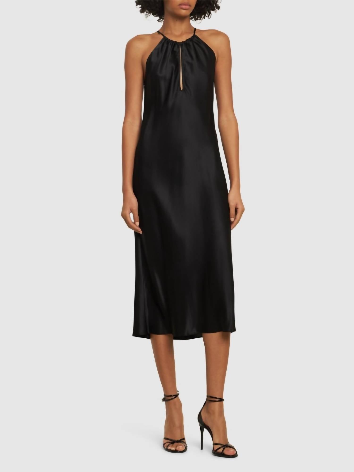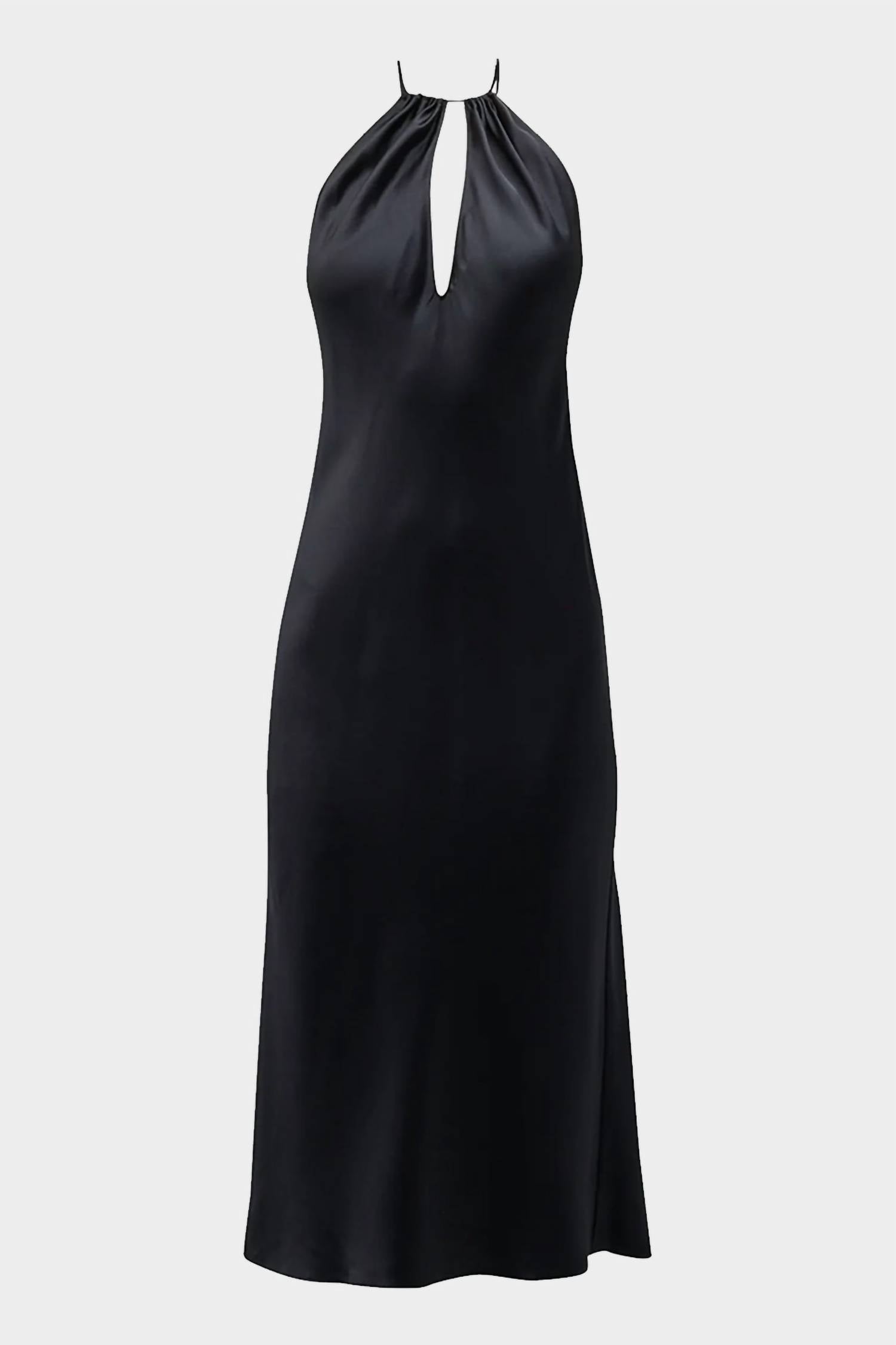 The perfect length dress does exist. The Eglantine Halterneck Midi Dress by Nili Lotan features a sleeveless design in luxurious 100% silk, offering a smooth, elegant silhouette. This midi dress is made in the USA and showcases a sophisticated halter neckline with chic front and back cutouts. It has a concealed side zipper closure for a seamless fit, perfect for cocktail parties or New Year's Eve celebrations. For care, this timeless piece should be dry cleaned to maintain its pristine condition.