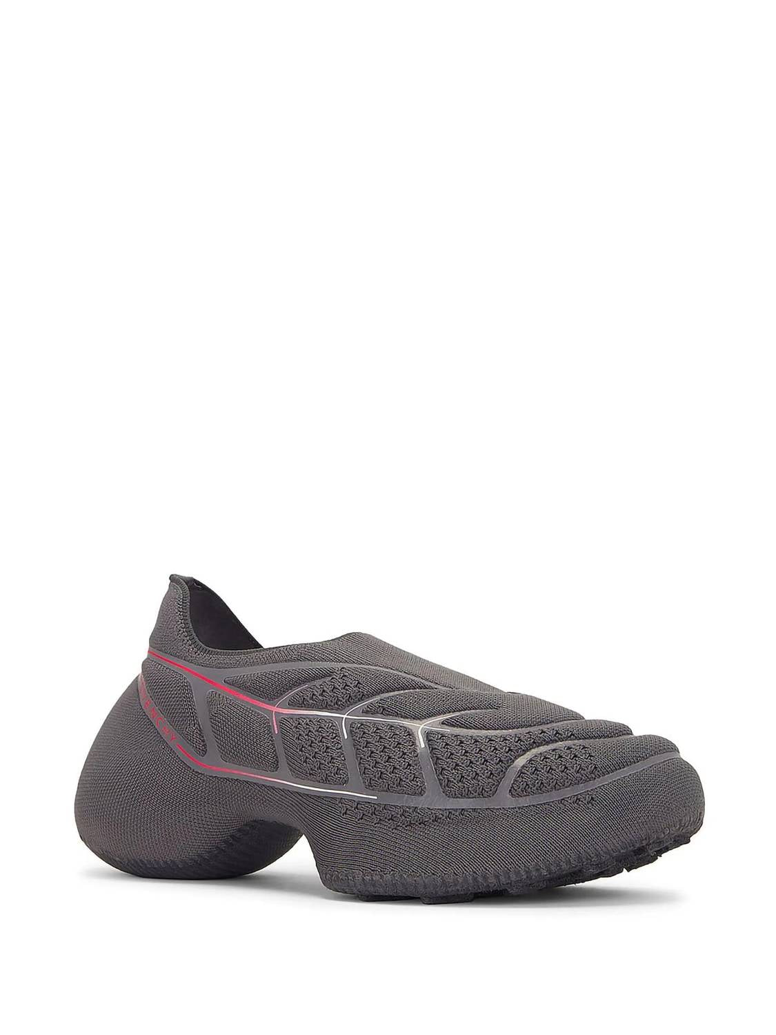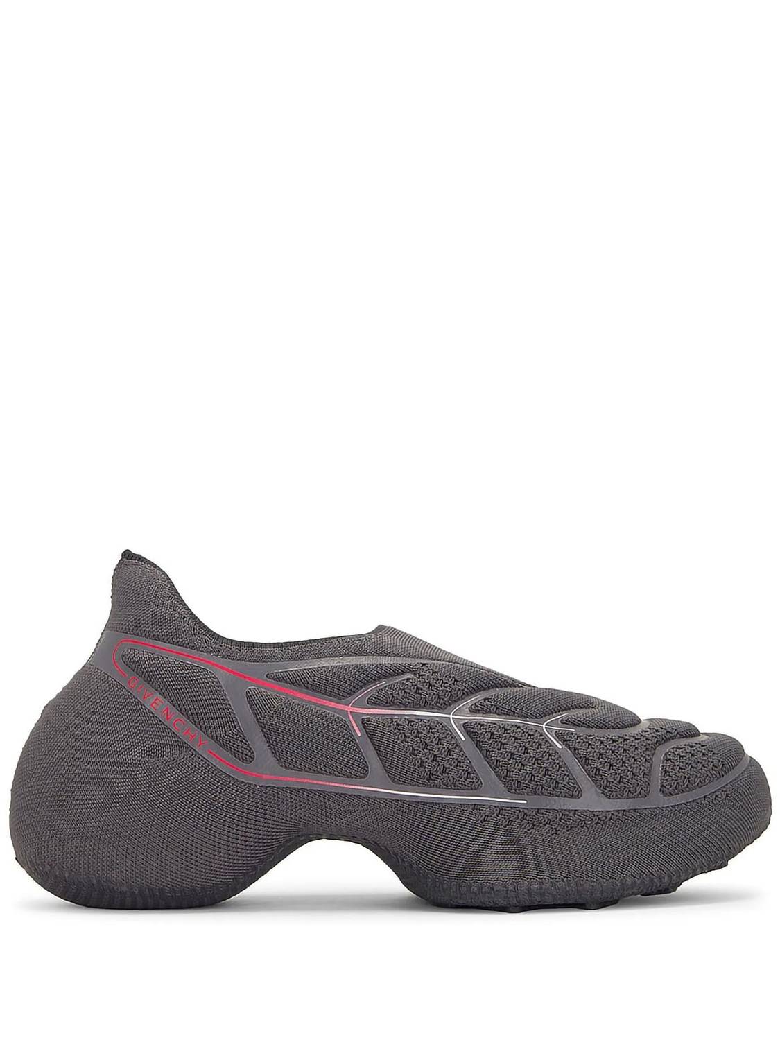 Experience the style and comfort of the Givenchy TK-360 Plus Sneakers, a standout footwear choice for summer and perfect for New Year's Eve celebrations. With a slip-on style that boasts a knitted construction and all-over graphic print, they offer both convenience and bold aesthetics. The sneakers are crafted from 80% polyester and 20% polyurethane for the upper, with a round toe and sturdy rubber outsole providing durability and support. Designed in trendy grey and red, these sneakers are ideal for men's travel occasions.