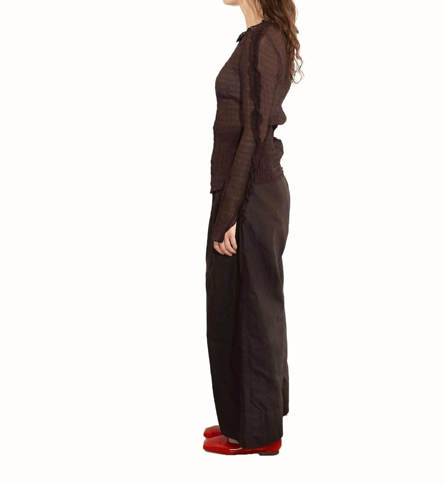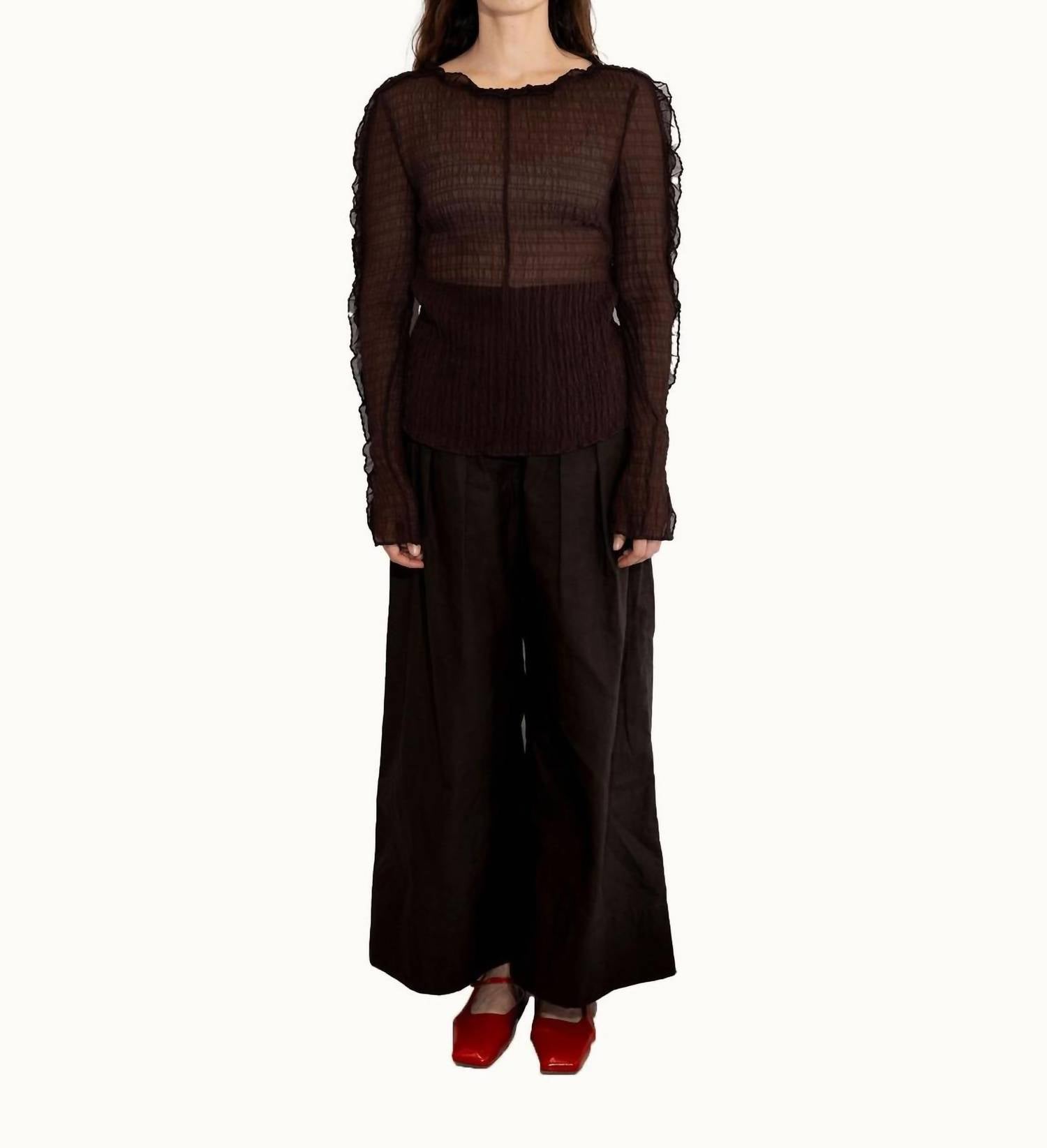 Embrace timeless elegance with the Reno Top by RACHEL COMEY, a chic addition to your wardrobe in a sophisticated brown hue. Crafted from a luxurious 96% Silk and 4% Elastane blend, this long sleeve blouse features an airy, puckered texture with ruffle detailing along the crewneck and arms. The pull-on closure allows for effortless wear, while its subtle transparency adds an ethereal touch perfect for a fall dinner party. Ideal for those who appreciate minimalist trends, this textured blouse embodies refined style.