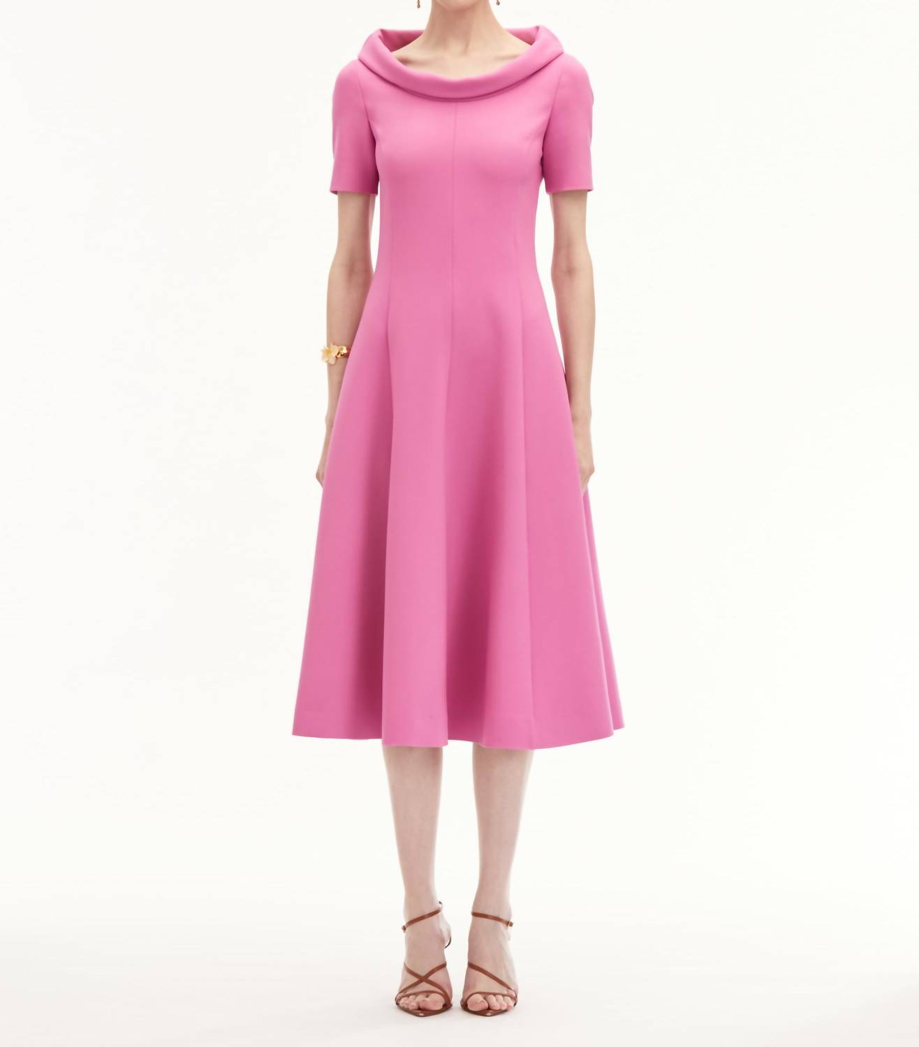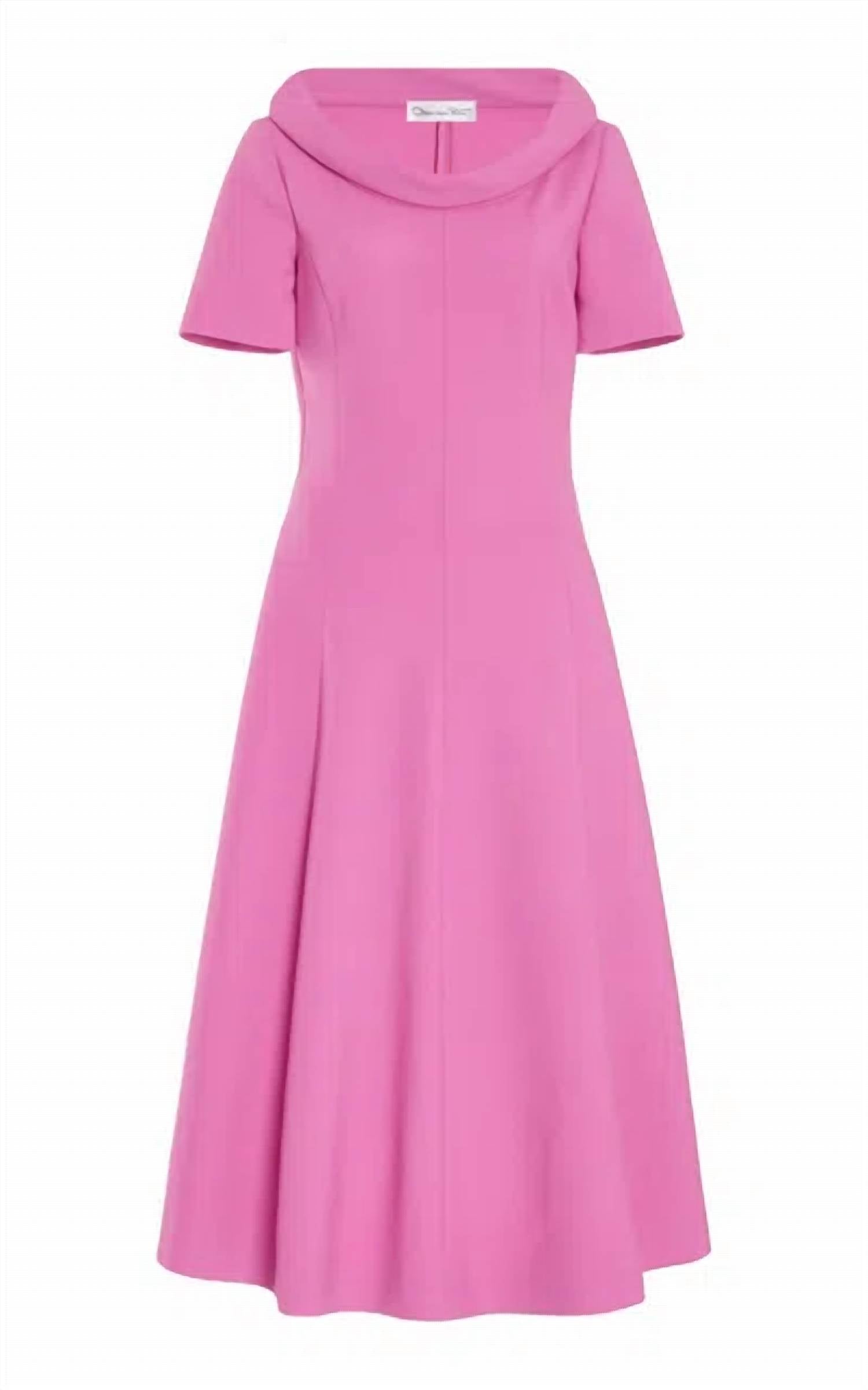 The perfect length dress does exist. Embrace effortless elegance with the Oscar de la Renta Short Sleeve Funnel Neck Dress in a striking Rosehip shade. Tailored in a luxurious wool blend, this A-line midi dress offers a sophisticated silhouette with its paneled bodice and chic funnel neck. It features short sleeves and a concealed zip at the back, complemented by a removable coordinating belt for added refinement. Composition: 94% wool, 5% elastane, 1% other fibers. Care: Hand wash and lay flat to dry. Perfect for a holiday party or spring workwear, this dress embodies timeless style.