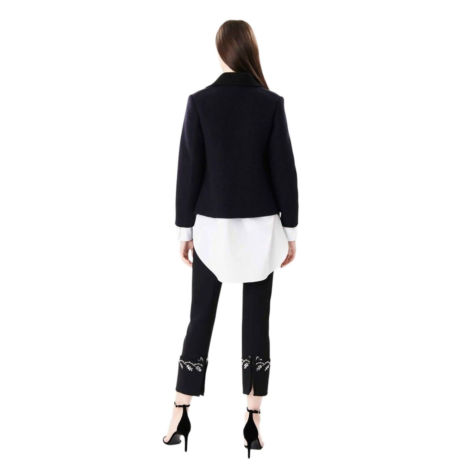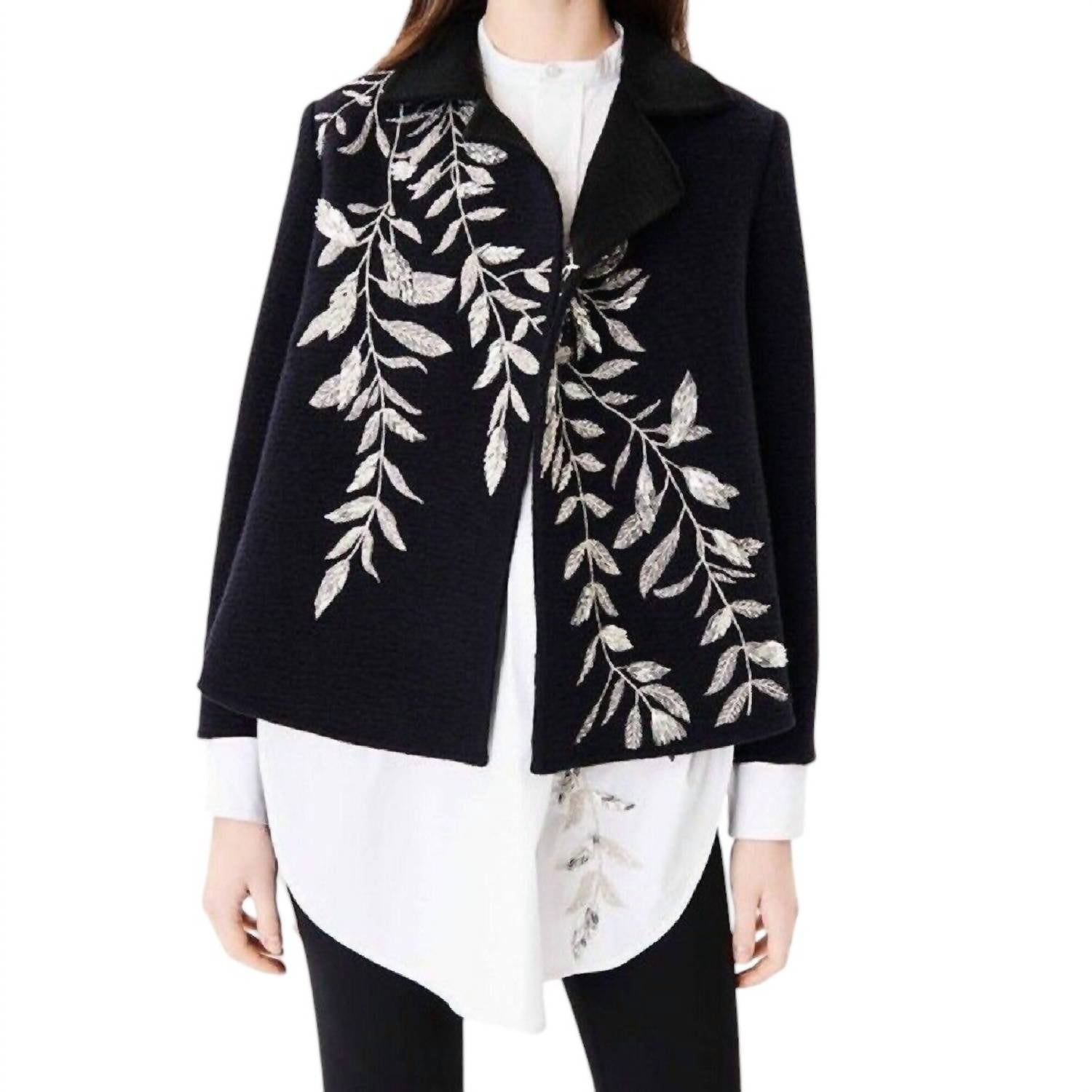 Experience the epitome of luxury with this Beaded Embroidery Open Front Wool Blazer by Oscar de la Renta. This stunning black blazer features long sleeves and is crafted from ultra-soft wool. Its elegant open front is adorned with oversized panels and exquisite silver-tone embroidery with beading, showcasing a distinct branch motif. Measuring 23.5" in length from shoulder to hem and with a shoulder width of 16", this unlined piece offers a sophisticated style while maintaining a beautiful silhouette.