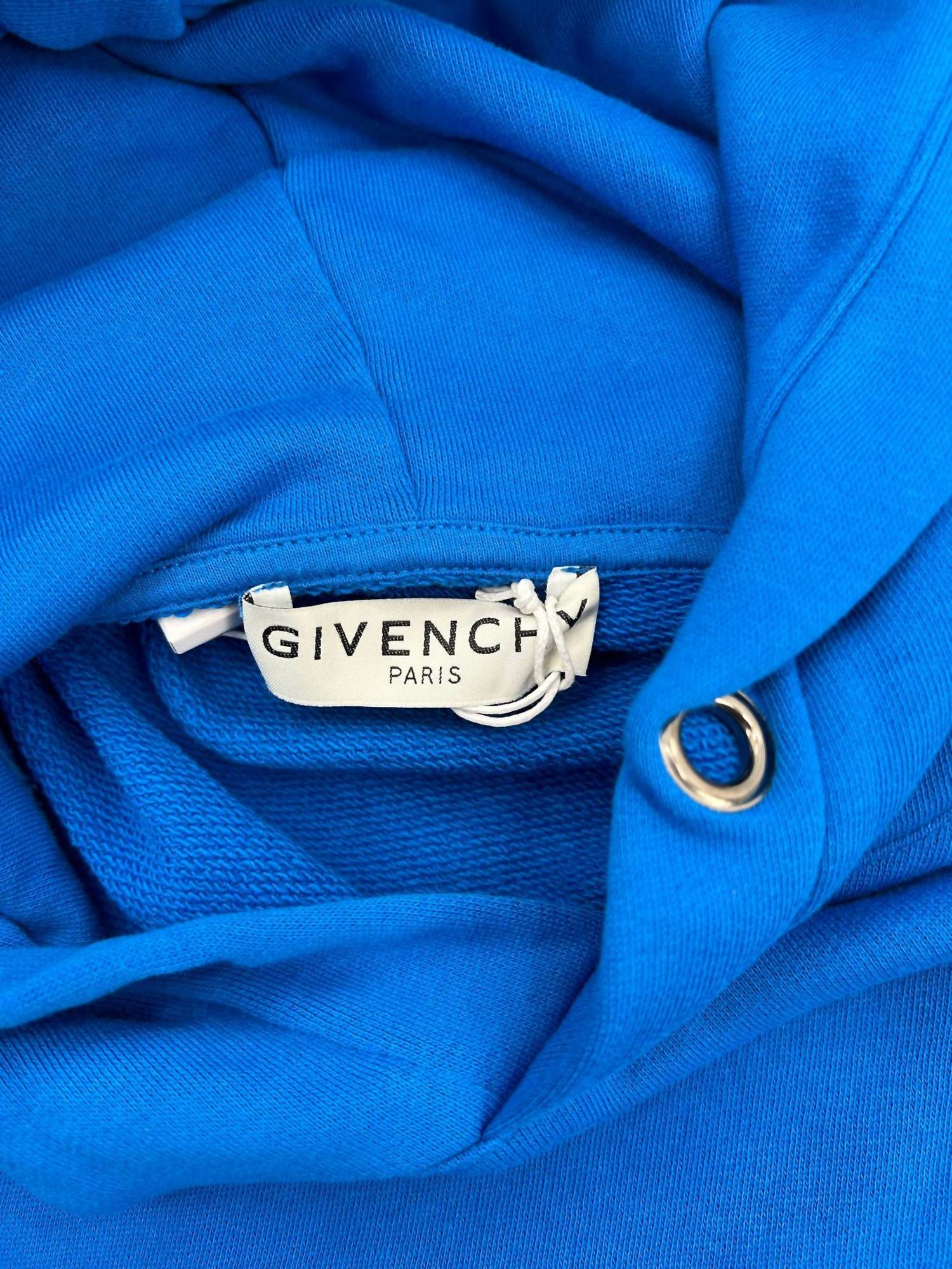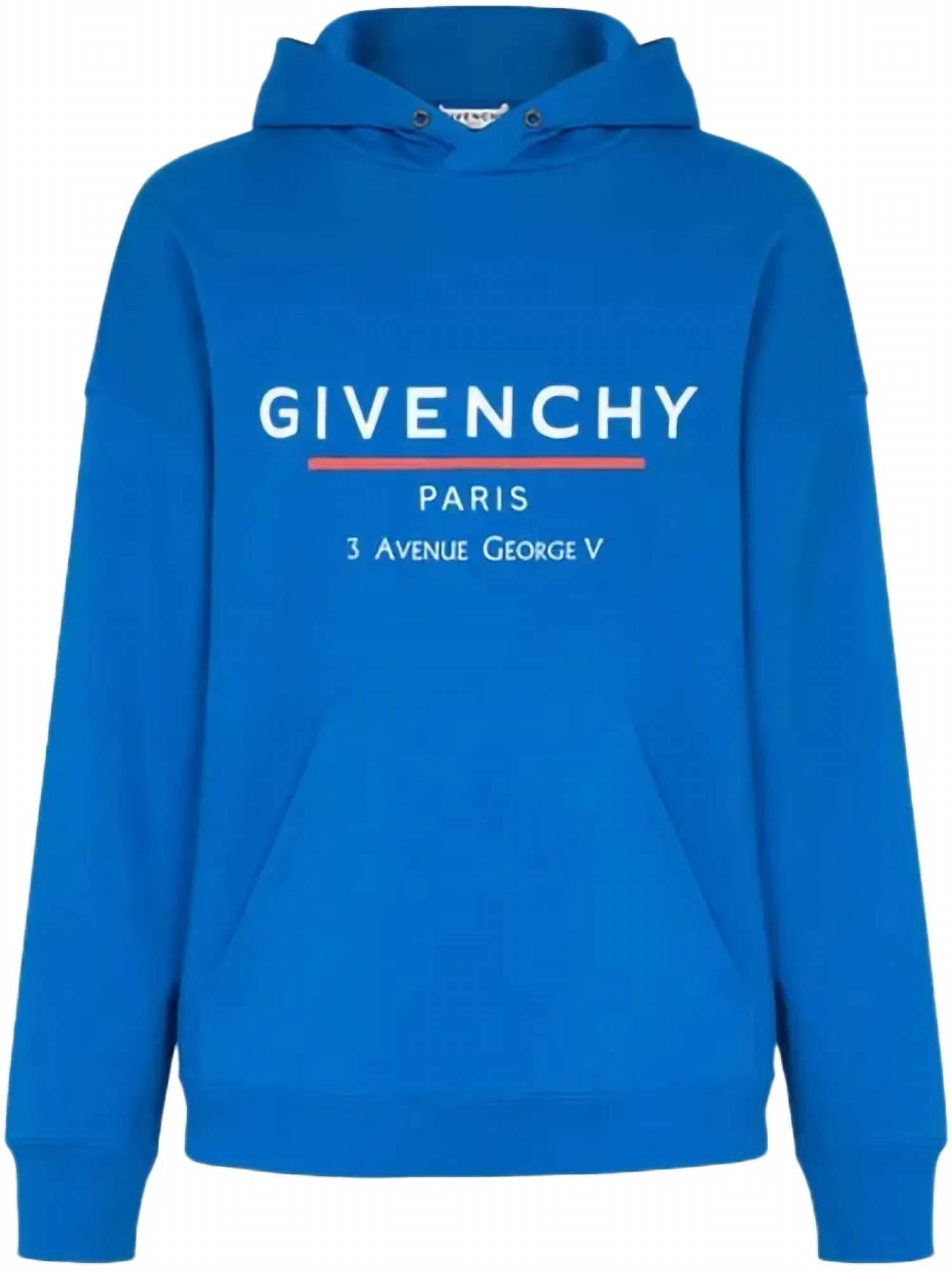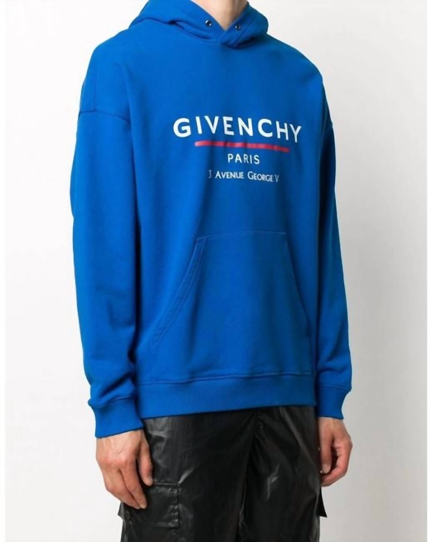 Elevate your wardrobe with Givenchy's Men's Address Hoodie in Ocean Blue, an epitome of luxury and comfort. Crafted from 100% pure cotton jersey, this piece boasts a striking white "Givenchy" logo across the chest, celebrating the brand's heritage with style. It features long sleeves, a fitted hood, and a practical front pouch pocket, all finished with ribbed trims for a sleek look. Designed with a pull-on closure, it was made in Portugal, offering a preppy staple for any fashion connoisseur.