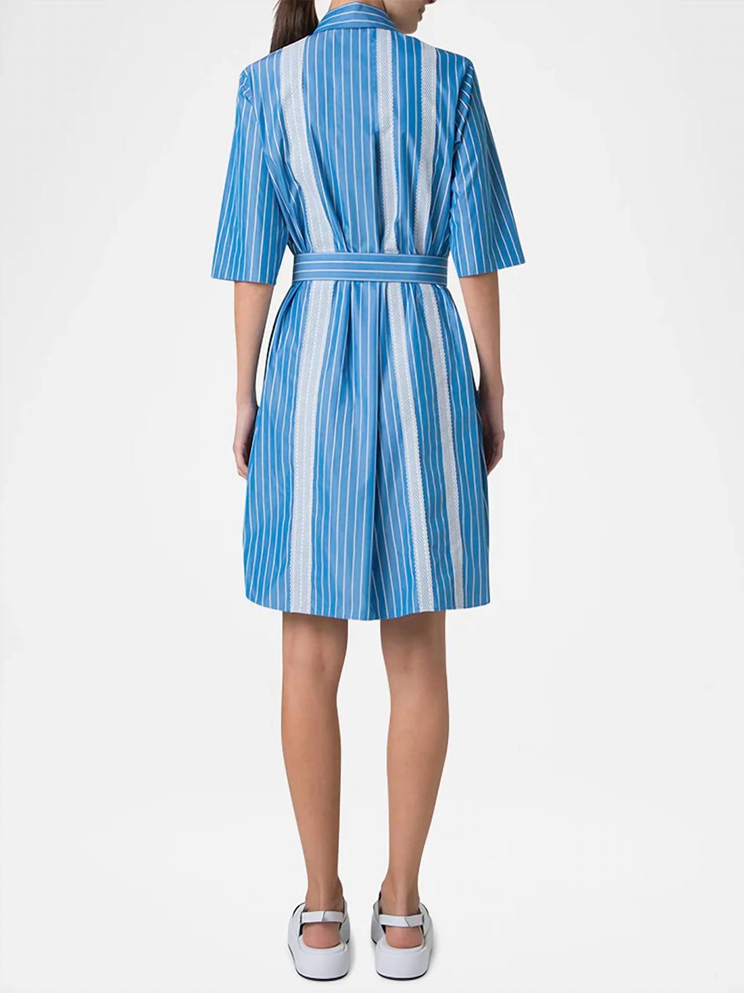 The kind of easy and flattering dress you'll be reaching for all season long. Presenting the Pajama Stripe Mandarin Collar Shirt Dress by AKRIS PUNTO, a chic addition in Medium Blue/Cream perfect for summer. Crafted from 100% Cotton, this knee-length dress features elbow sleeves and a stylish stripe pattern. Designed with practical side slit pockets and a figure-flattering D-ring self-belt, it offers a concealed button closure. Care is simple with dry cleaning instructions for optimal garment longevity.