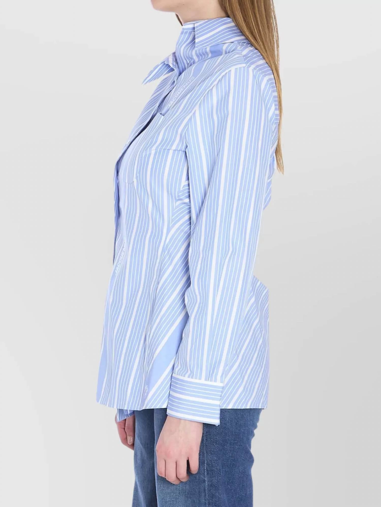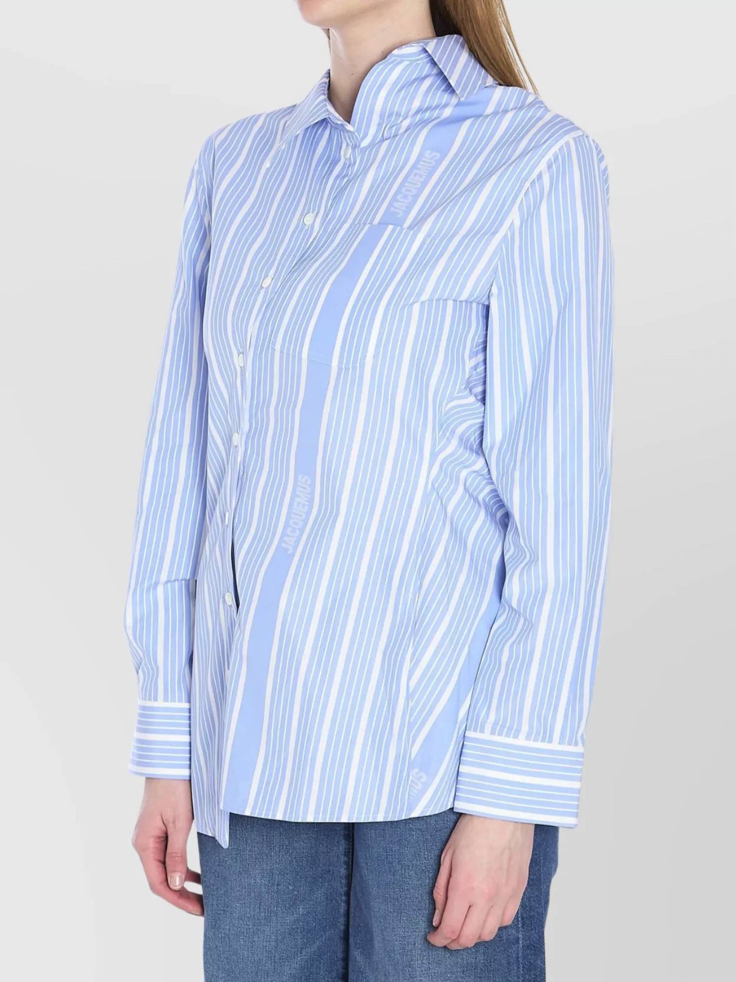 Introducing the Jacquemus La Chemise Pablo, a chic addition to your workwear wardrobe in Jacquard Business Big Logo Stripes Beige/White. This button-down shirt showcases long sleeves and a unique asymmetric design, featuring an asymmetric pointed collar, button placket, and hem. Crafted from 100% Cotton poplin, it offers a straight fit and includes an eye-catching "J" shaped chest pocket and mother-of-pearl buttons. Made in Bulgaria, this piece is perfect for elevating your summer office looks. The model is 177cm and wears a size 34.
