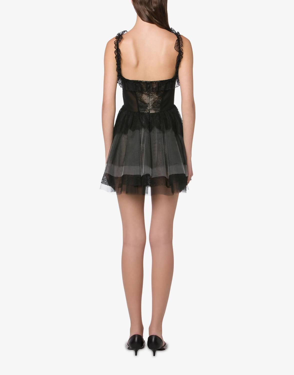 Lace minidress with slip inspired by the world of lingerie. Tulle and lace veils give volume to the skirt. 100% Polyamide. Made in Italy.