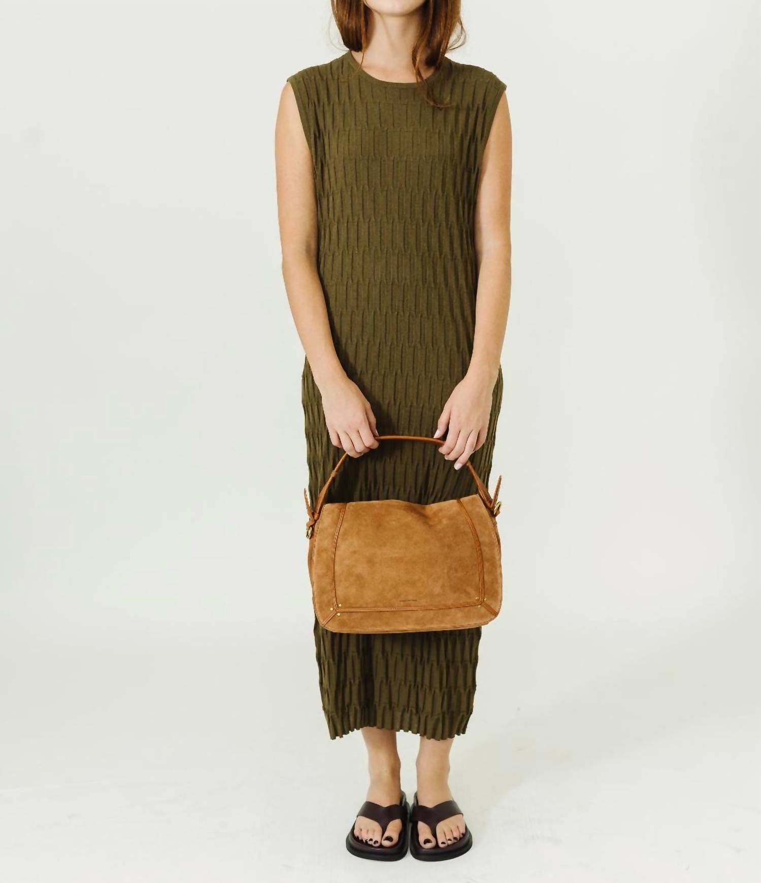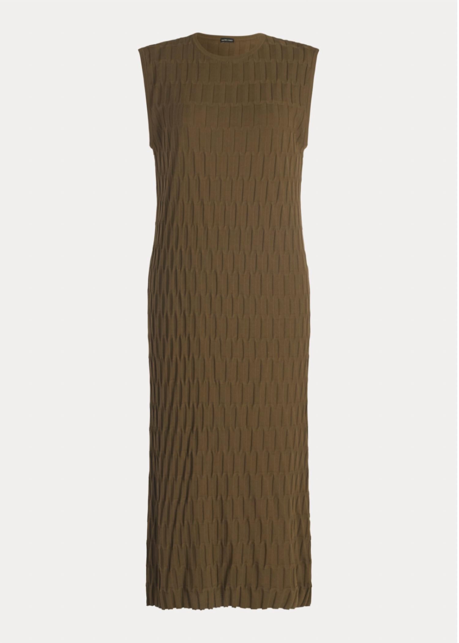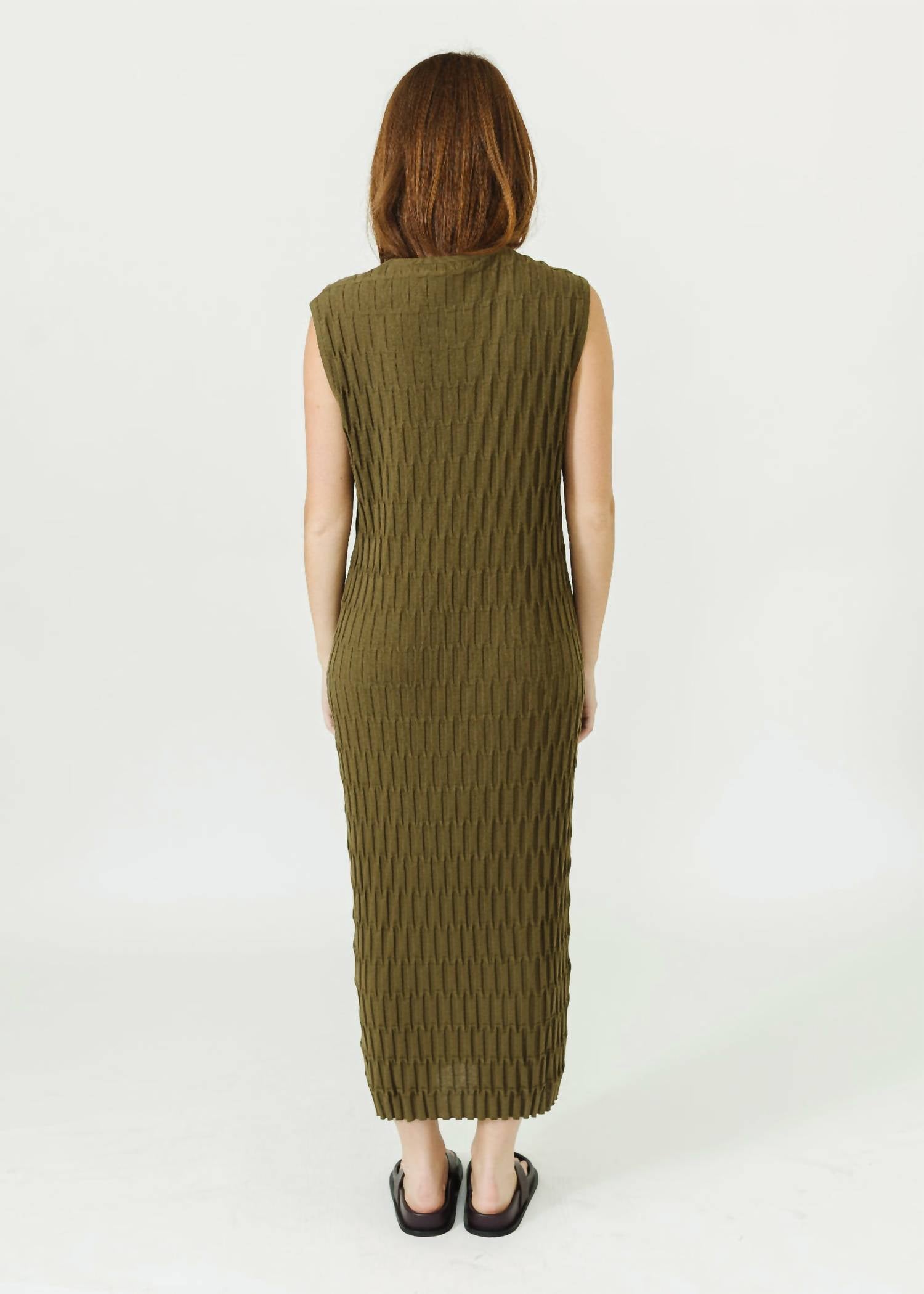 Pair with your favorite sandals for an effortlessly chic look. The Rachel Comey Kitsey Sleeveless Midi Dress in Olive is a perfect blend of form and function for the modern woman. Crafted from 100% cotton, this dress features a sophisticated textured plissé knit that provides remarkable breathability. Its clean sheath silhouette and pull-on closure offer seamless transition from day to evening, making it ideal for various occasions. Made in Hong Kong, the dress is machine washable, ensuring easy care and maintenance.