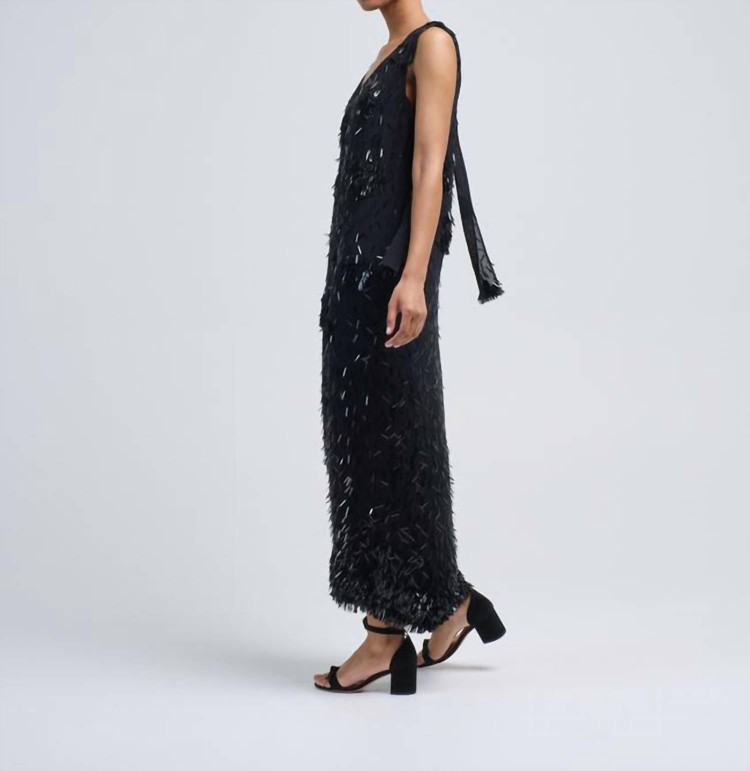 Who doesn't love a good maxi dress? This one you'll be reaching for season after season. This sleeveless dress is crafted from 100% viscose and features a deep V-neckline accented with tied shoulder details for a refined touch. Hand-sewn bead embellishments add subtle sparkle, while a concealed back zip ensures a sleek finish. Designed in a full-length silhouette, it offers timeless elegance for any occasion.