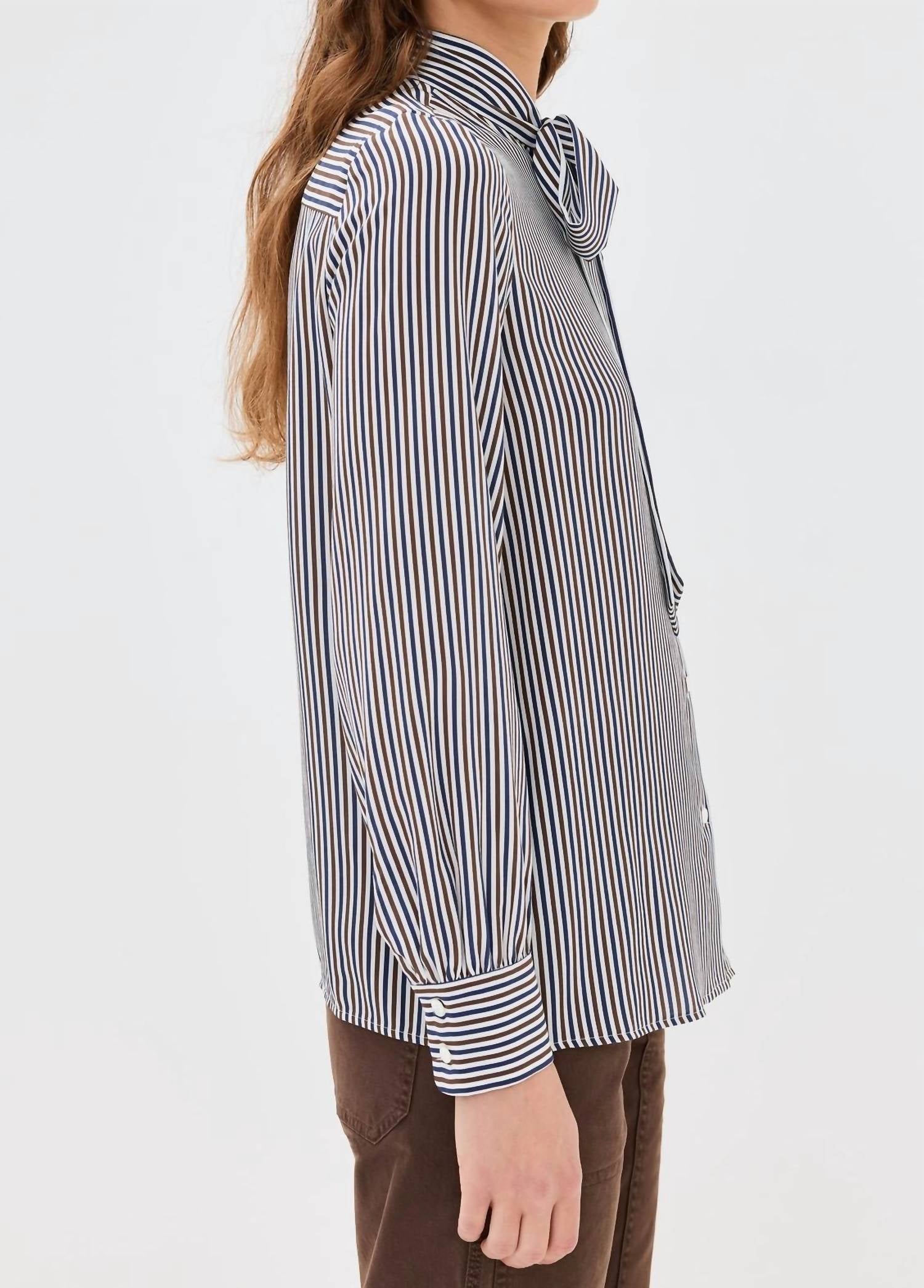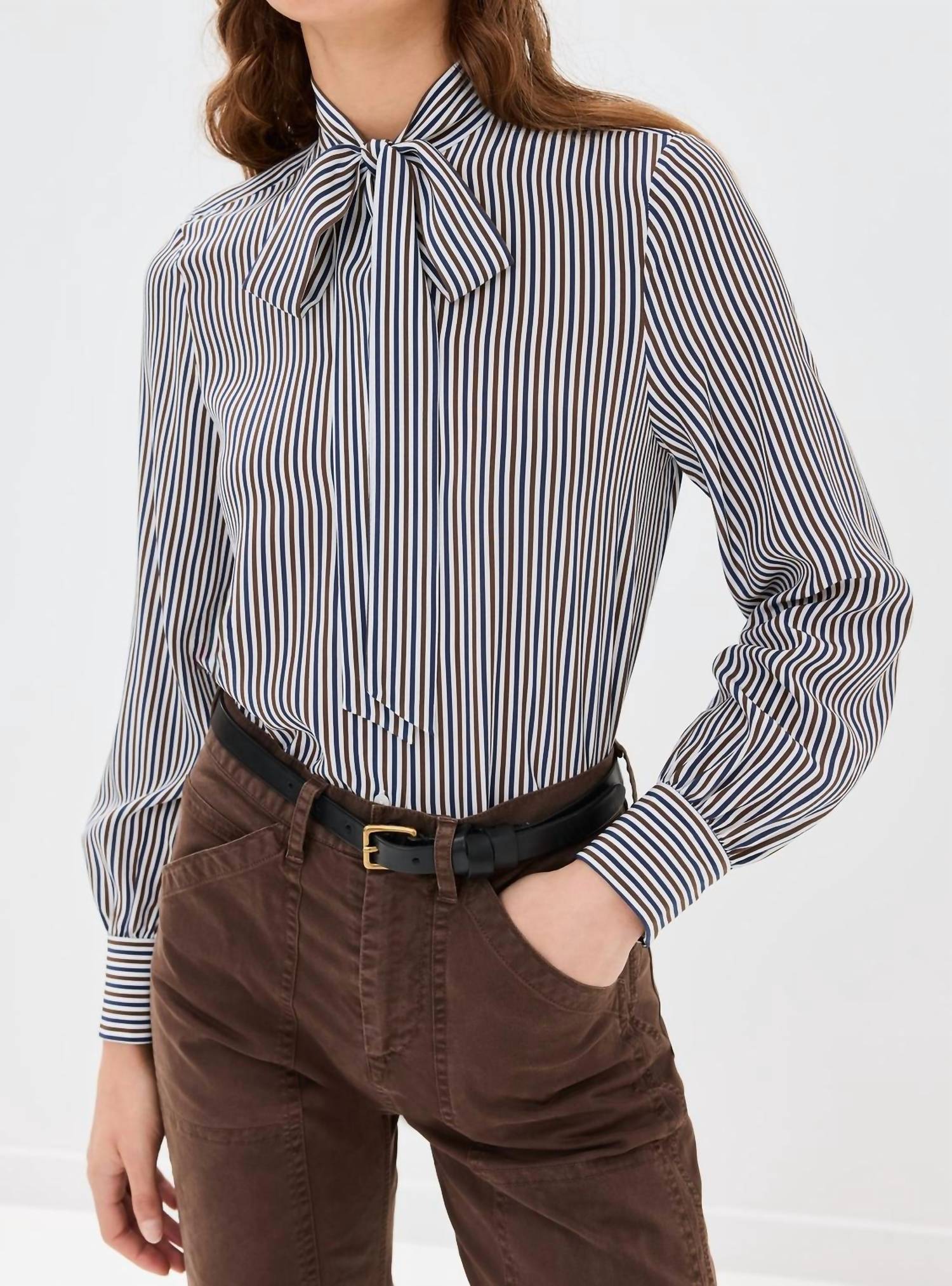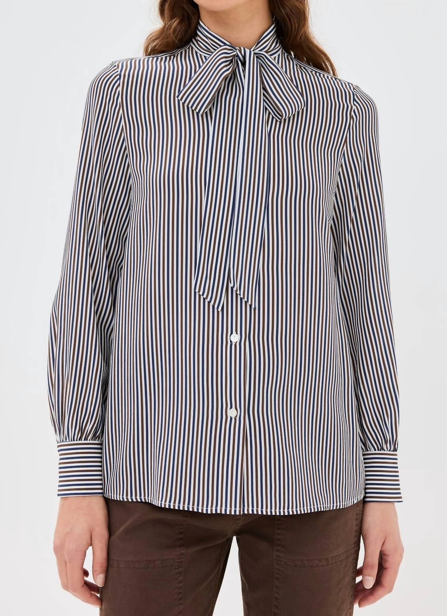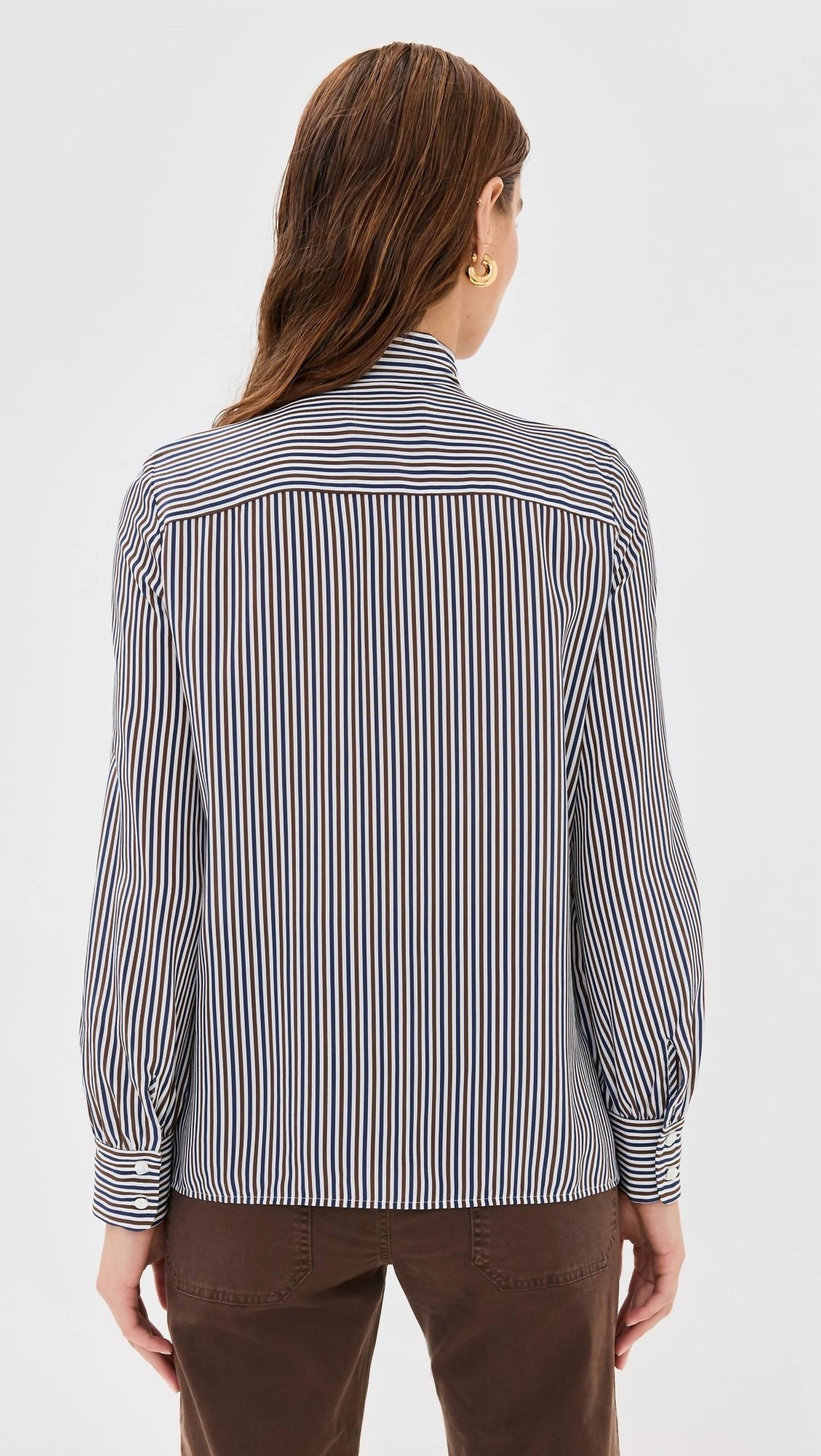 Perfectly tailored and soft to the touch. Introducing the Carina Top by NILI LOTAN, a refined addition to your workwear wardrobe in an elegant ivory, brown, and navy stripe. This button-down shirt features long sleeves with button cuffs and a stylish tie-collared neck. Crafted from 100% lightweight, non-stretch silk chiffon and made in the USA, it offers luxurious quality with a garment length of 25.25 inches. For best results, dry clean only.