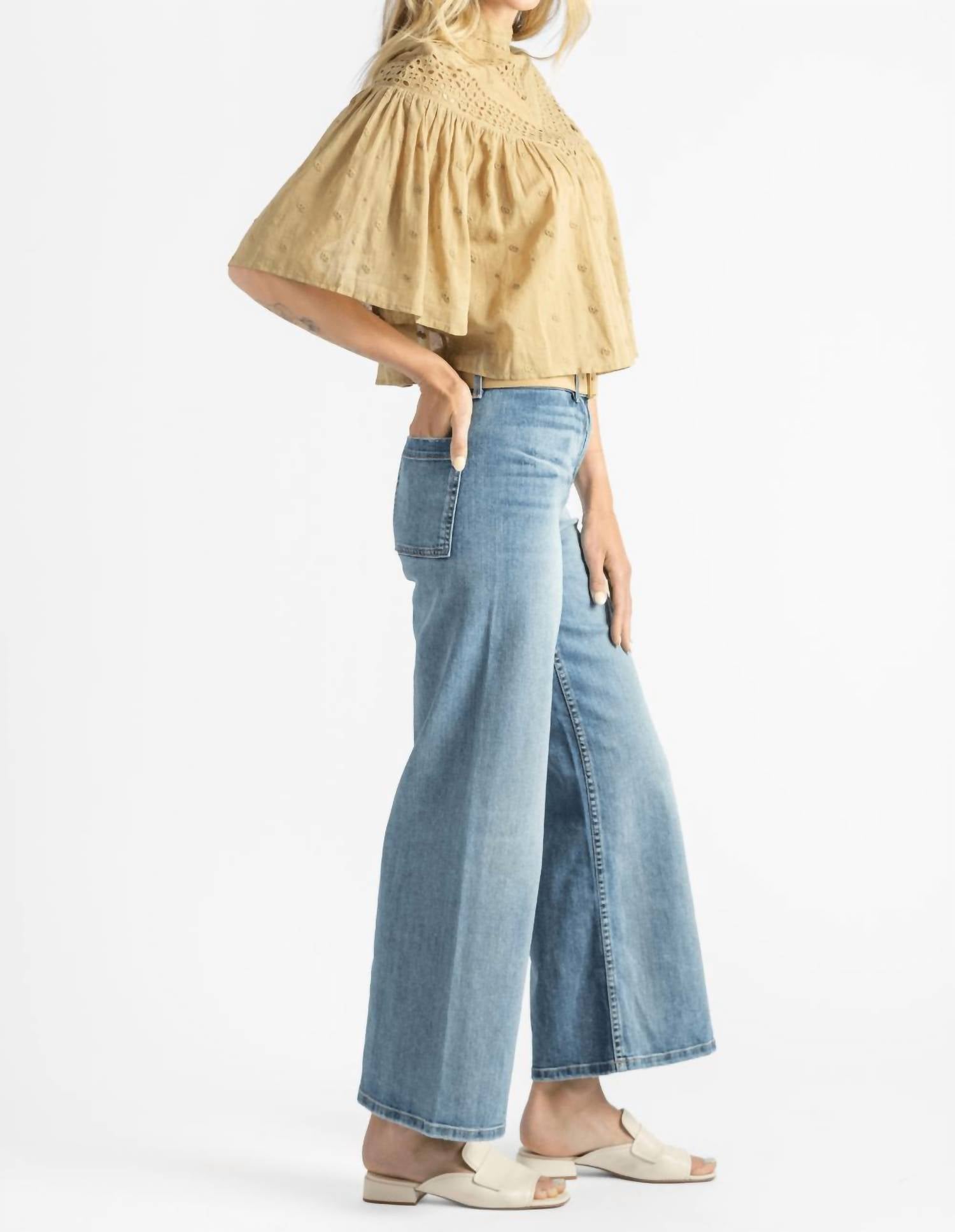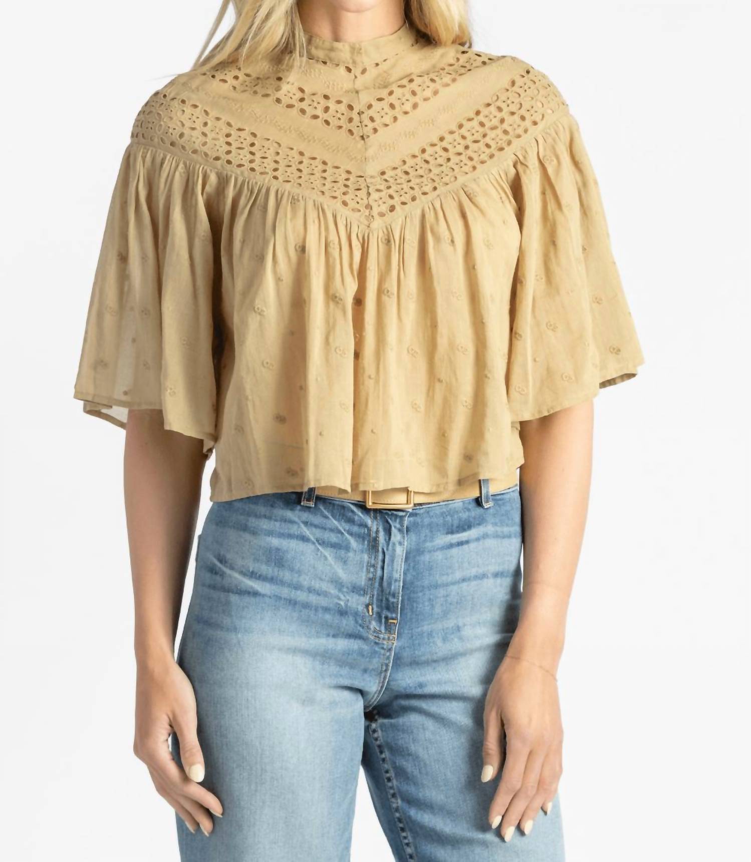 A versatile blouse that works from desk to dinner! Introducing the Women's Mikki Blouse by NILI LOTAN, crafted for the boho-chic trend in a flattering safari khaki. This short sleeve blouse is made from 100% cotton using custom Indian eyelet embroidery, adding a unique touch to your vacation wardrobe. The design includes a crewneck with a keyhole button closure at the back and light shirring at the front and back for a relaxed fit. Please note that care instructions are not specified.