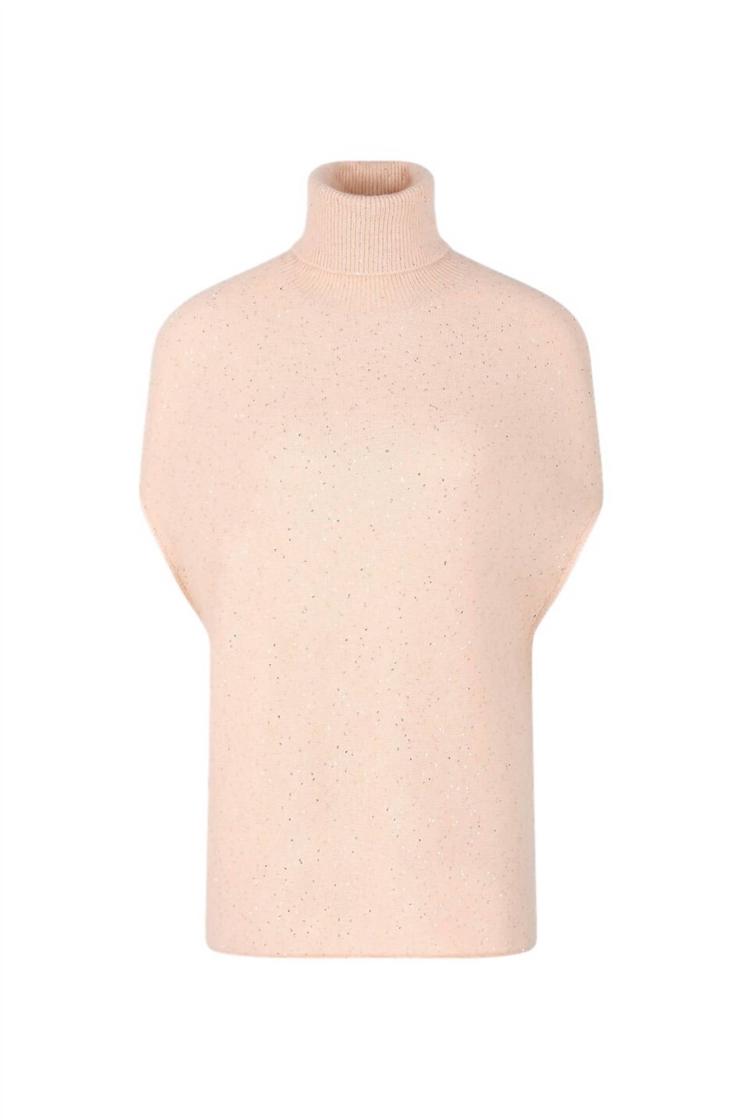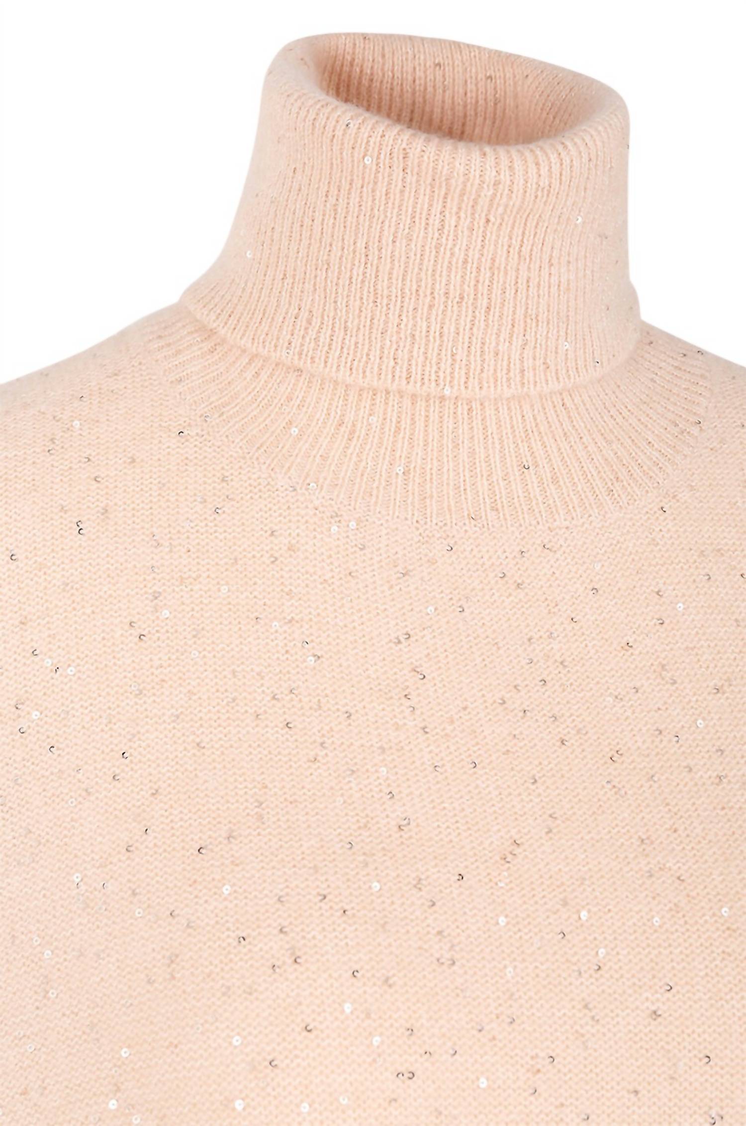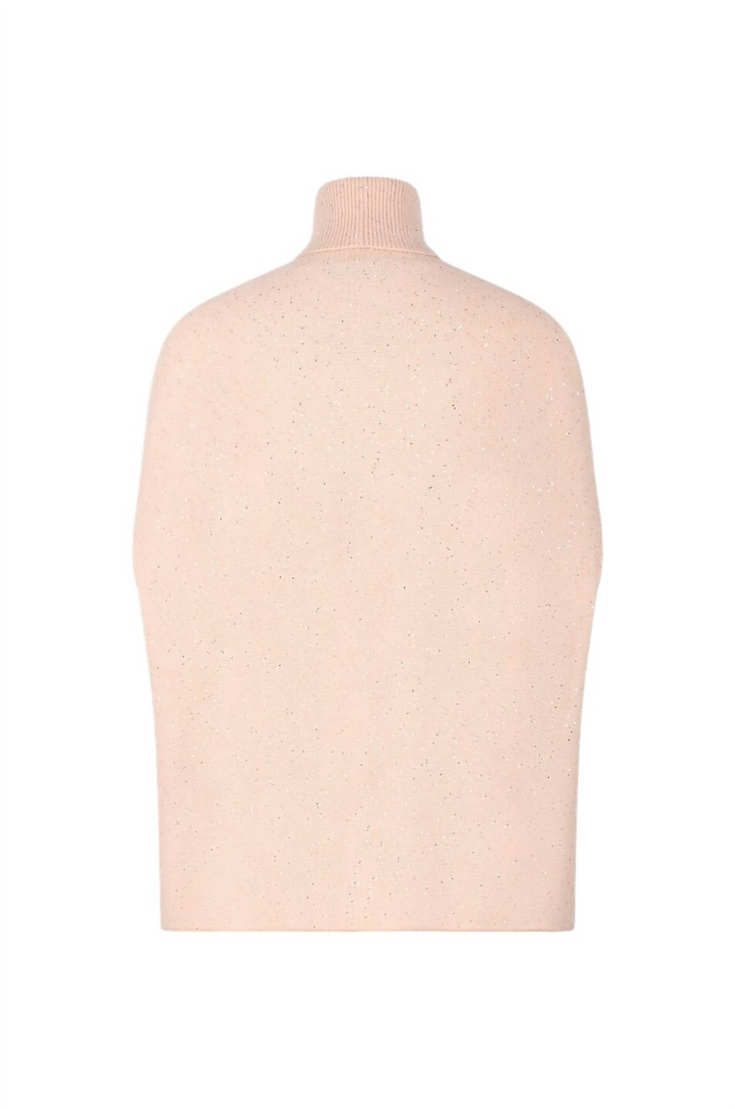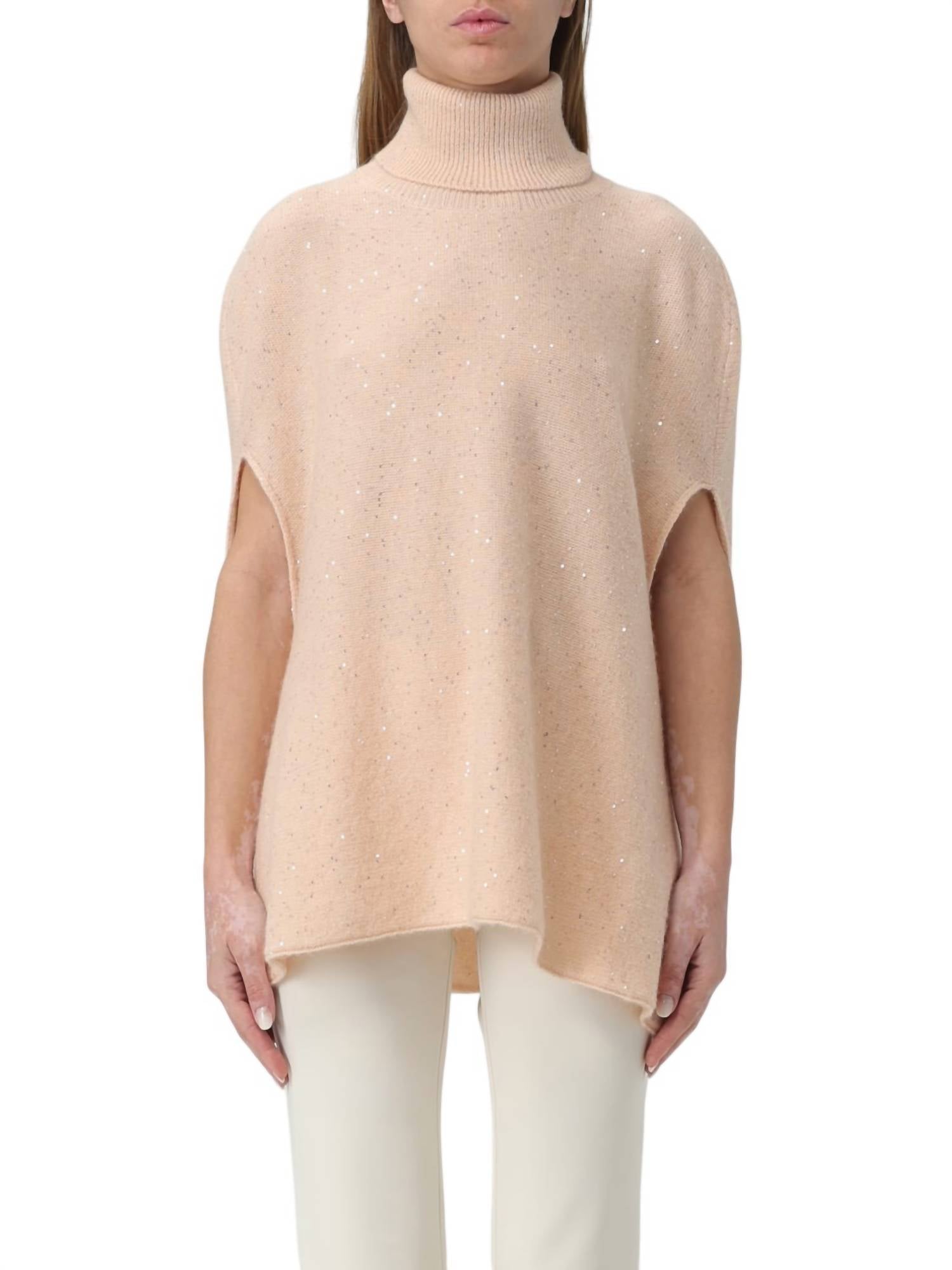 Wrap yourself in luxury with the FABIANA FILIPPI Cashmere Blend Turtleneck Sweater in Cipria. This cape jumper features a unique cape-inspired design with short sleeves and elbow openings, ensuring comfort with its loose fit. Crafted in Italy from a sumptuous blend of 48% Virgin wool, 17% Cashmere, and a touch of Polyester, it boasts a moss stitch knit adorned with tiny sparkling sequins. The turtleneck provides added warmth, while the pull-on closure enhances ease. Gentle care with hand wash is recommended to maintain its exquisite quality.