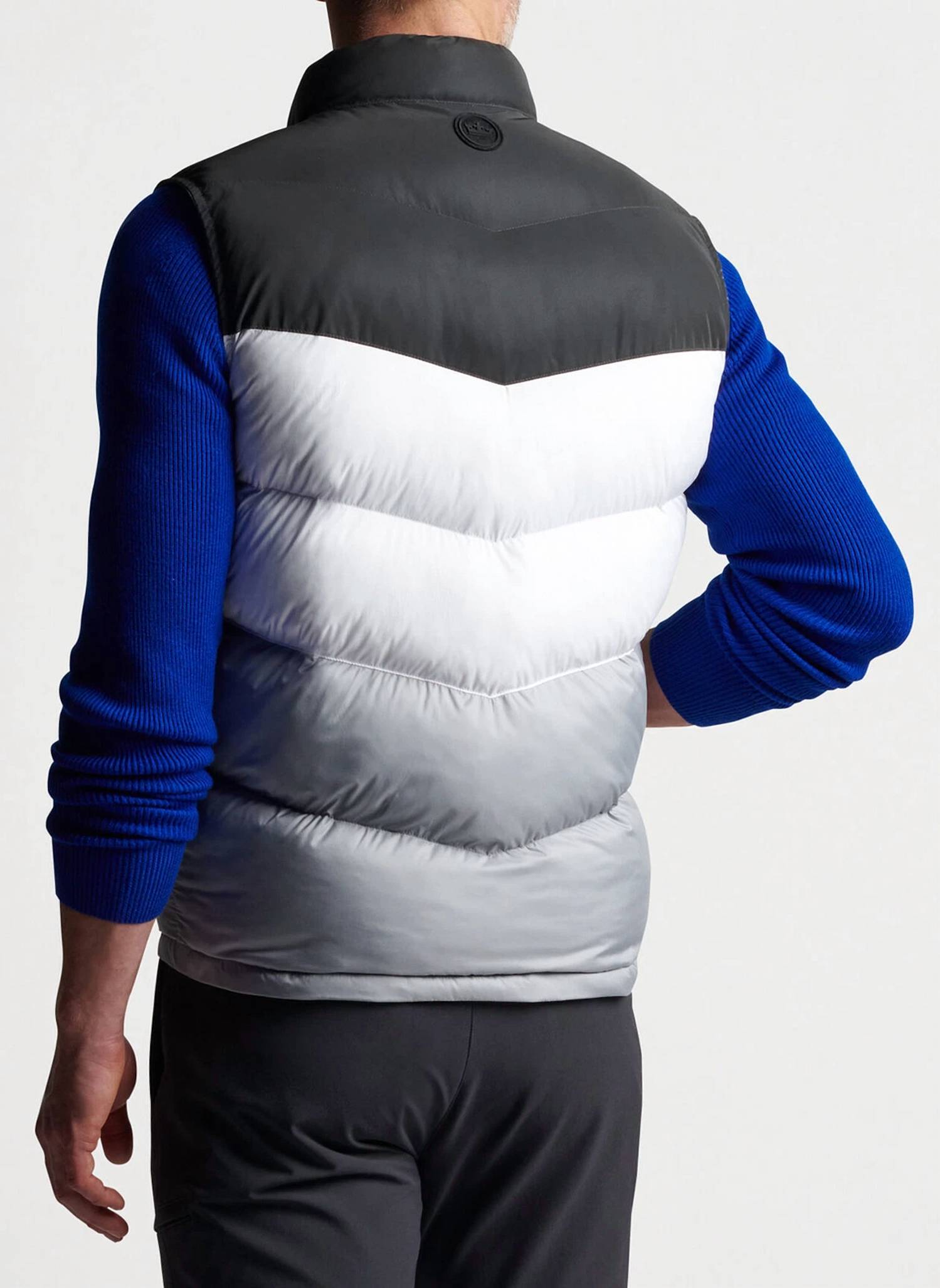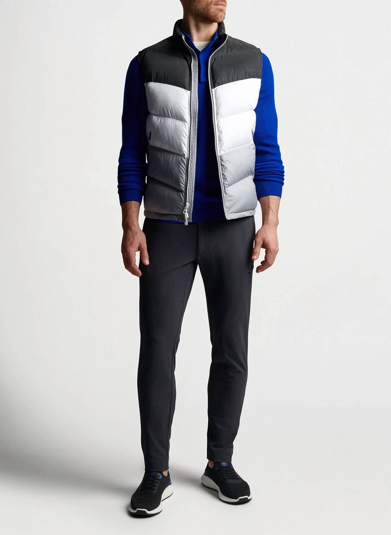 Elevate your winter style with the Après Ski Vest by Peter Millar, a striking addition to the Après-Ski collection. This men's classic fit vest, crafted from 100% polyester, features innovative microfiber with a reflective finish, providing a modern twist on vintage color-blocking designs. The vest ensures exceptional warmth through 100G blown insulation, complemented by a mockneck and white contrast zip closure with custom-molded zipper garages. Boasting a water-resistant and windproof finish, it's imported for quality and can be easily maintained with a machine wash cold and low tumble dry.