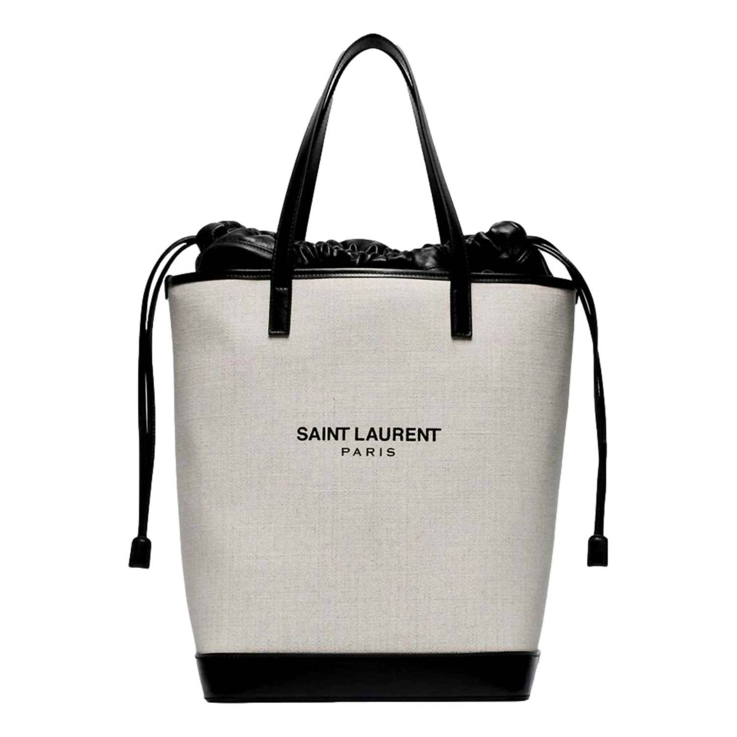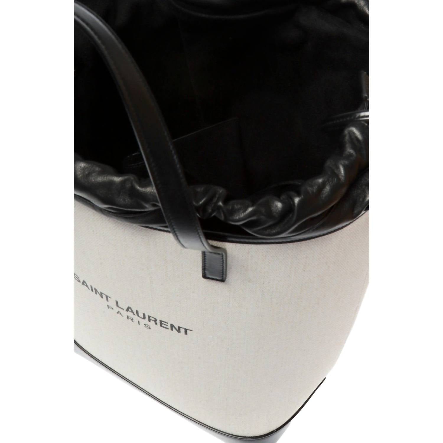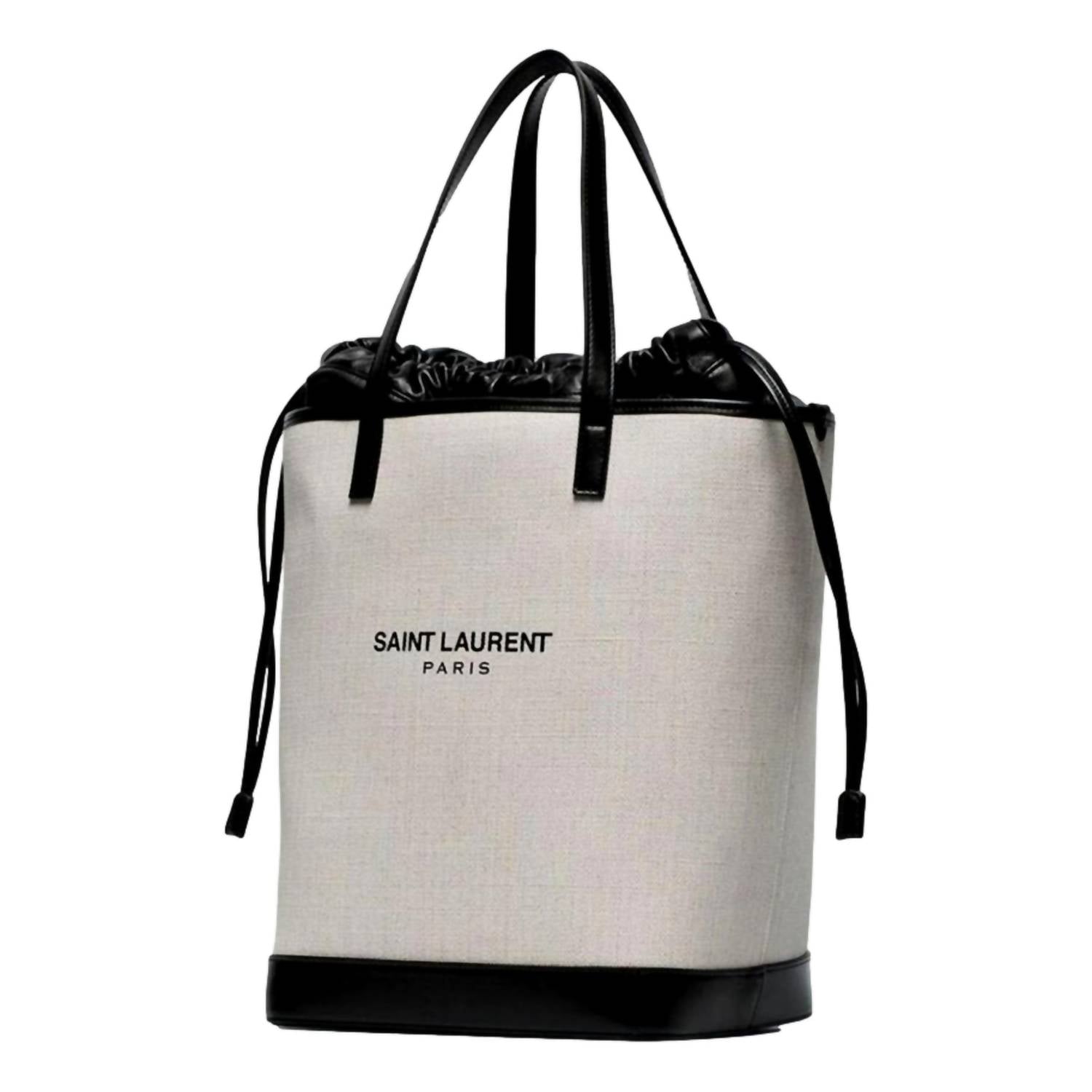 Introducing the Women's Teddy Coated Linen Drawstring Bucket Bag by Saint Laurent, a chic accessory crafted from off-white coated linen with smooth black leather details. This stylish shoulder bag boasts a printed Saint Laurent Paris logo, offering an effortlessly distinctive look. The design includes a removable black leather drawstring insert with a suede interior and pouch, along with double flat top handles with an 8" drop for convenient carrying. Measuring 10" x 7.5" x 13" (LWH), it is perfectly sized for everyday use, whether you're by the pool or heading to the beach. Made in Italy, this bag includes authenticity cards and a Saint Laurent dust bag.