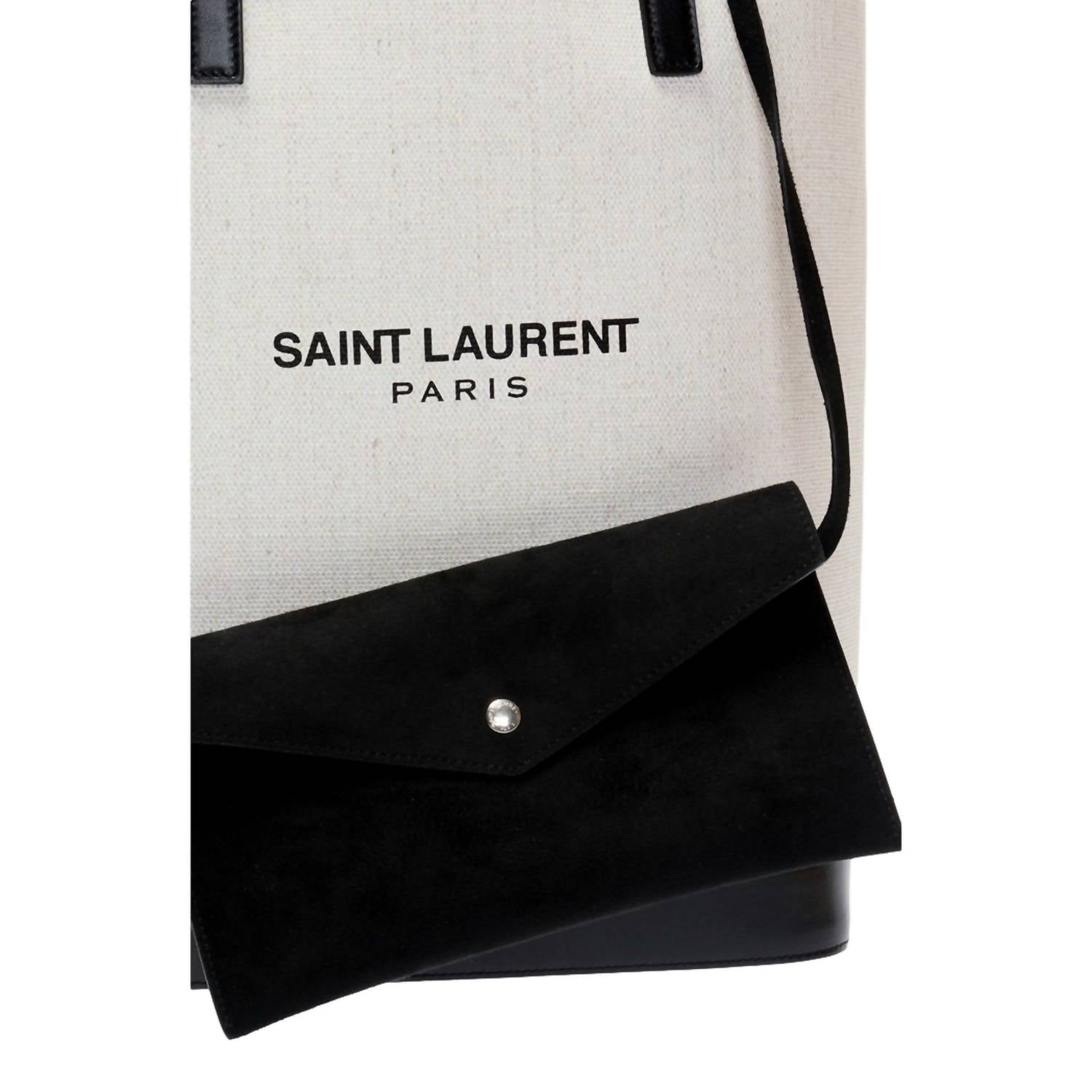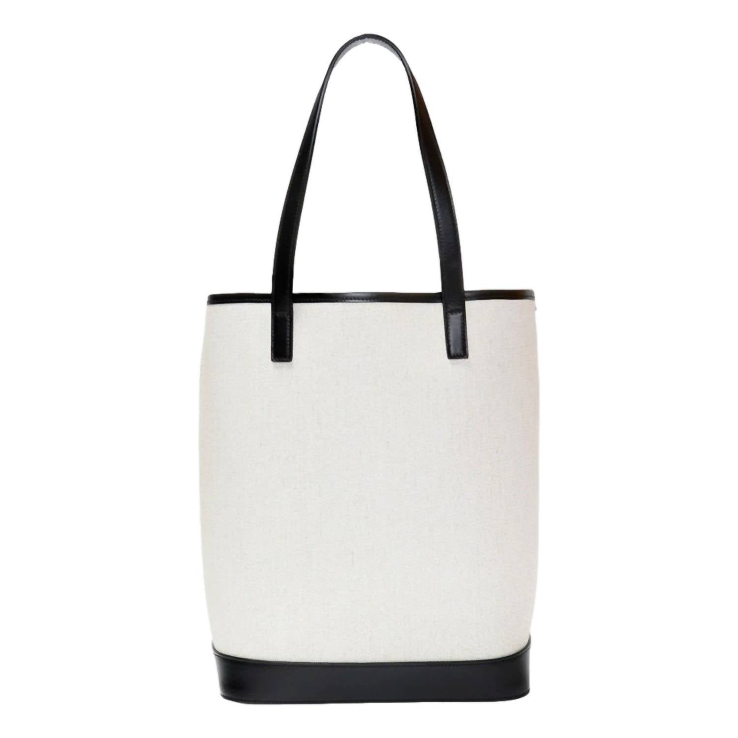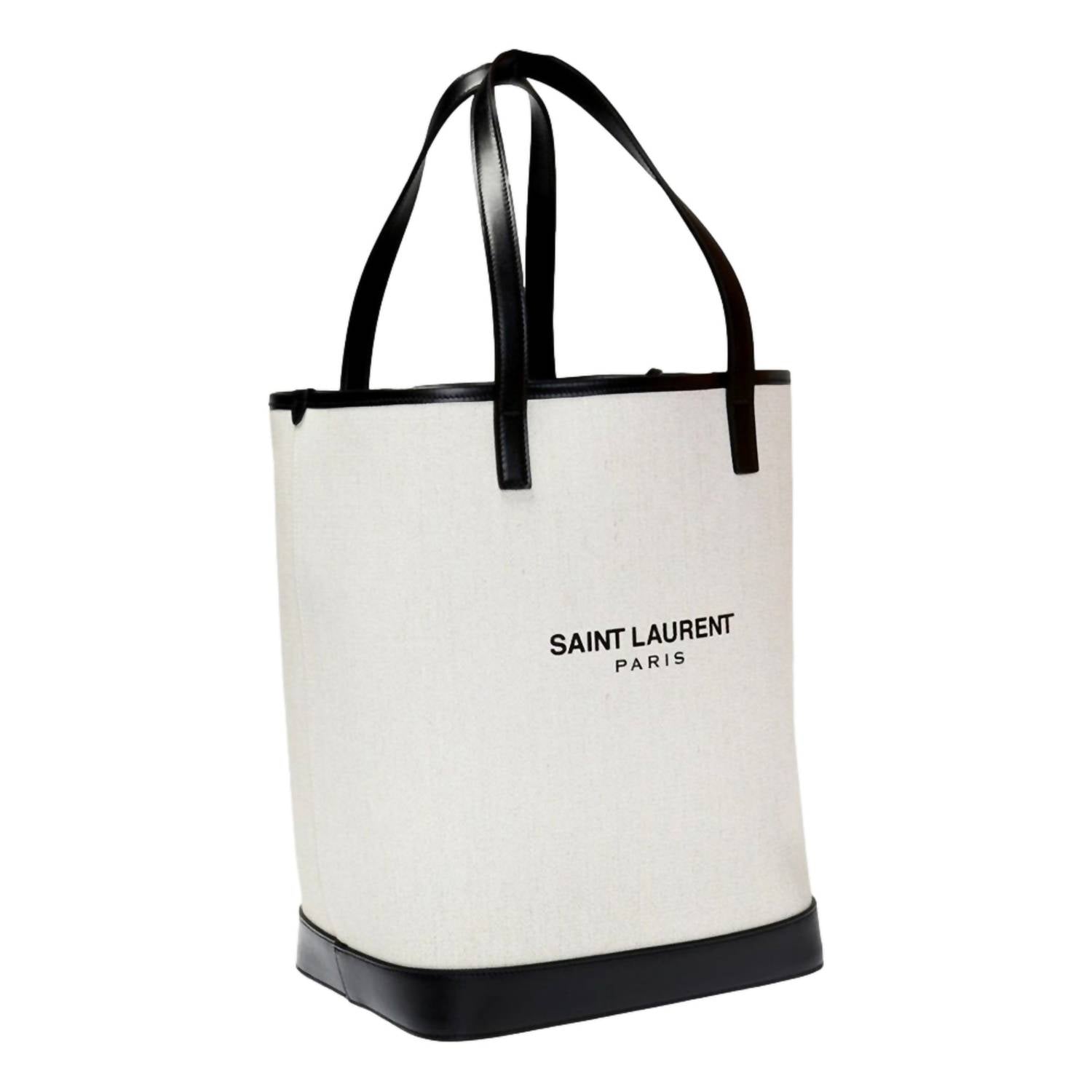 Introducing the Women's Teddy Coated Linen Drawstring Bucket Bag by Saint Laurent, a chic accessory crafted from off-white coated linen with smooth black leather details. This stylish shoulder bag boasts a printed Saint Laurent Paris logo, offering an effortlessly distinctive look. The design includes a removable black leather drawstring insert with a suede interior and pouch, along with double flat top handles with an 8" drop for convenient carrying. Measuring 10" x 7.5" x 13" (LWH), it is perfectly sized for everyday use, whether you're by the pool or heading to the beach. Made in Italy, this bag includes authenticity cards and a Saint Laurent dust bag.