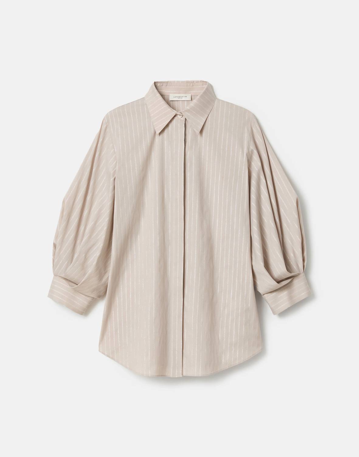 Perfectly tailored and soft to the touch. A feminine play on shape and proportion, this clean-lined button shirt combines a contoured slim design with voluminous three-quarter sleeves tempered by button cuffs. It's shaped through precise darting in shimmer-striped Italian cotton with a hint stretch for exceptional fit.
