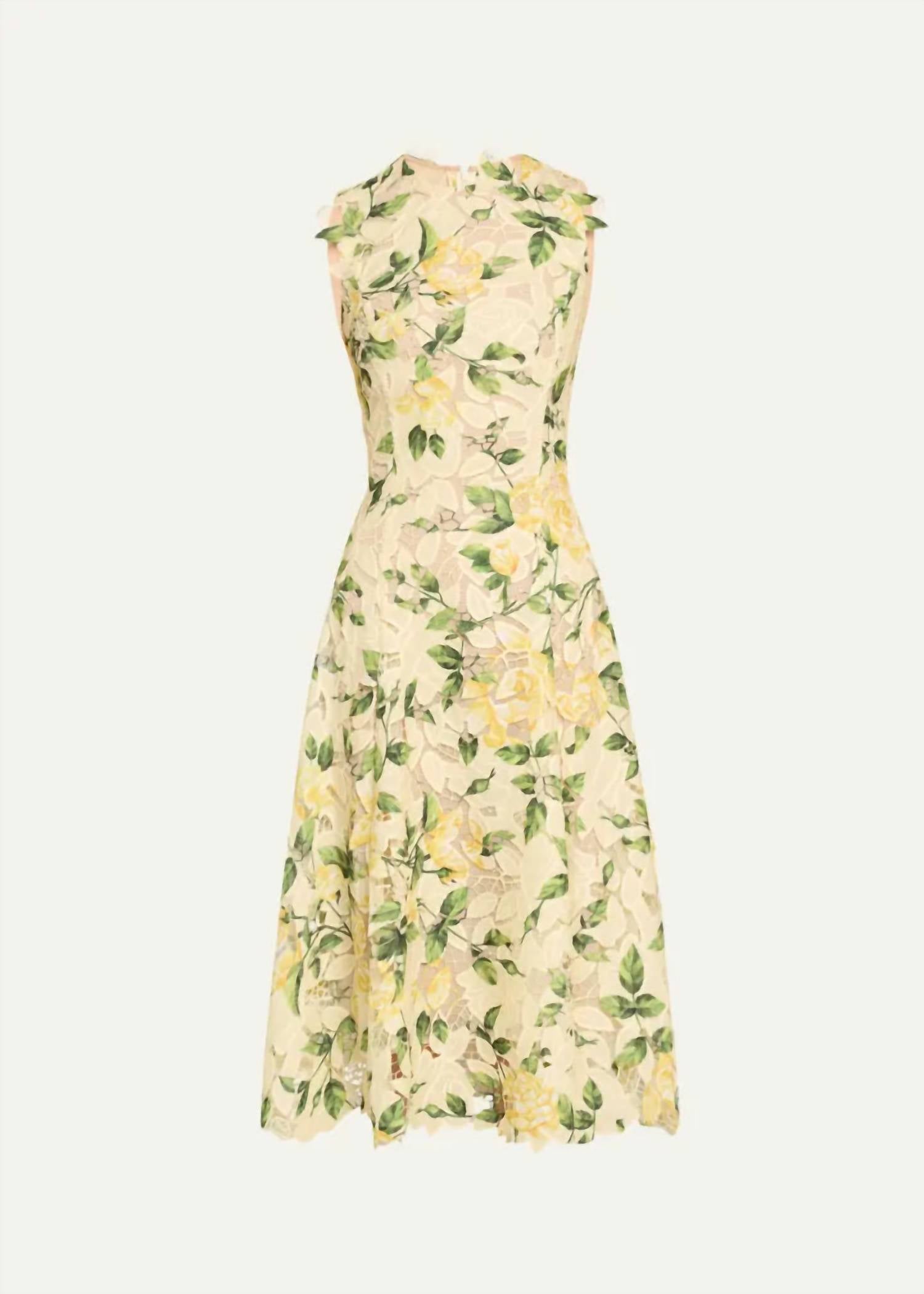 A midi dress so versatile, your options for wearing it are endless. Embrace elegance with the Sleeveless Printed Garden Rose Guipure Dress by Oscar de la Renta, a sophisticated choice for festive occasions. This sleeveless dress, designed with an A-line silhouette, falls gracefully below the knee and features a high neckline, perfect for a polished look. Crafted from 100% polyester with a luxurious 100% silk lining, it ensures comfort and style. The floral pattern in yellow tones adds a touch of charm, while the concealed back zipper offers easy wearability. Care: Hand wash and line dry recommended.