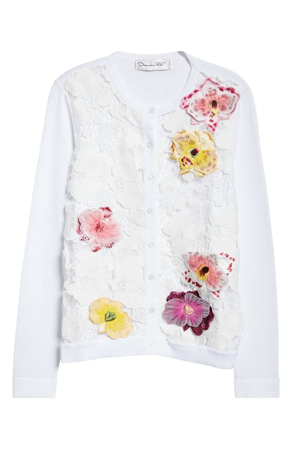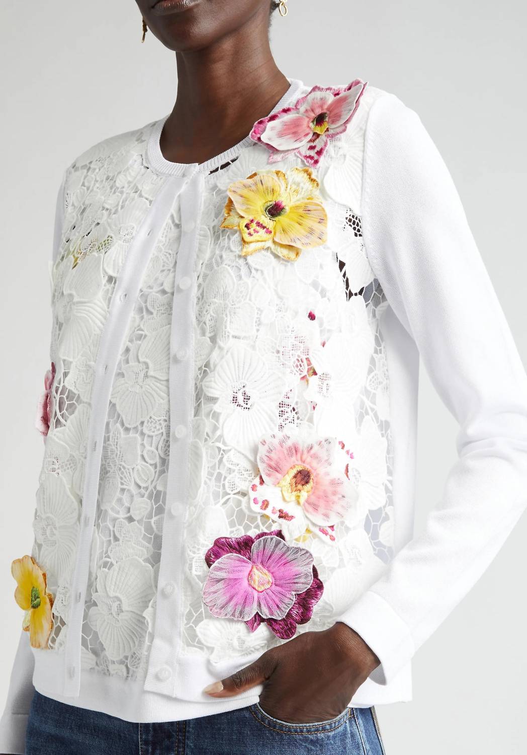 Throw this adorable cardigan over any cami or tank top. Experience the exquisite craftsmanship of the Oscar de la Renta Long Sleeve Orchid Threadwork Embroidered Lace Cardigan in White Multi. This finely knit piece, 24 inches in length, showcases long sleeves adorned with vibrant orchid appliqués and guipure lace panels. Made in Italy, the cardigan is composed of 57% cotton and 43% viscose with 100% polyester contrast, featuring a classic crewneck and elegant ribbed cuffs and hem. Closure: Front button closure. Care: Dry clean only, ensuring your garment maintains its luxurious quality.