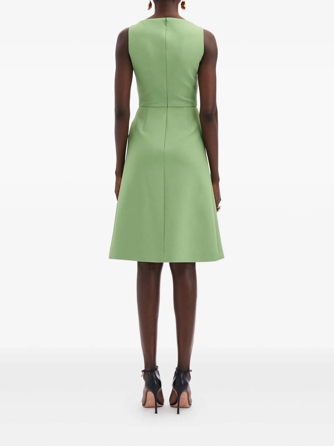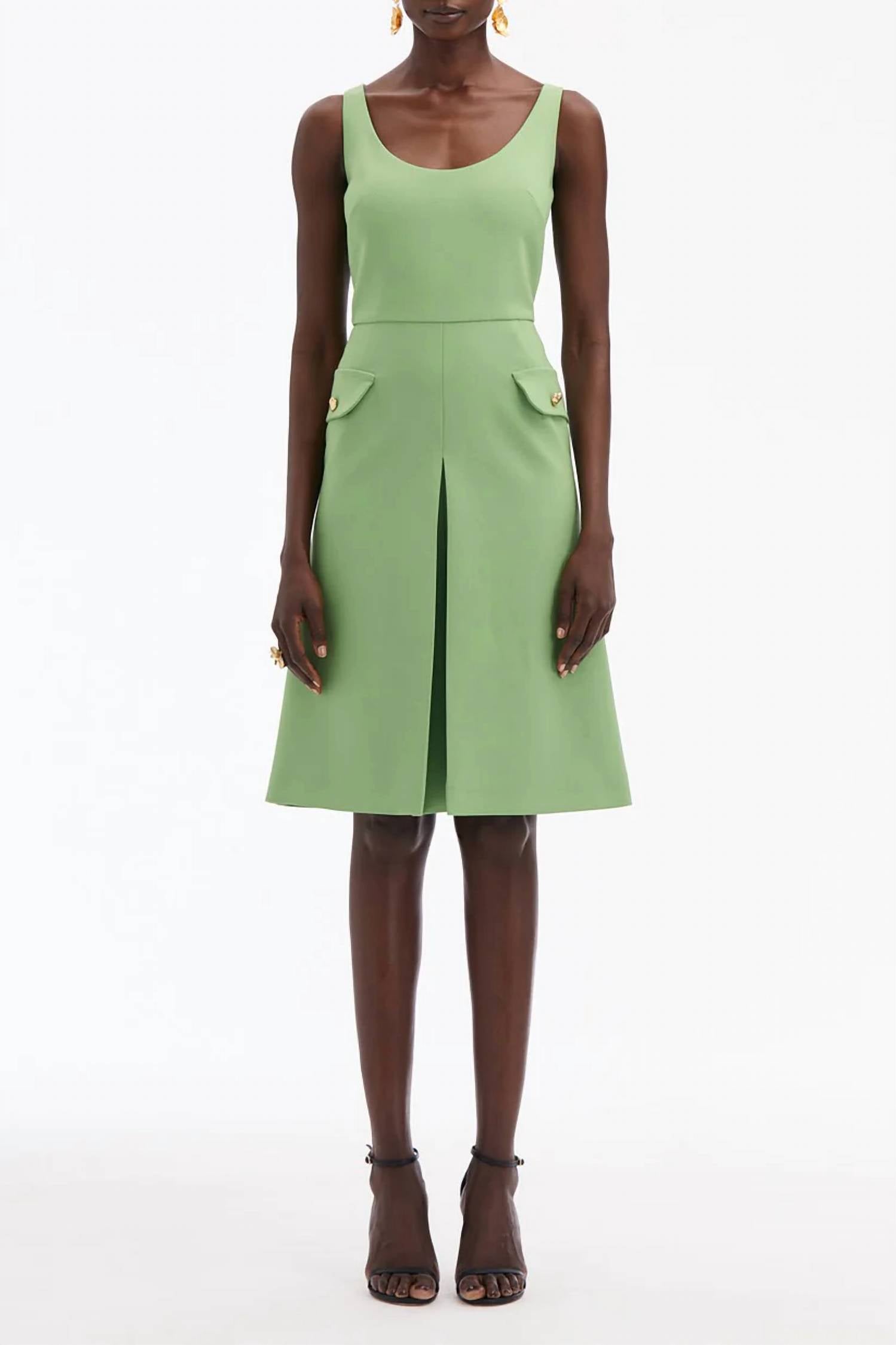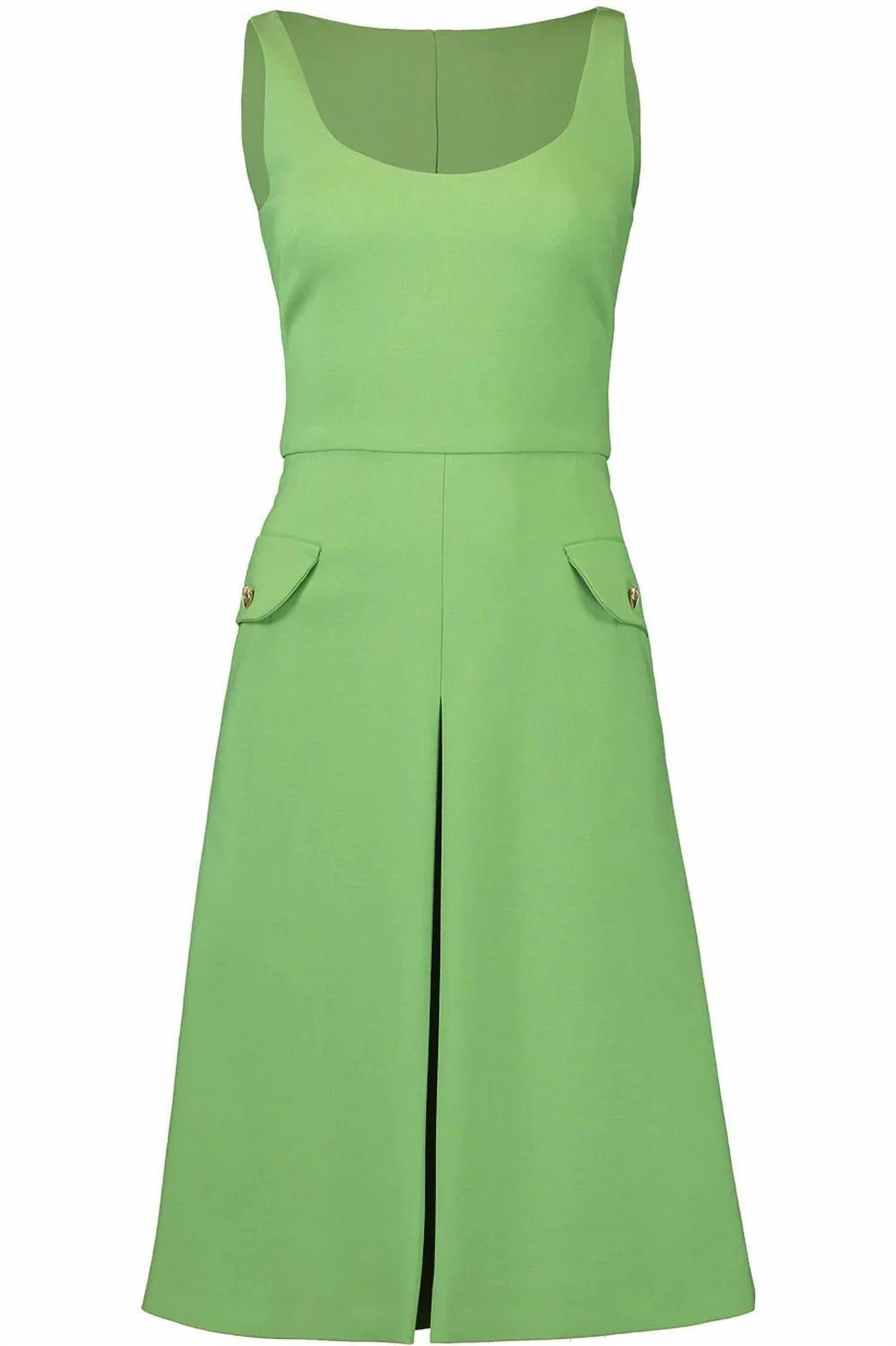 The kind of easy and flattering dress you'll be reaching for all season long. Experience the exquisite elegance of the Sleeveless Inverted Button Dress by Oscar de la Renta in a sophisticated olivine hue, perfect for cocktail parties. This mini, A-line dress features flap pockets and gold-tone hardware for a minimalist, yet luxurious appeal. Expertly crafted in Italy from a high-quality wool blend consisting of 94% Virgin Wool, 5% Elastane, and 1% Polyamide, with a 100% Silk lining, it offers comfort and style. The dress is designed with a rear zip closure and a flattering scoop neckline, and should be dry cleaned only to maintain its pristine condition.